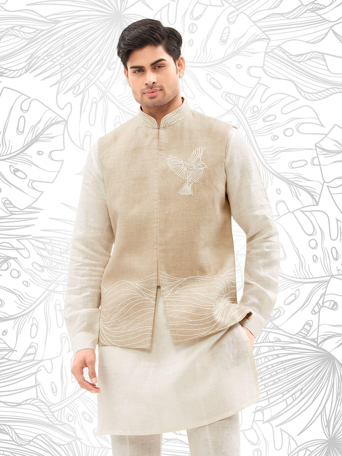 The comfortable cotton fabric and soft cream hue create a stunning waistcoat set, ideal for celebratory events. Includes matching bottom.