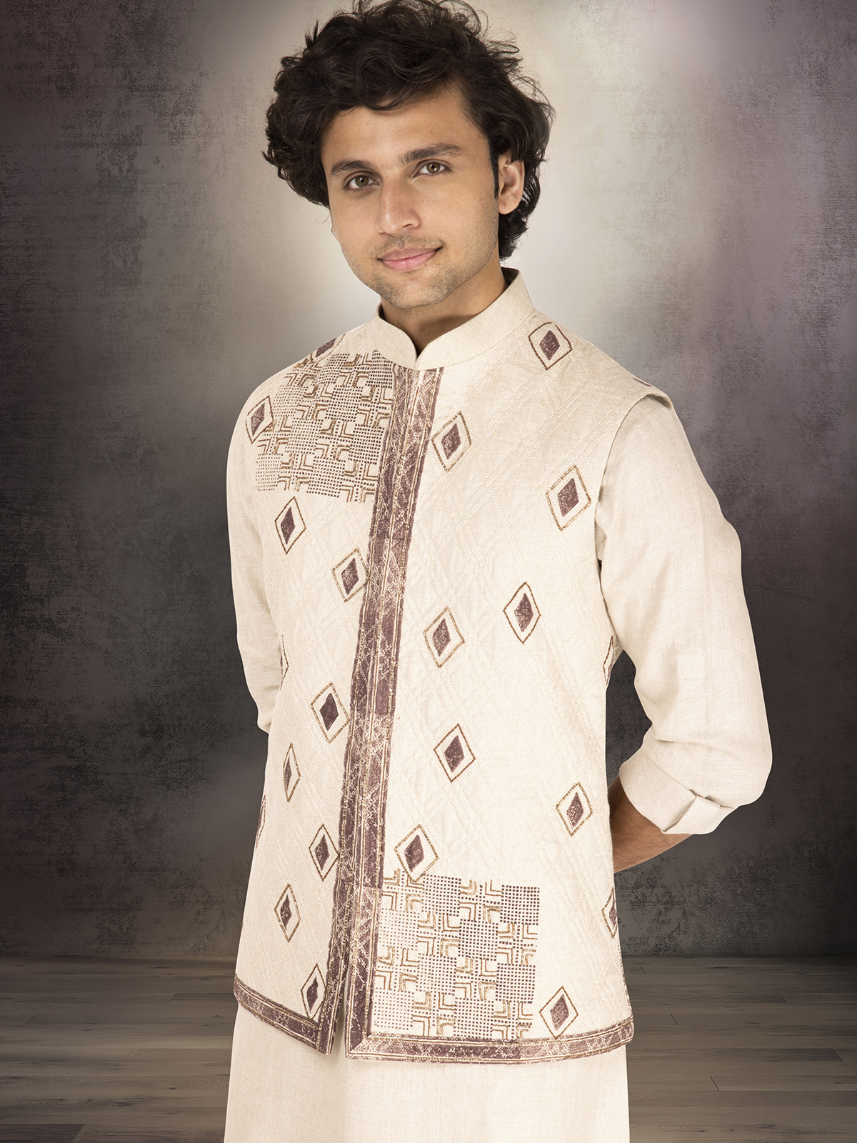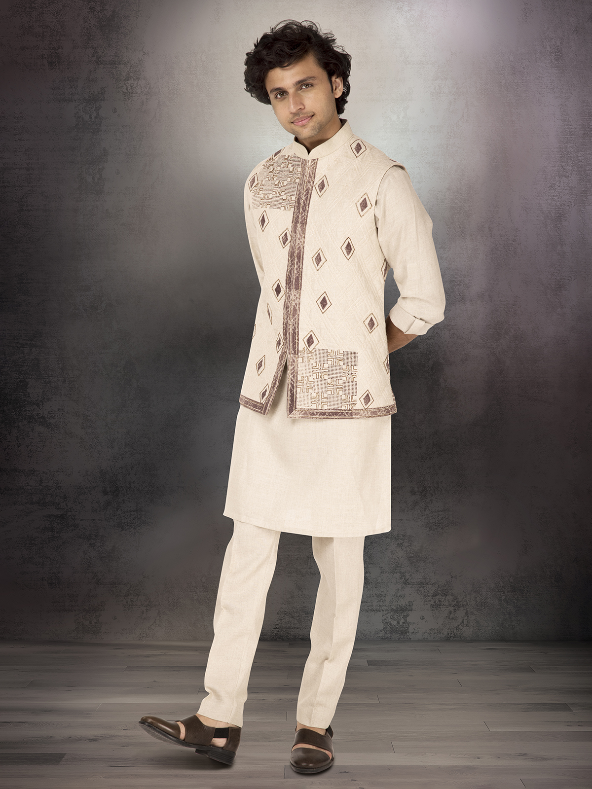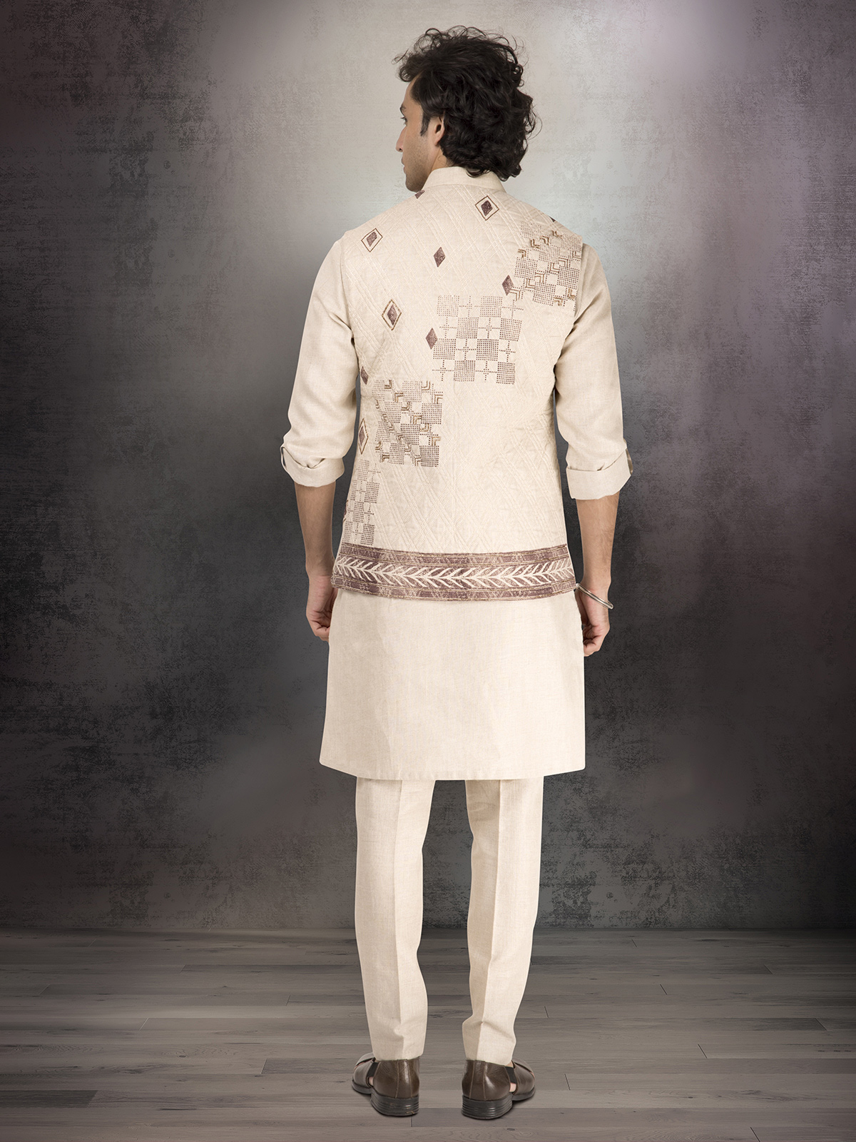 Tailored in pure cream linen, this waistcoat set showcases artistic block prints enriched with embroidery work. Its airy fabric and textured finish bring freshness to weddings and festive moments. Teamed with a pant, it unites craftsmanship and easy sophistication.
