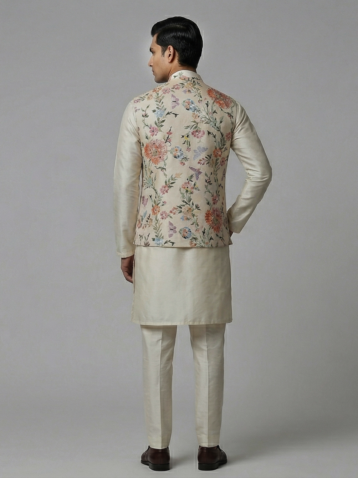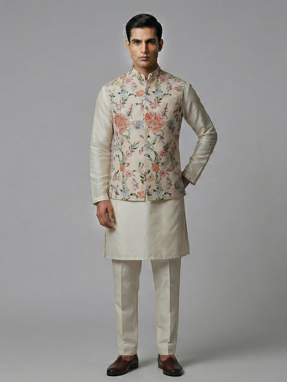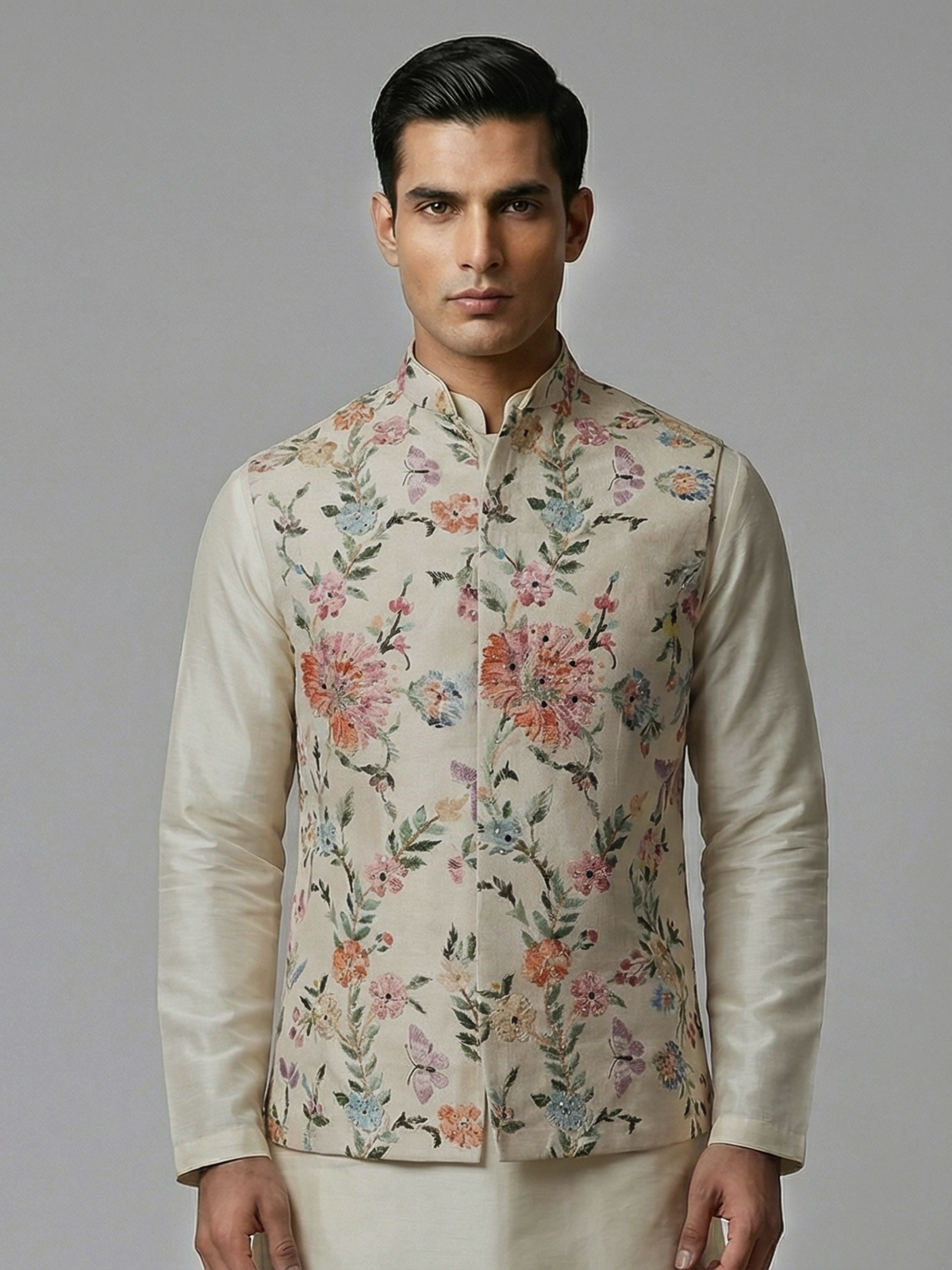 Elegant cream tones highlight the beauty of this silk waistcoat set crafted for timeless occasions. Adorned with floral prints enhanced by mirror and stone work. It radiates subtle brilliance and festive charm. The chinese collar adds a structured touch. While the fabric ensures comfort. Paired with a kurta and pants. This ensemble creates a sophisticated and graceful ethnic statement for weddings and receptions.