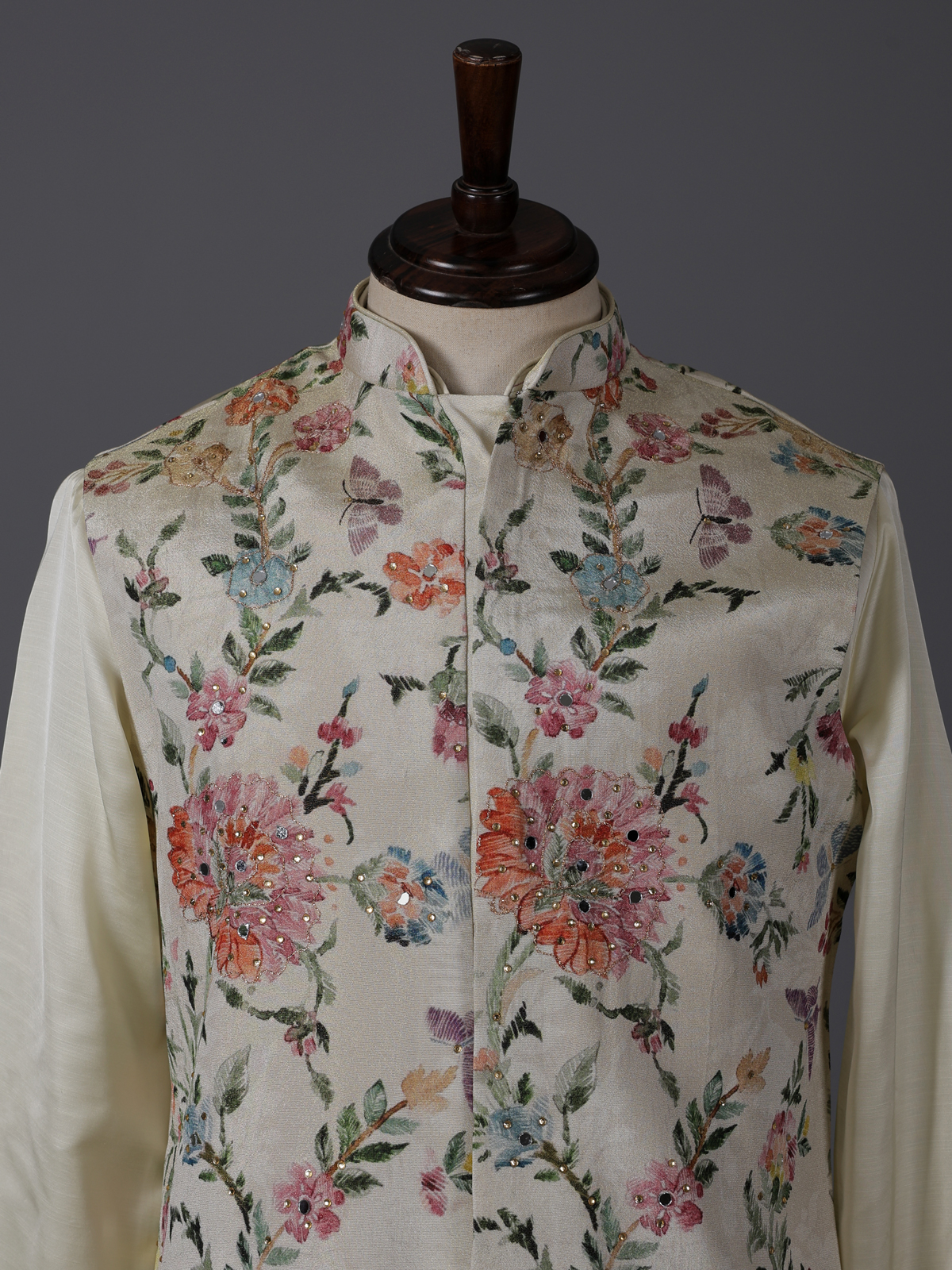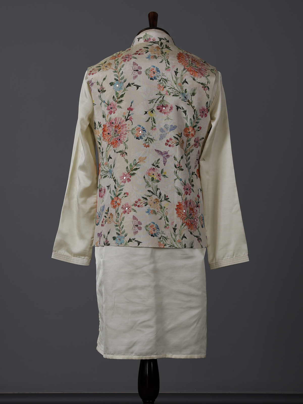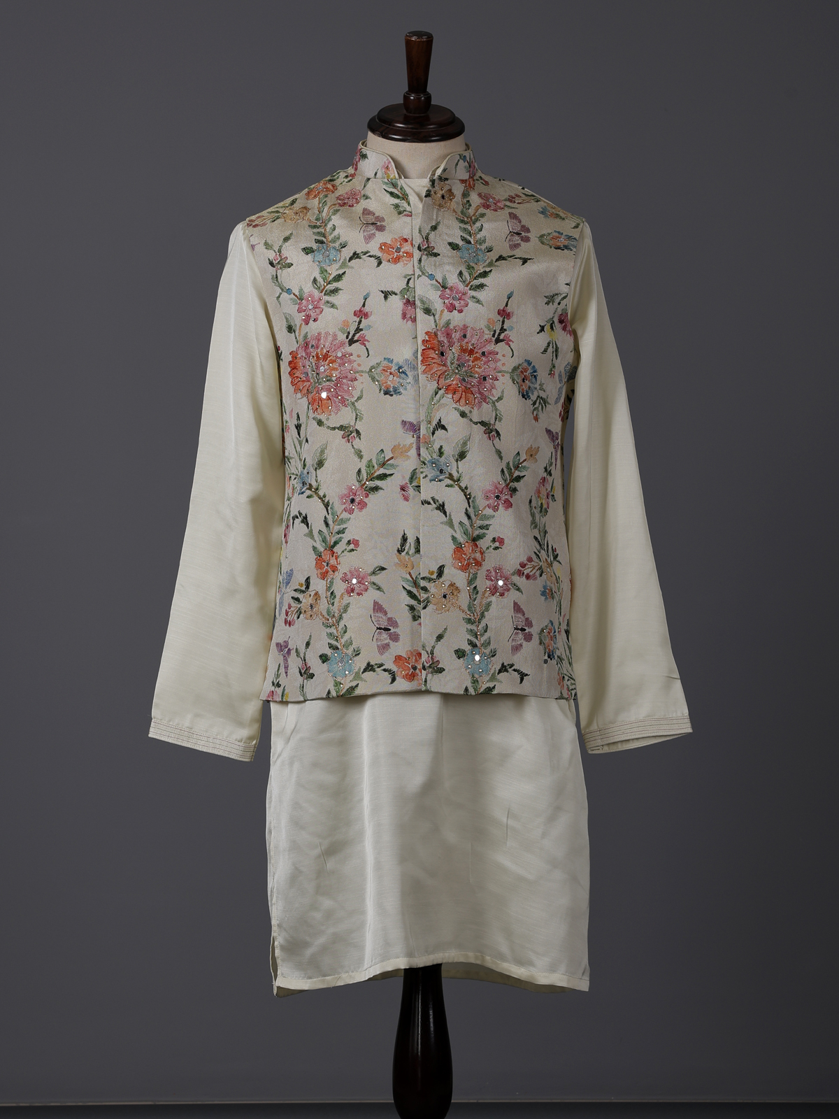 Cream Silk Floral Mirror Work Festive Waistcoat Set