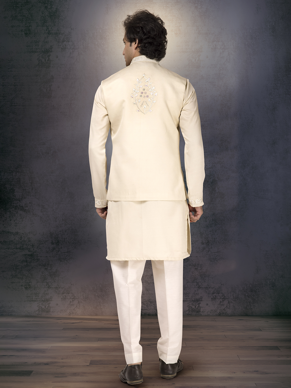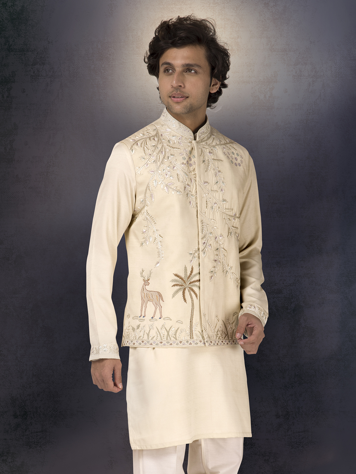 A portrait of quiet luxury, this cream silk waistcoat set gleams with fine resham embroidery. The delicate detailing and soothing hue lend it graceful poise, perfect for receptions or festive gatherings. Styled with a pant, it symbolizes refined charm.