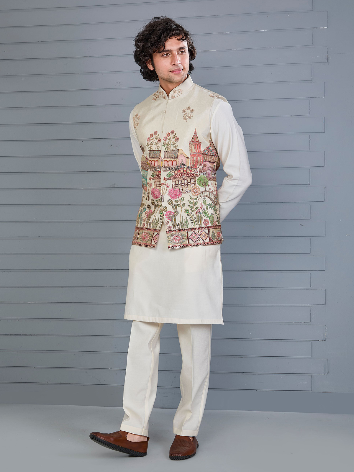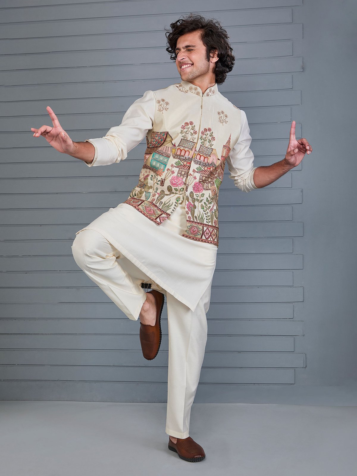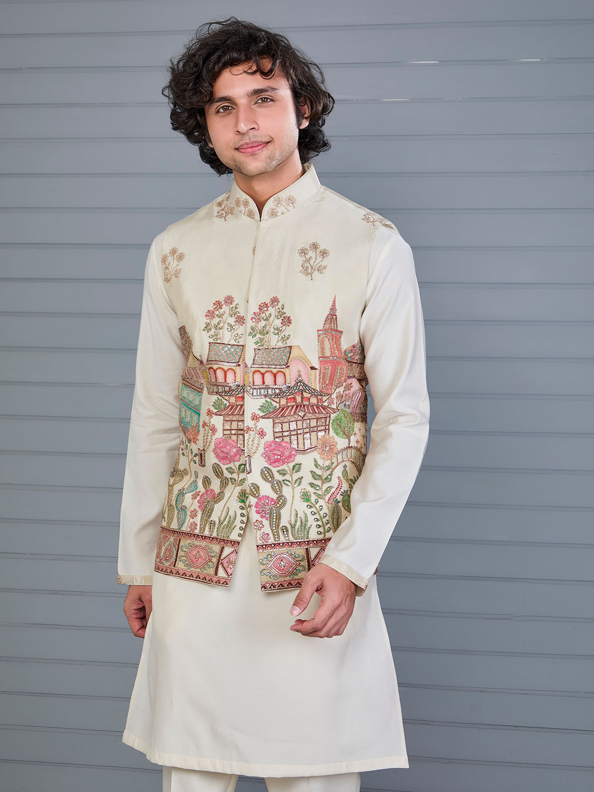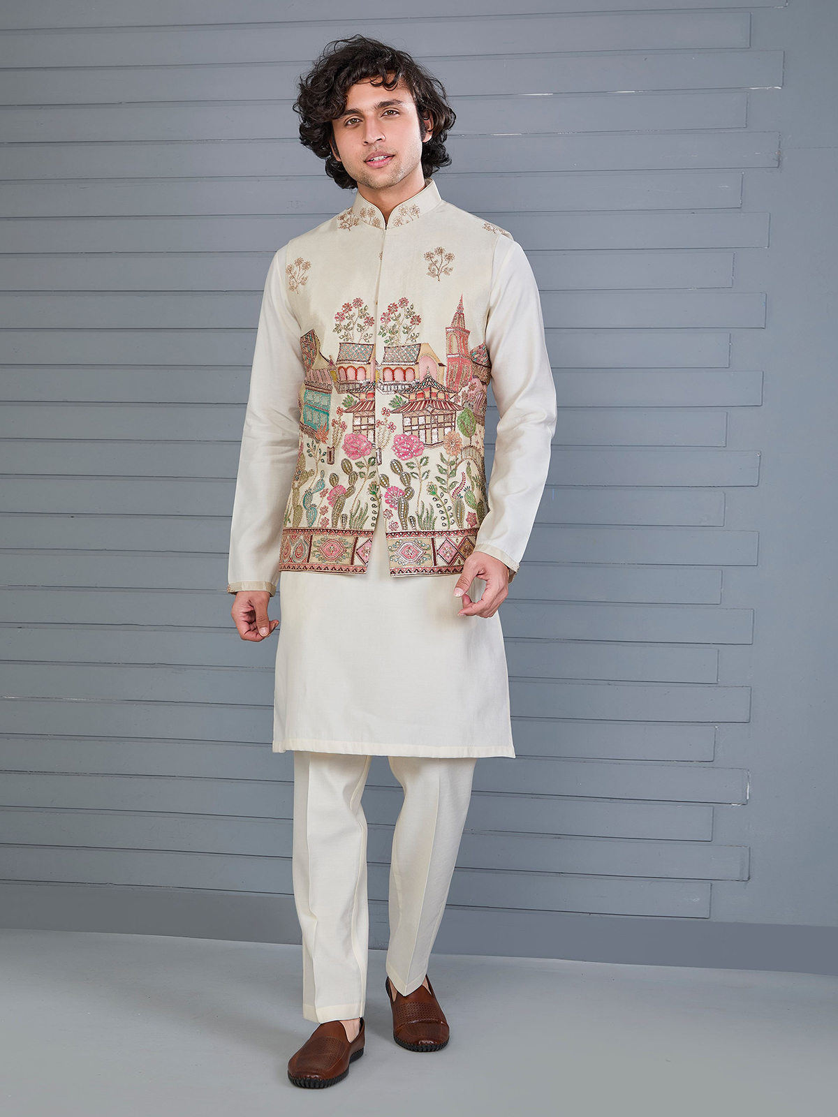 Soft cream silk waistcoat enhanced with refined resham and sequin embellishments. Finished with a Chinese collar and coordinated pant, this ensemble brings timeless elegance to weddings and celebratory gatherings.