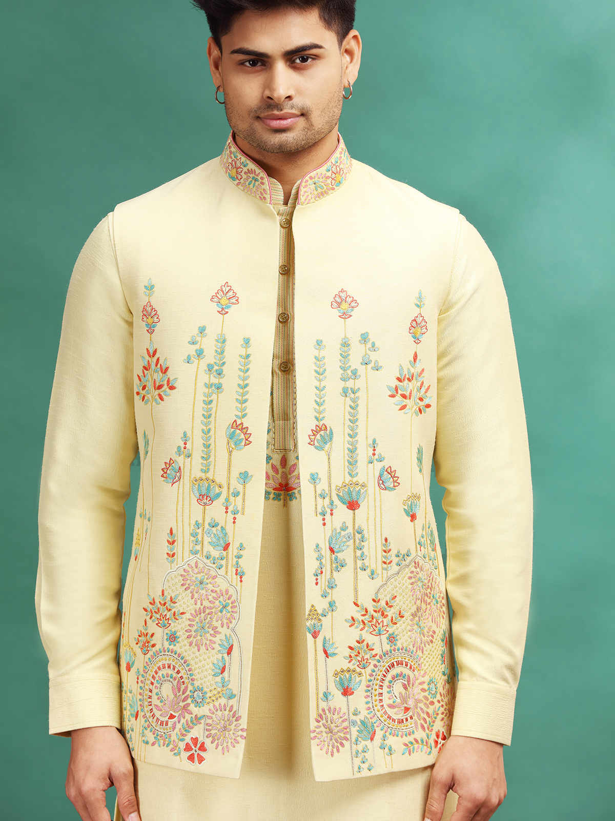 Grace unfolds in a cream silk waistcoat set adorned with intricate embroidery that glistens like morning dew. The sleeveless silhouette and tailored chinese collar exude modern nobility. Finished with fitted pants, it evokes an aura of celebration and quiet luxury.