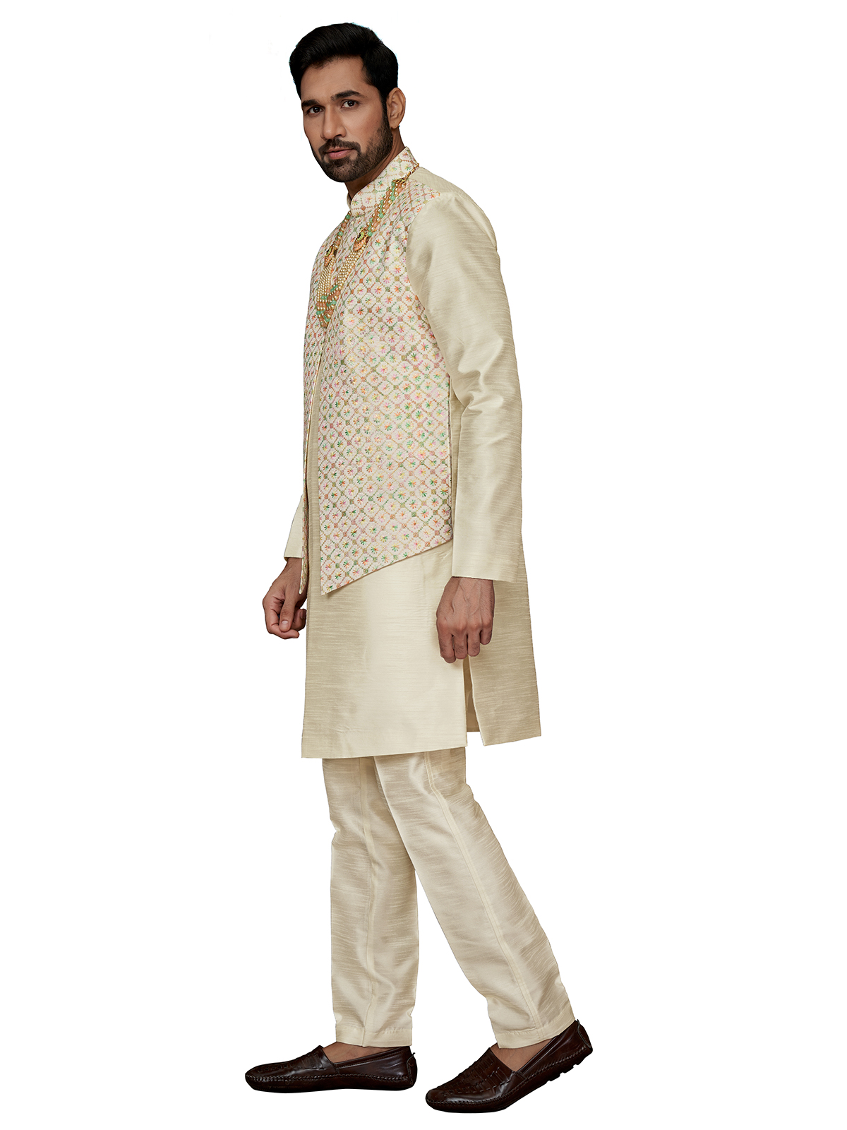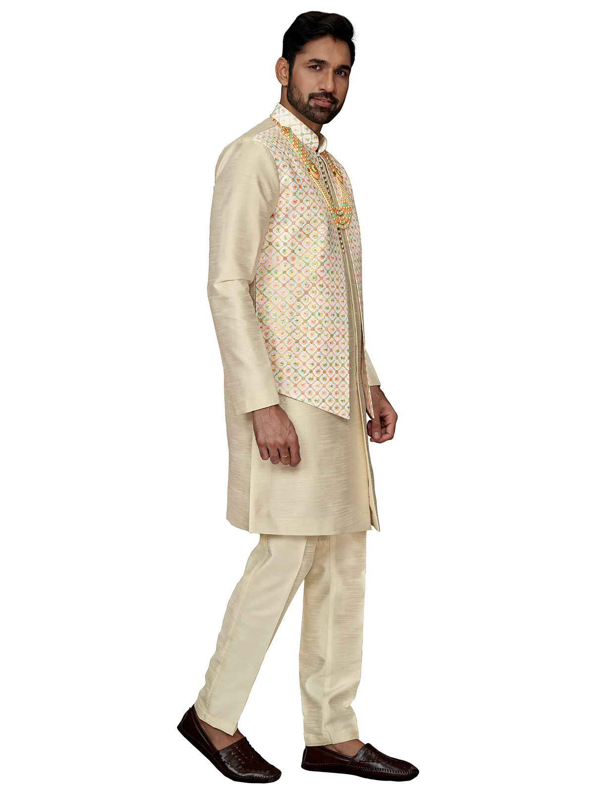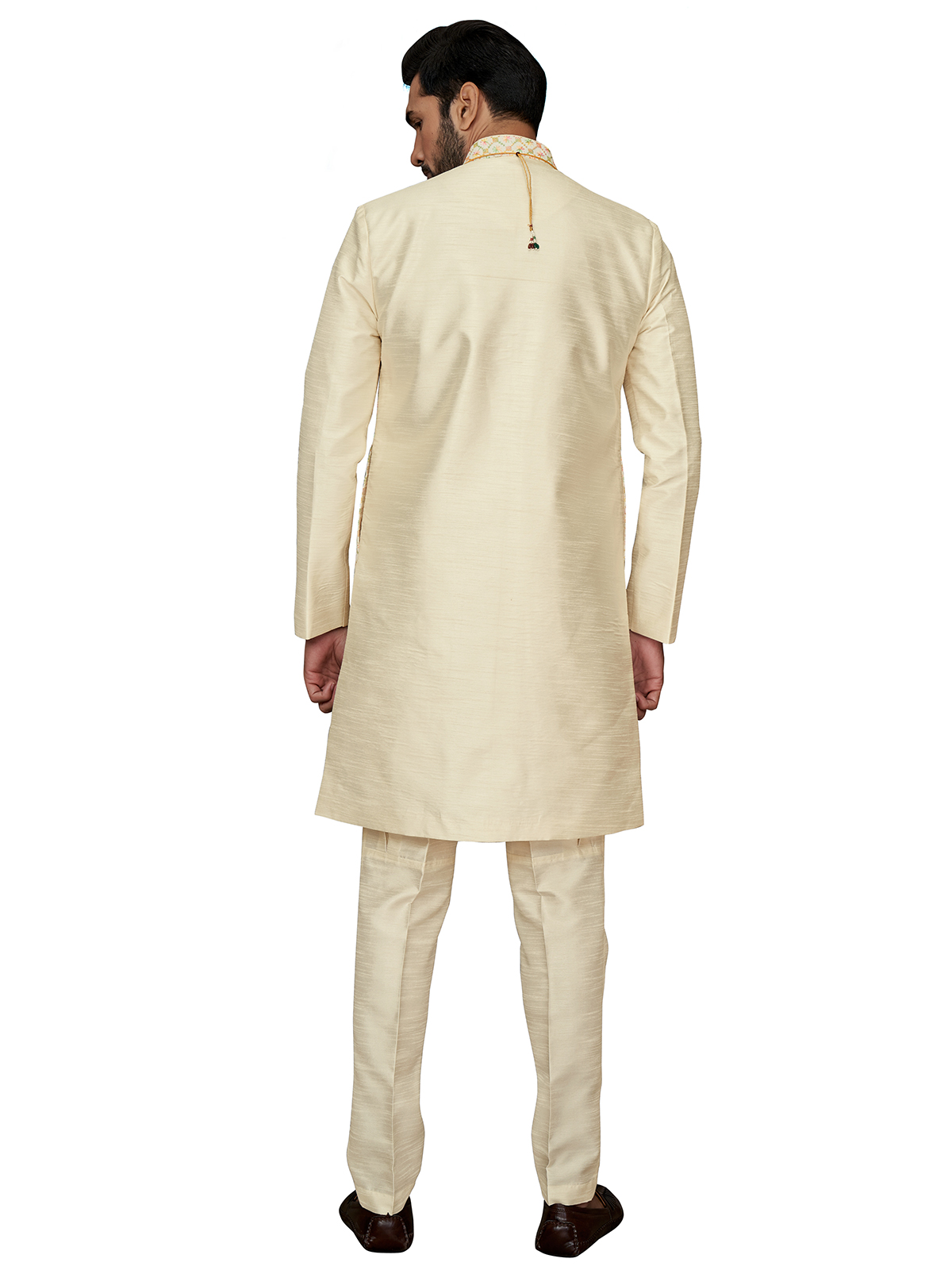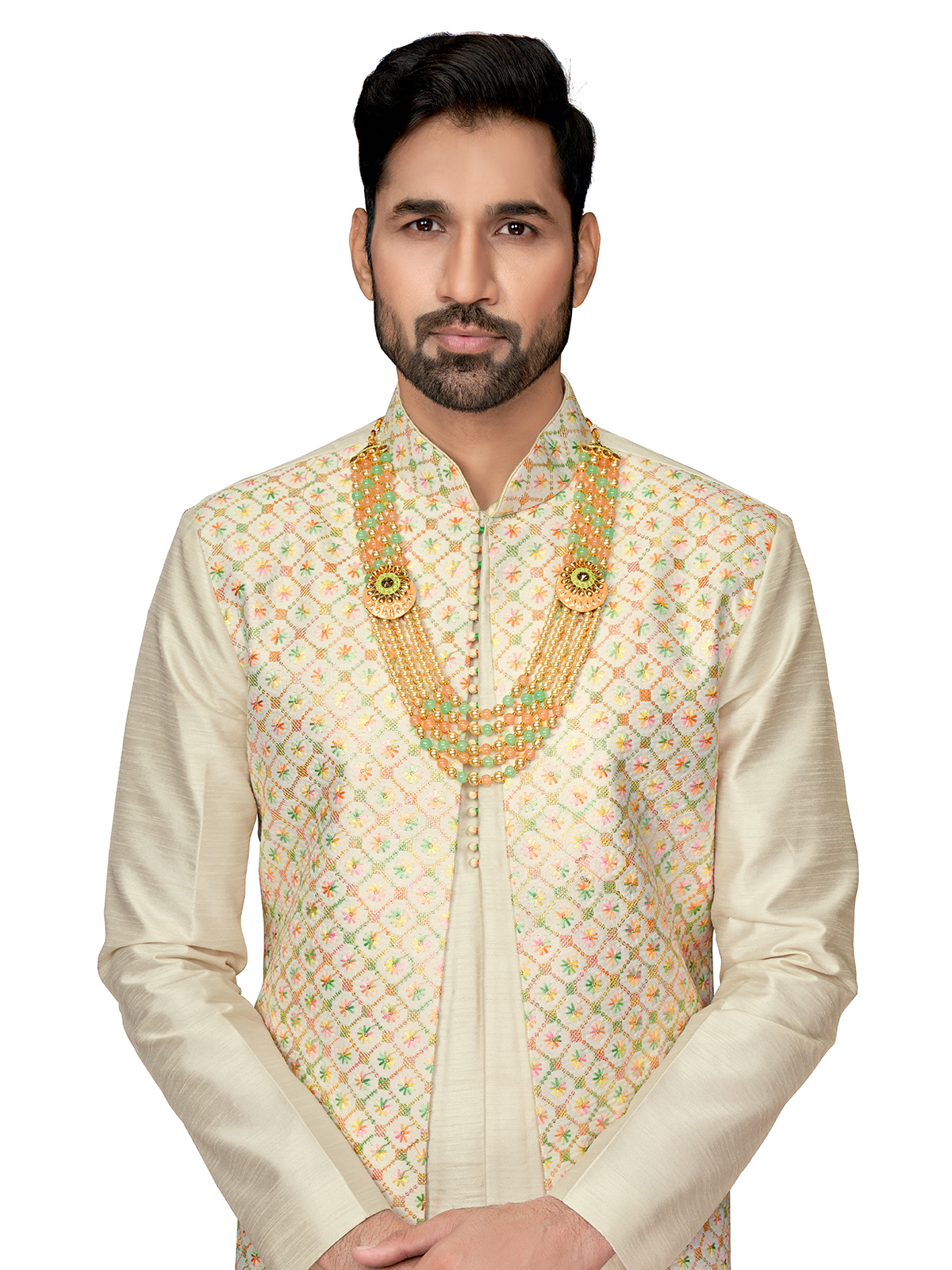 Add an elegant touch to your wedding attire with this cream silk waistcoat set. The detailed embroidery and sequins work on the waistcoat elevate the classic design, while the mandarin collar and full sleeves add sophistication. Complete with a bottom.