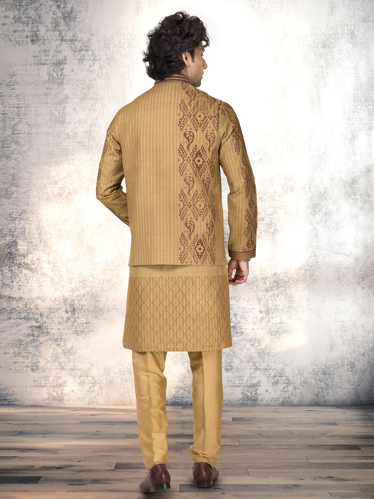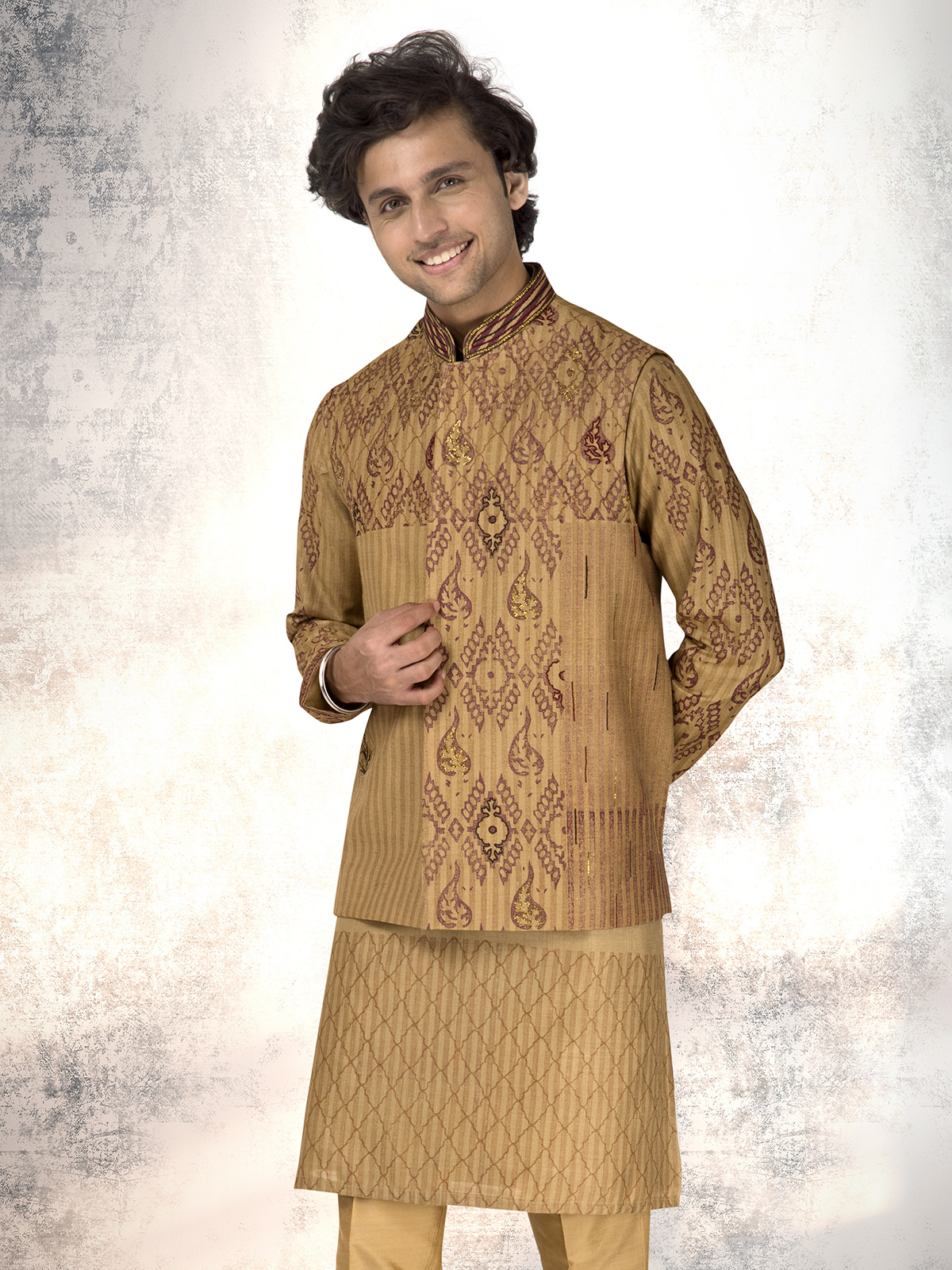 Draped in dark beige munga silk, this waistcoat set features artistic block prints enriched with resham and thread detailing. Its earthy tone and smooth drape bring quiet warmth to wedding evenings. Styled with a pant, it defines understated festive grace.