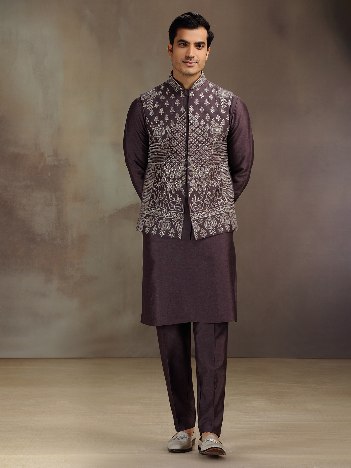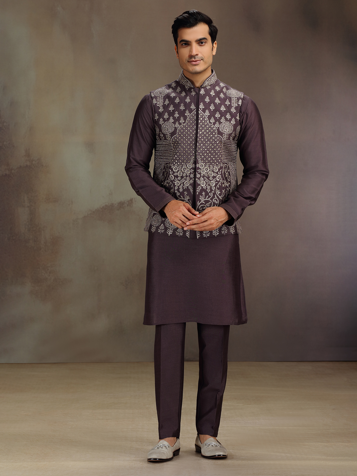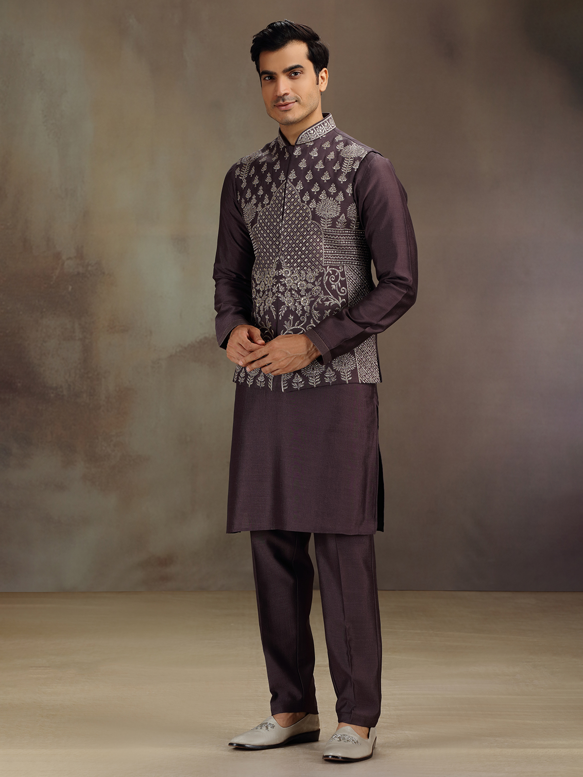 Look charming with tradition with this dark wine waistcoat set crafted from cotton silk, whispers regality through fine embroidery. The sleeveless waistcoat pairs gracefully with a chinese collared, full-sleeve kurta for a poised appeal. Comes with pant, perfect for evening wedding rituals and grand celebrations.