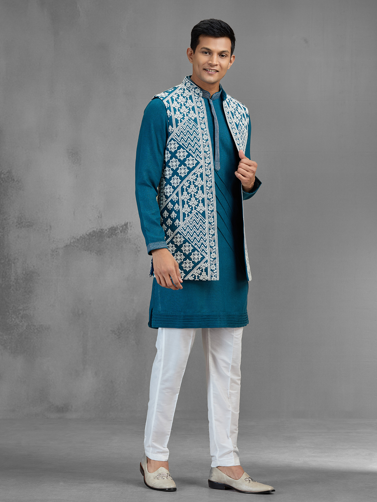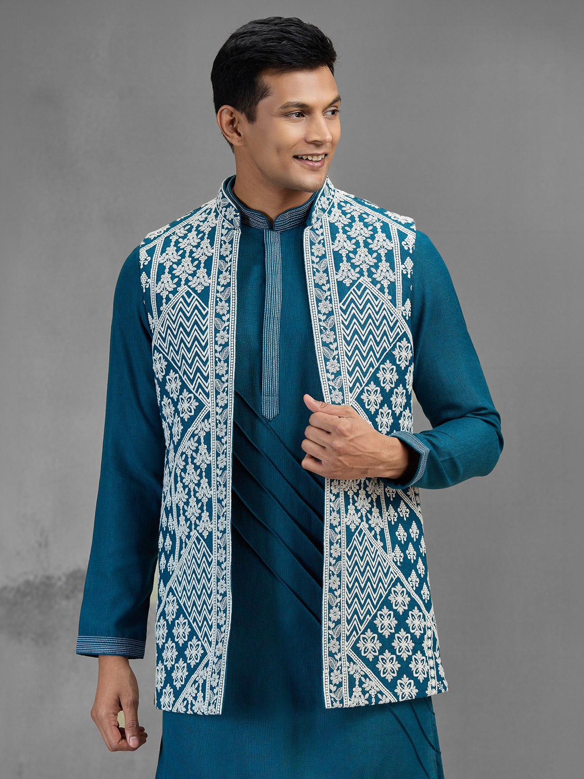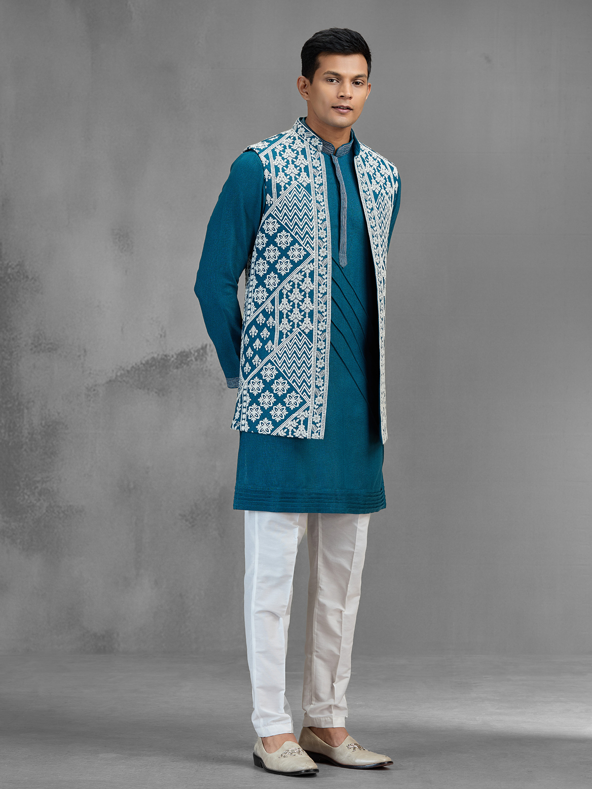 Make a bold statement with this teal blue art silk men’s waistcoat set, crafted with striking geometric and floral embroidery. Enhanced with contrasting threadwork and sequins, it offers a contemporary yet classic appeal. Styled with kurta and pant, this outfit is perfect for weddings and festive evenings.