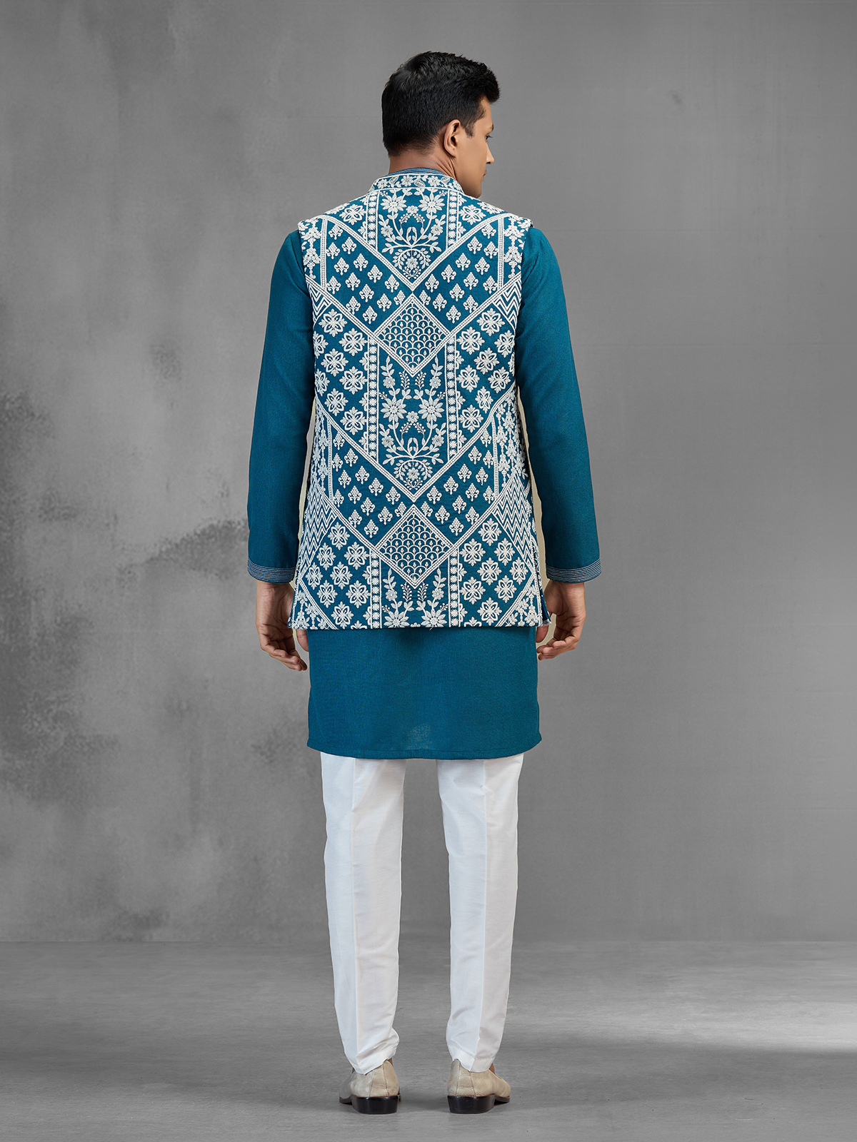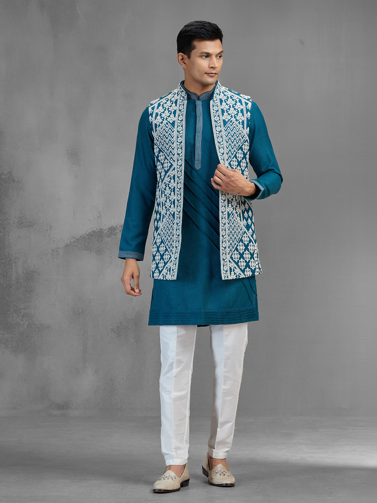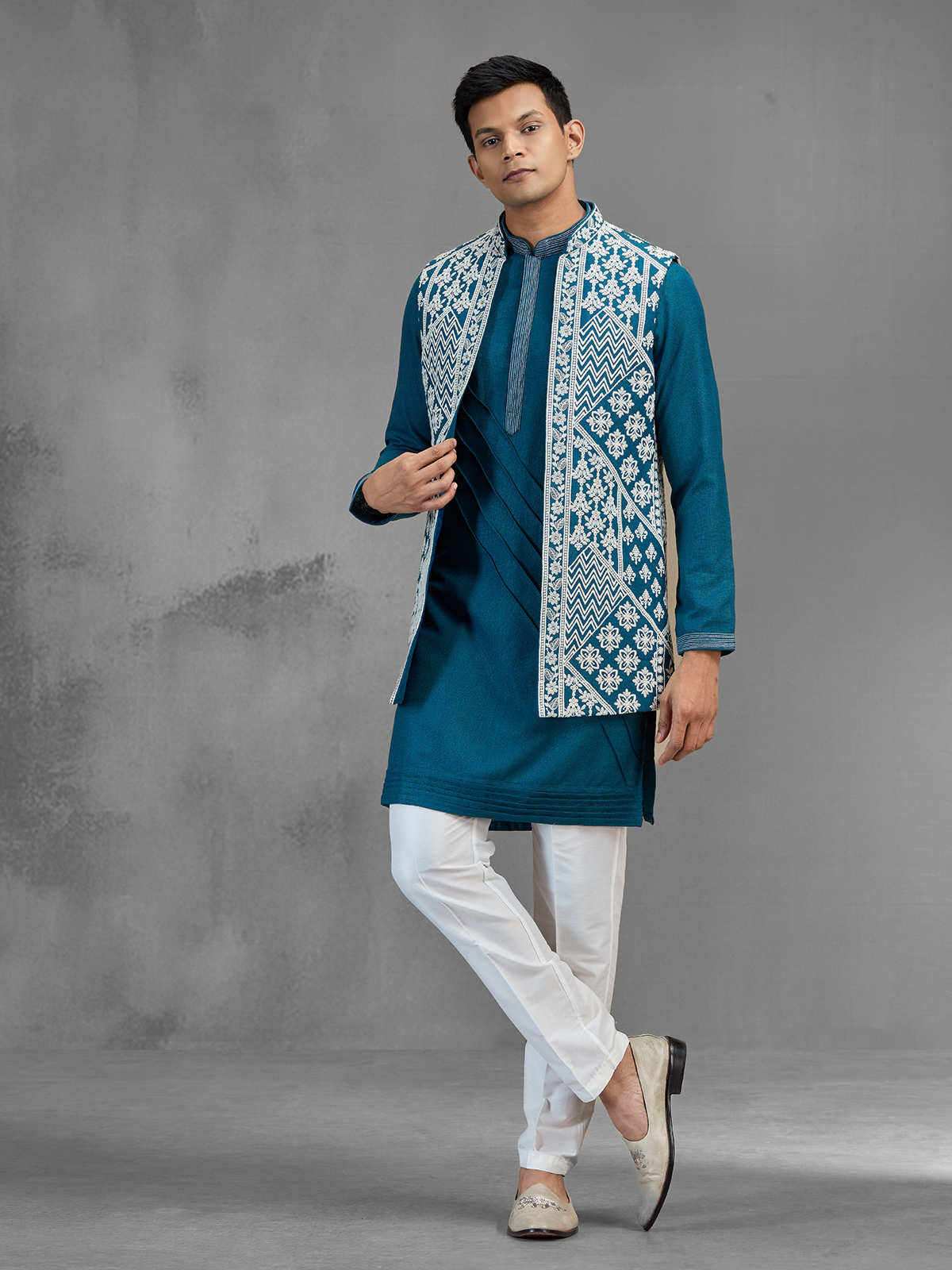 Make a bold statement with this teal blue art silk men’s waistcoat set, crafted with striking geometric and floral embroidery. Enhanced with contrasting threadwork and sequins, it offers a contemporary yet classic appeal. Styled with kurta and pant, this outfit is perfect for weddings and festive evenings.