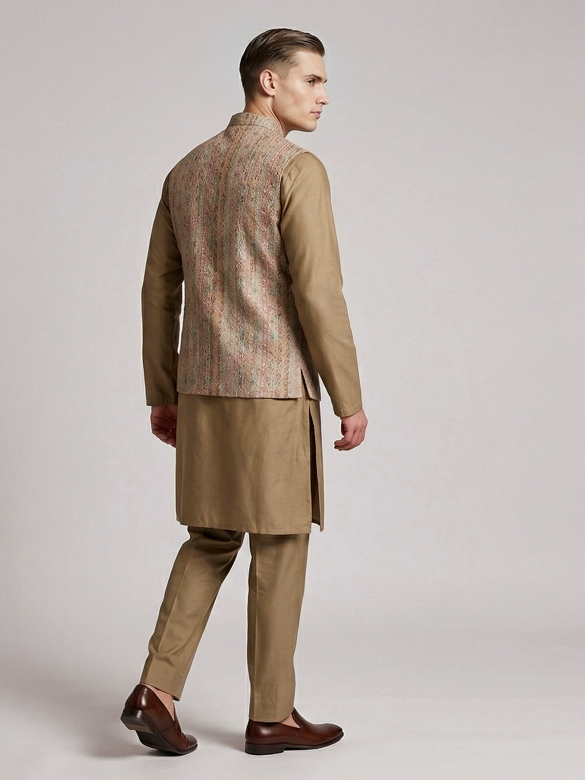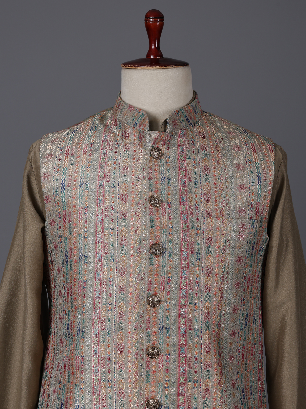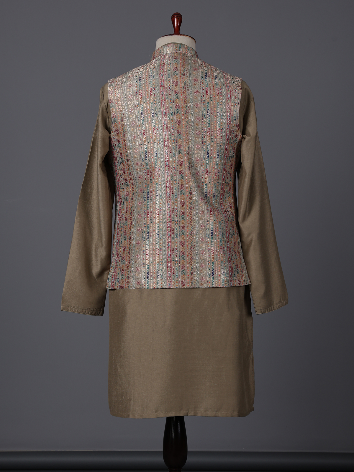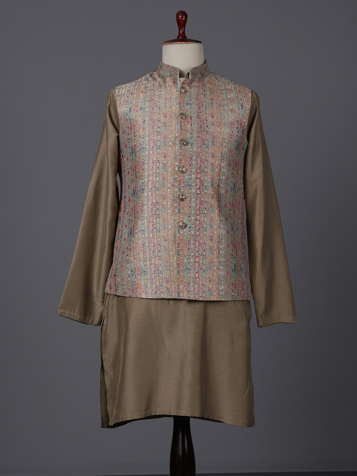 Earthy dusty olive lend contemporary charm to this silk waistcoat set crafted for stylish celebrations. The chinese collar kurta is paired with a waistcoat adorned with colorful woven motifs that add artistic vibrance. Styled with comfortable pants. The ensemble creates a modern yet traditional silhouette perfect for weddings, receptions, sangeet functions and festive occasions.