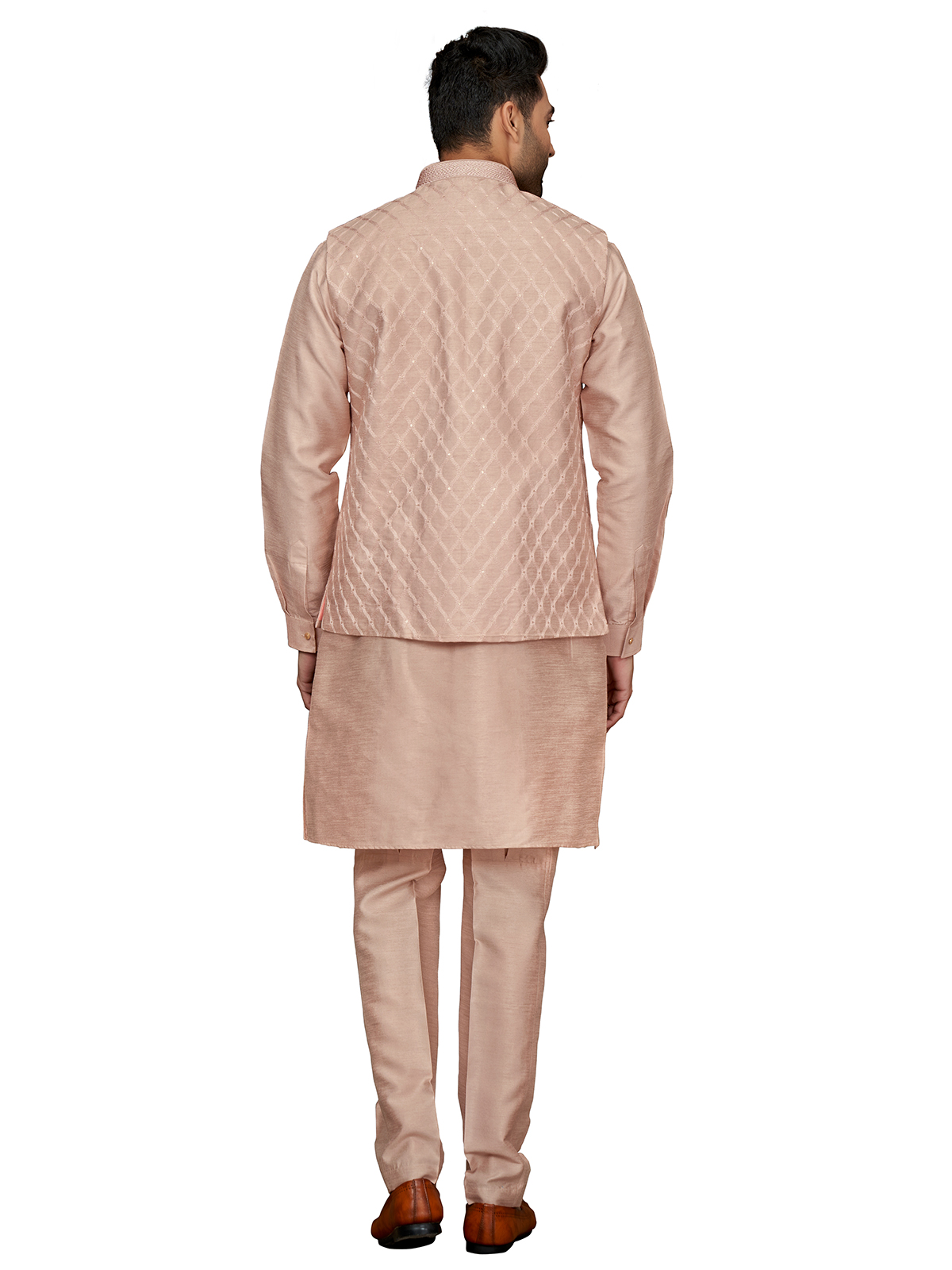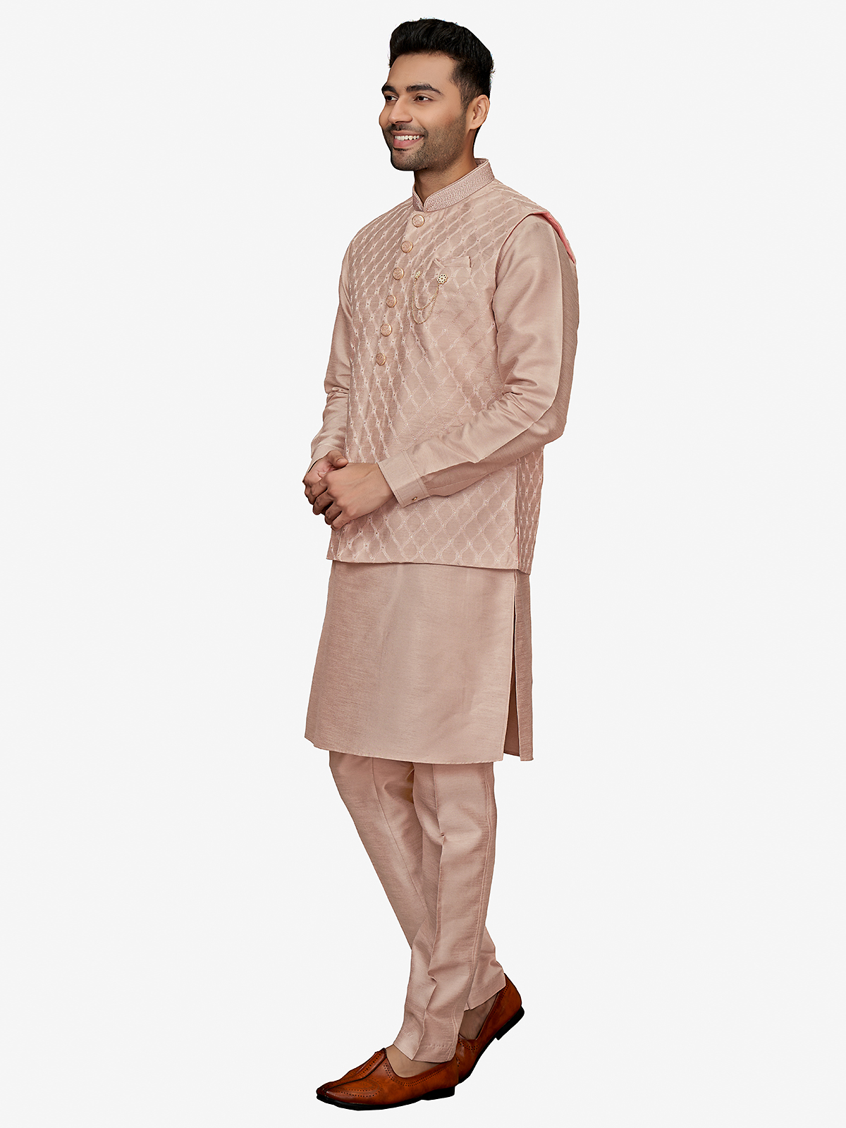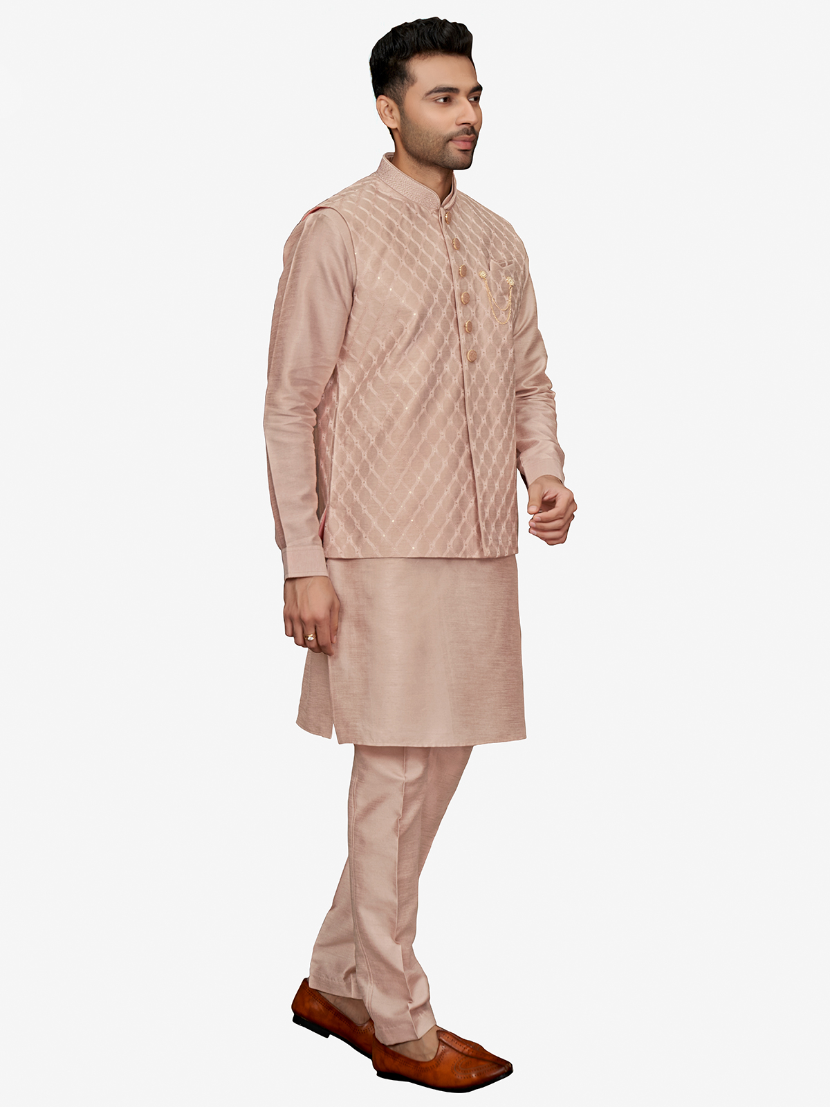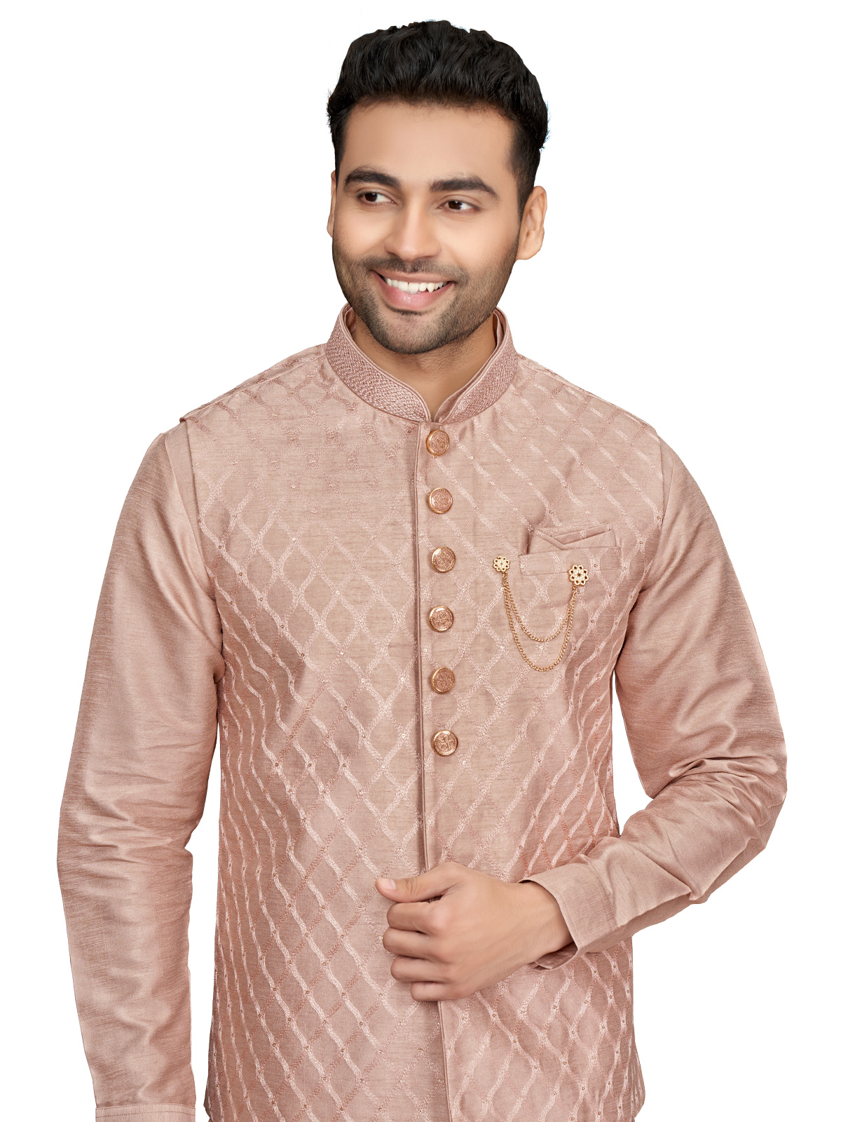 Look your best at your next wedding with this dusty peach silk waistcoat set. Adorned with intricate thread and sequins work, this waistcoat set features a mandarin collar, a welt pocket with pocket tie, and fancy buttons at the front. It also comes with a full sleeves kurta and bottom for a complete look.
