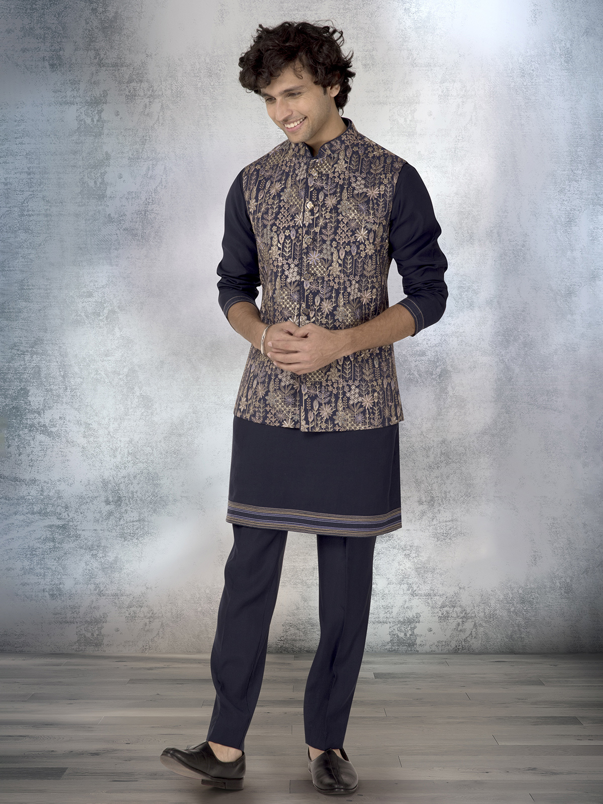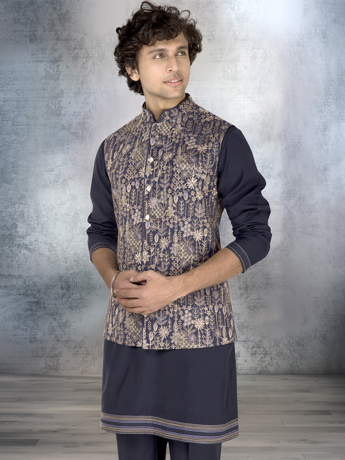 A fusion of heritage and modern artistry, this dusty purple silk waistcoat set features fine resham and embroidery detailing. The muted tone exudes regal calm, perfect for wedding festivities. Styled with a pant, it reflects refined elegance and charm.