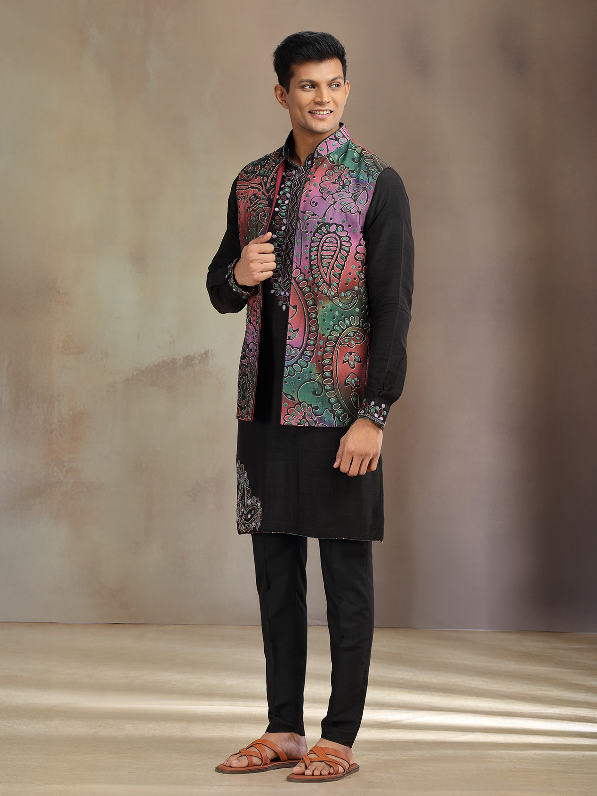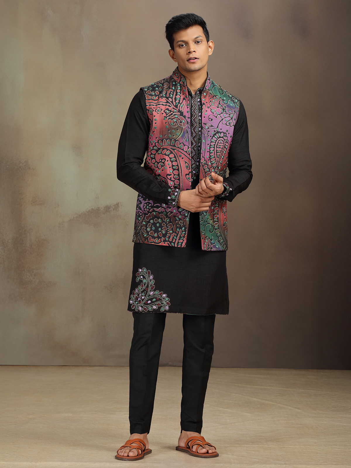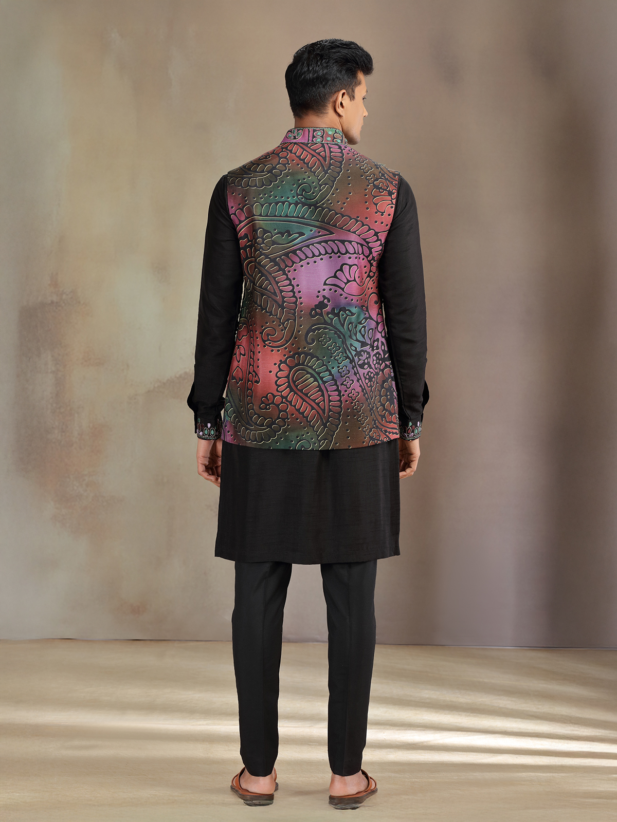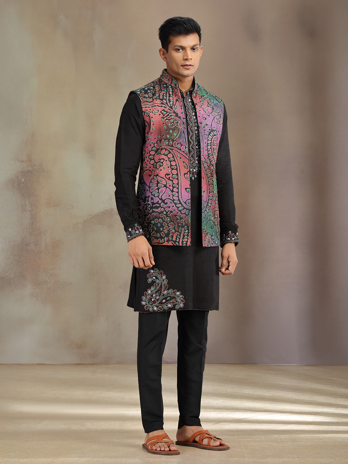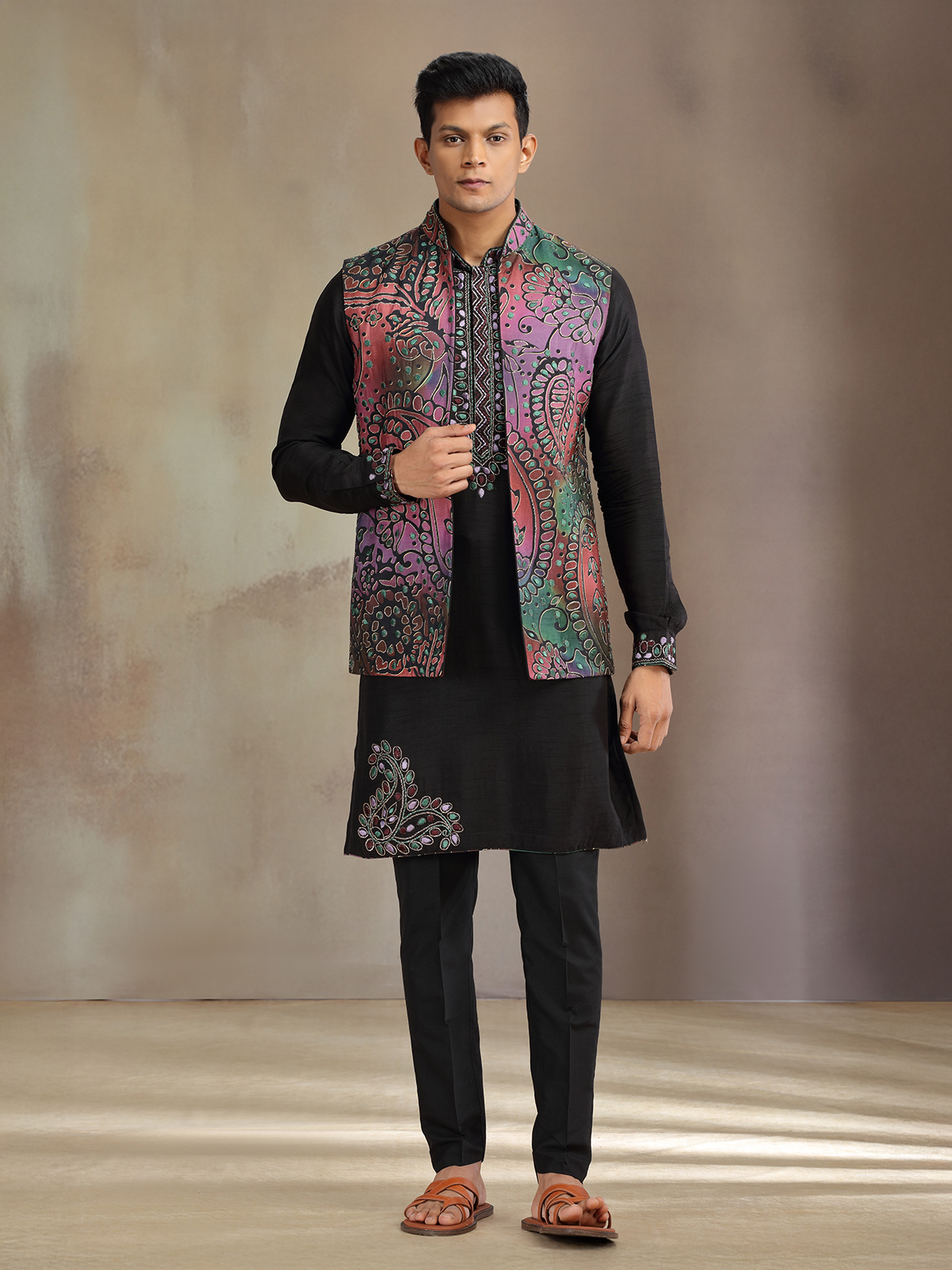 Tailored in luxurious black silk, this waistcoat set features fine zari and embroidery work on a striking printed base. Paired with matching pants, it is perfect for weddings and receptions, offering men a refined yet modern look that balances tradition with bold sophistication.