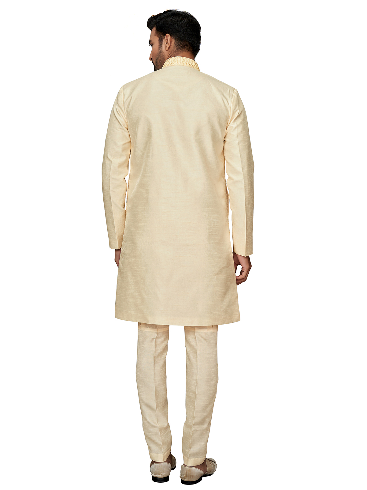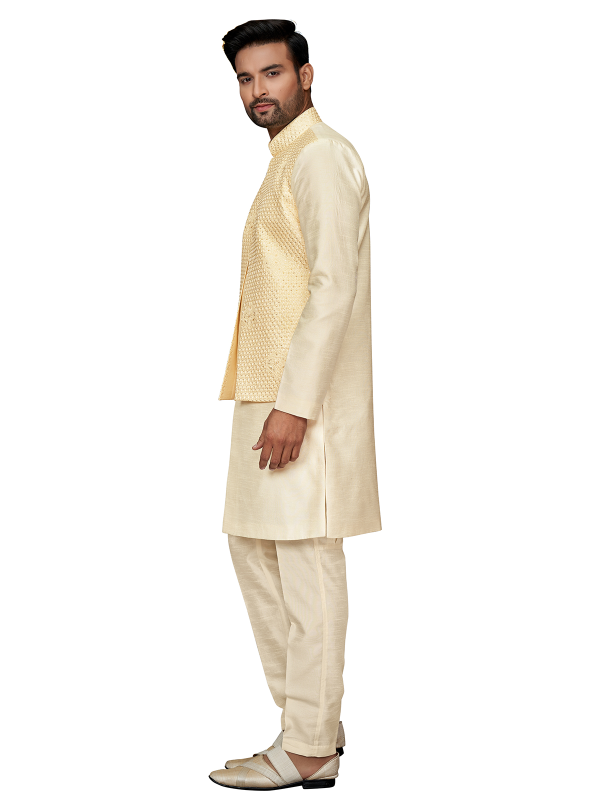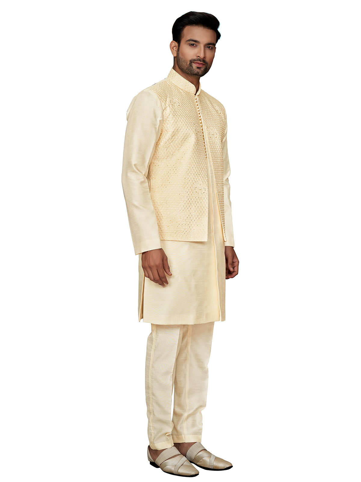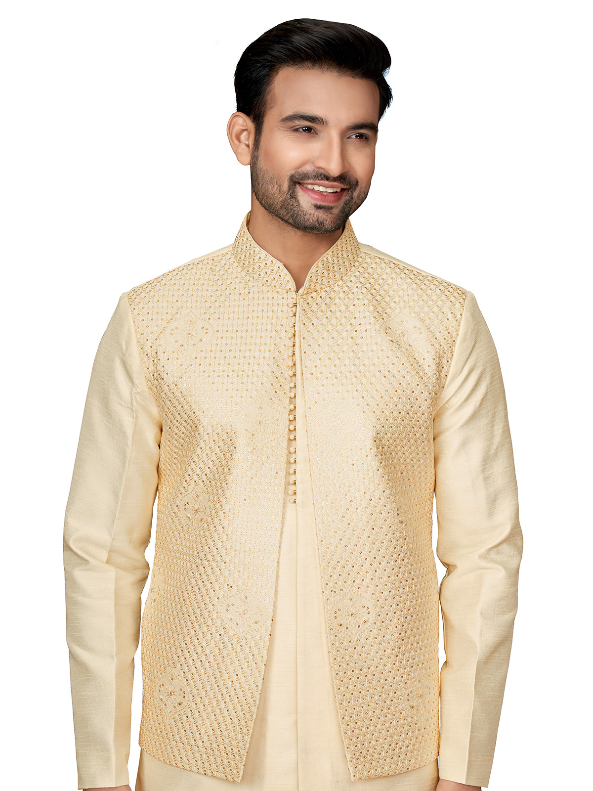 Upgrade your traditional wardrobe with this elegant cream silk waistcoat set. The unique embroidery, resham, and sequins work add a touch of glamour. It features a mandarin collar, full buttoned placket, and comes with a bottom.