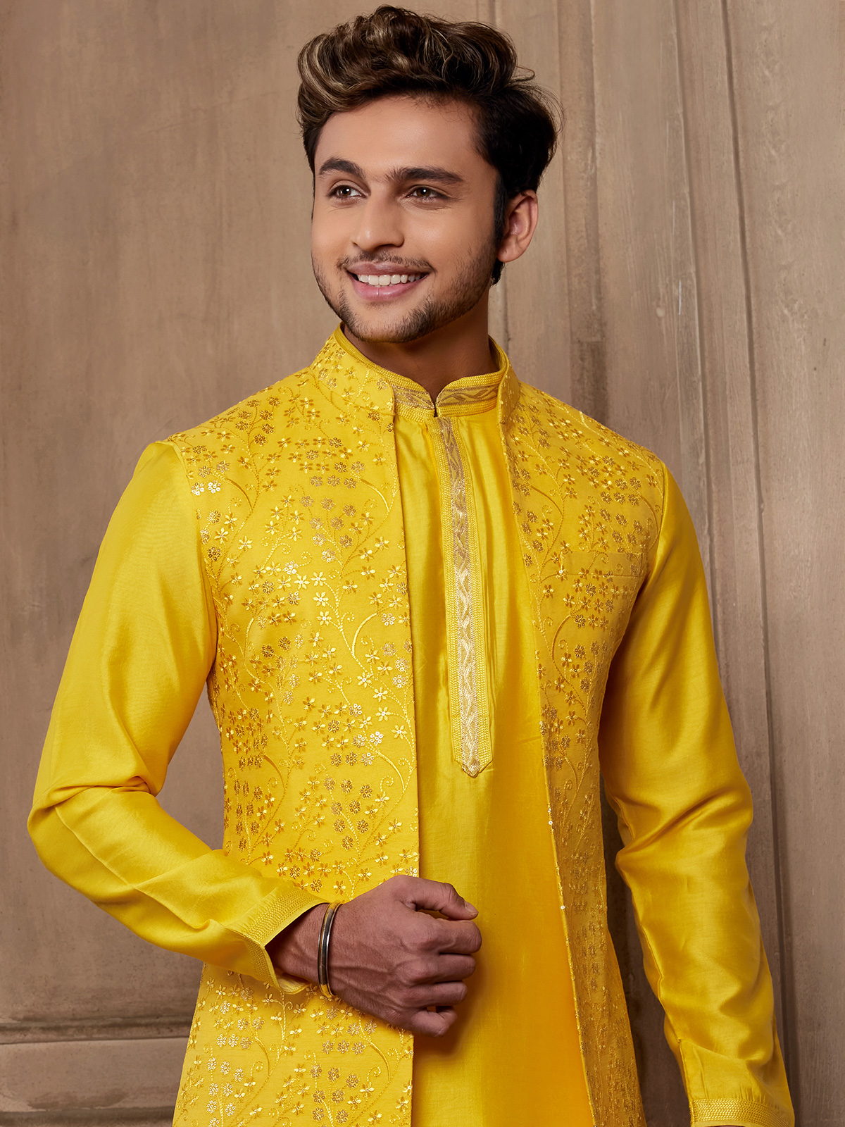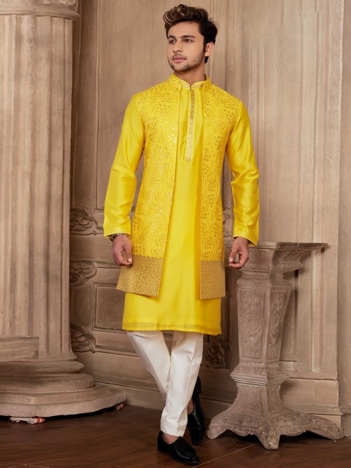 Look your best in the latest traditional attires with just a few clicks. This dark yellow waistcoat set. Crafted in silk fabric. Embellished with embroidered, resham, and sequins work. It comes with a bottom.