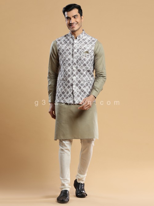 Celebrate in style with this exclusive festive collection crafted for men. This cream and green silk waistcoat set is embellished with embroidered resham work all over, featuring a stand collar, full button placket, three welt pockets, and a straight vented hemline. Comes with a comfortable bottom to complete the look.
