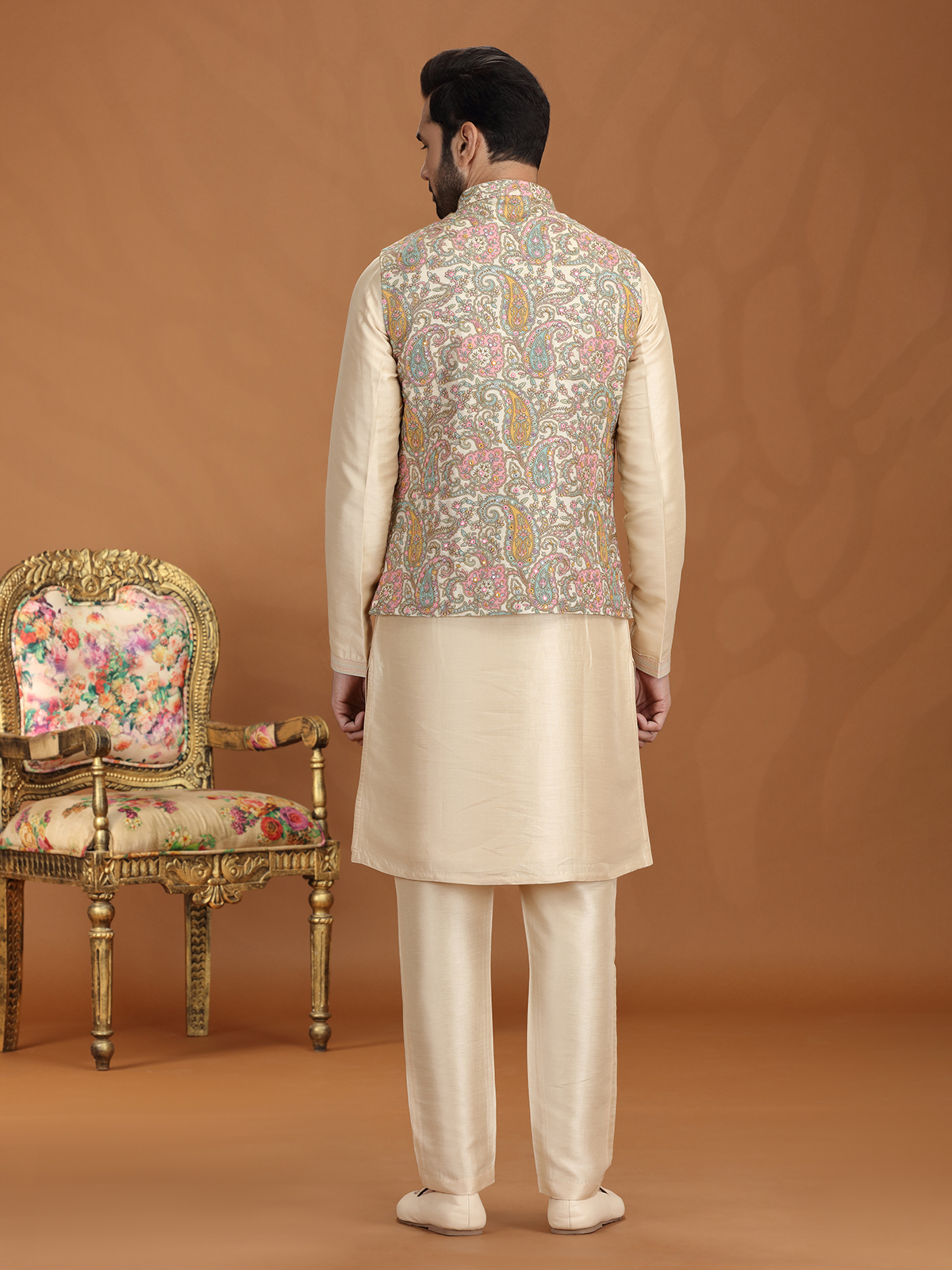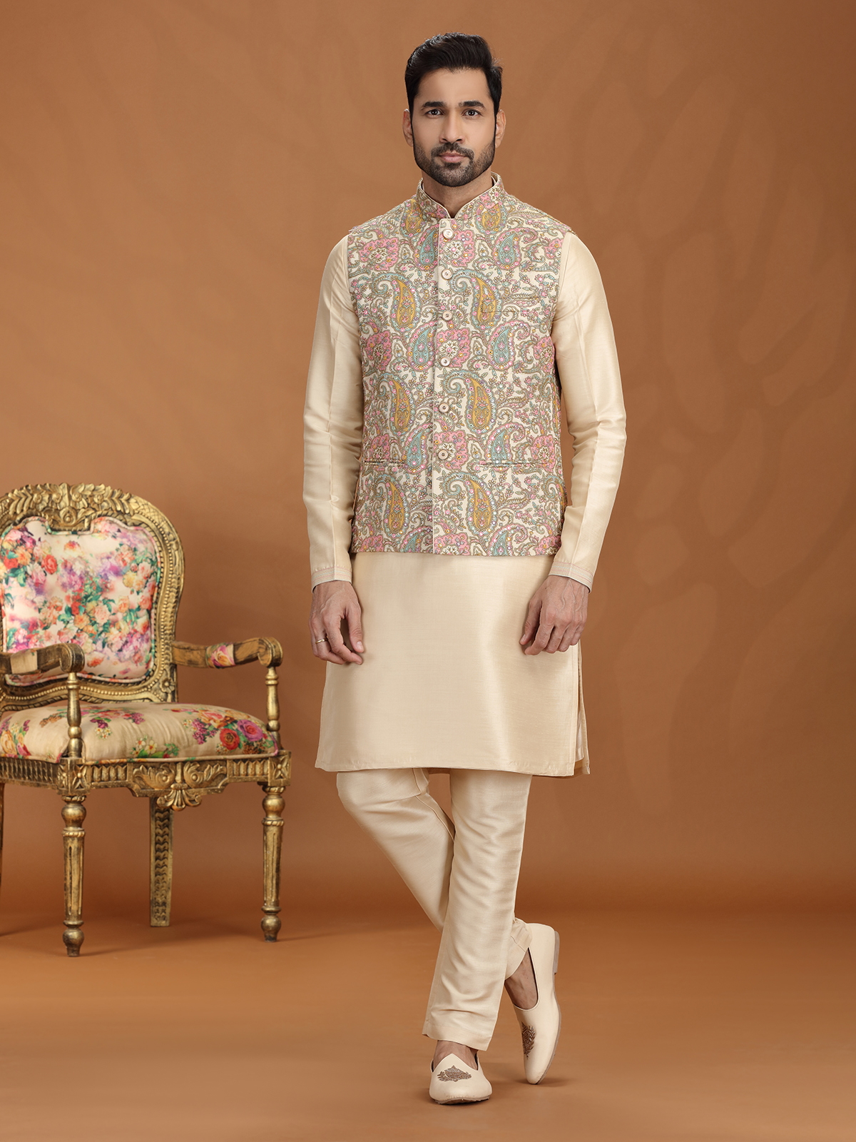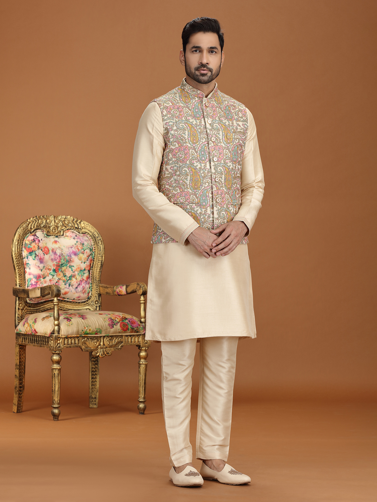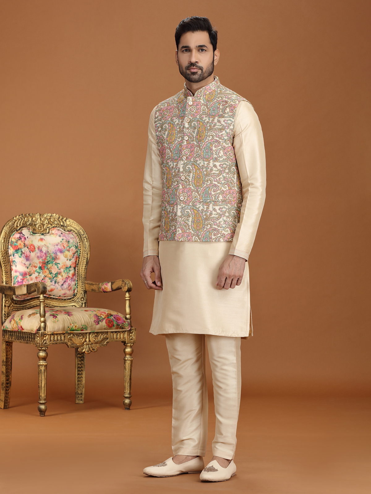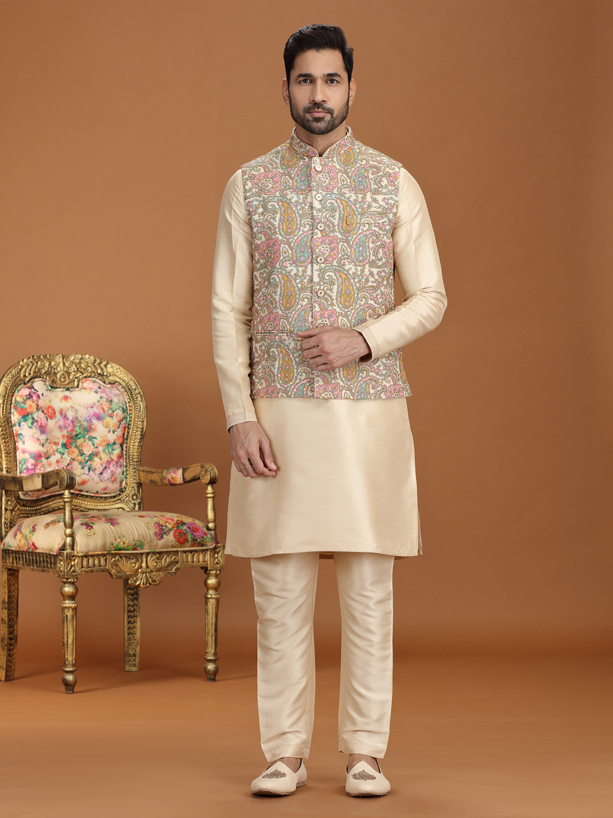 Elevate your festive charm with this golden georgette waistcoat set, richly ornamented with sequins, thread, and fine embroidery. Styled with a graceful Chinese collar and tailored pant, it exudes timeless elegance. A flawless choice for weddings, receptions, and festive gatherings, this ensemble reflects majestic appeal with a refined touch of contemporary sophistication.