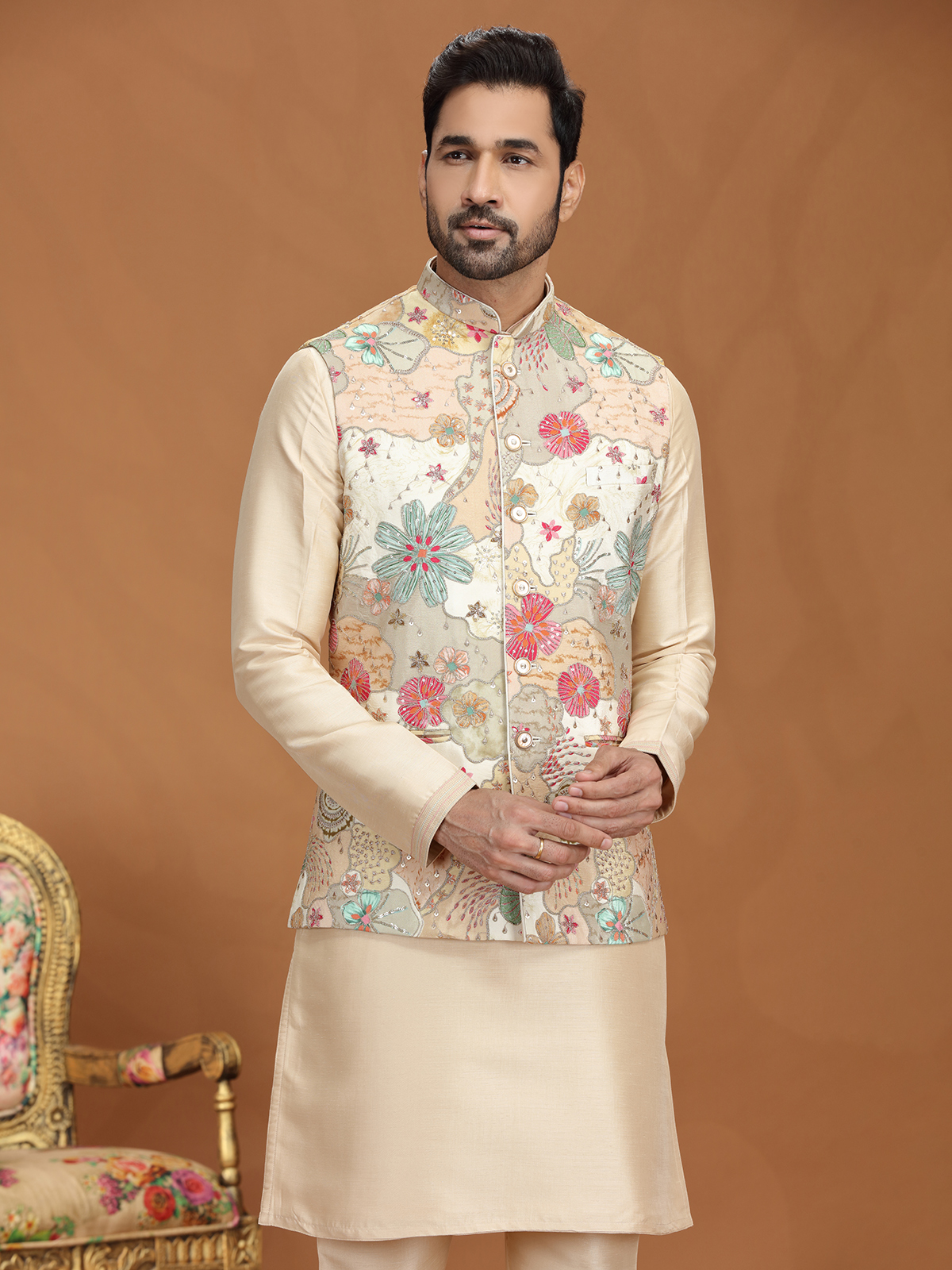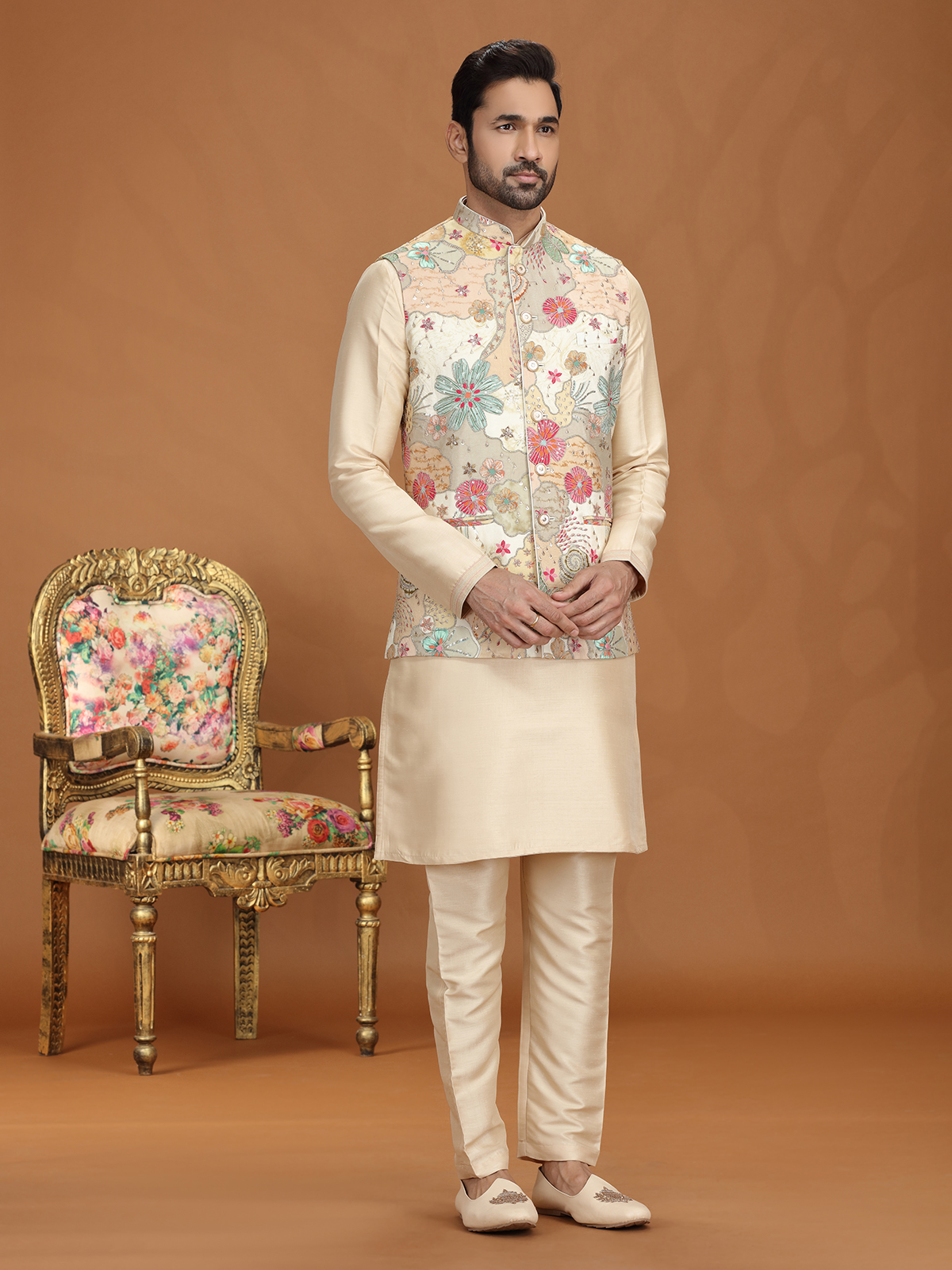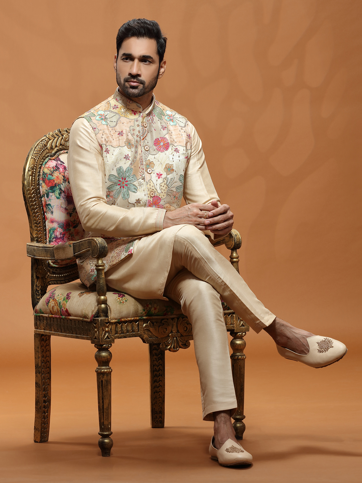Dazzle at grand occasions in this gold viscose waistcoat set, enhanced with striking prints, zari, and shimmering sequins. The sharp Chinese collar creates a dignified silhouette, while the pant ensures sleek comfort. Tailored for weddings, receptions, and festive events, this attire embodies royal charm with an elegant balance of heritage-inspired artistry and modern appeal.