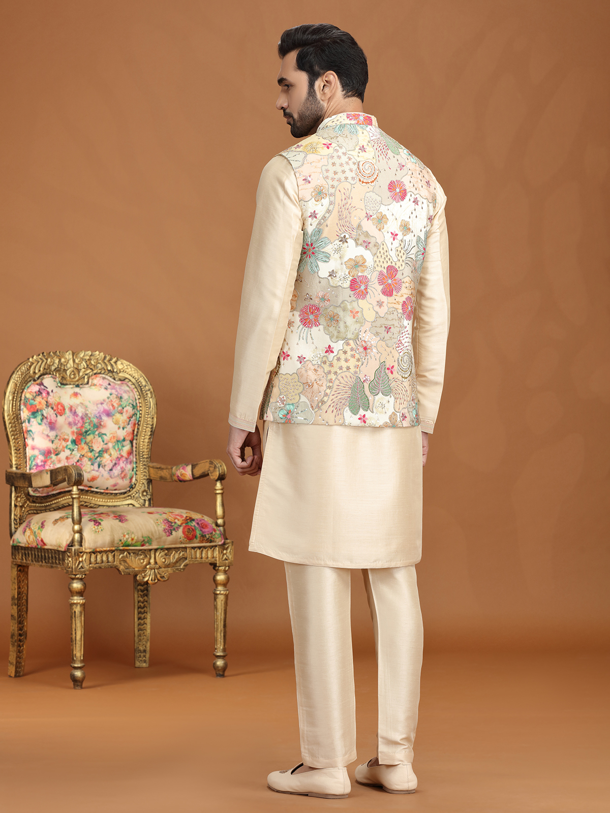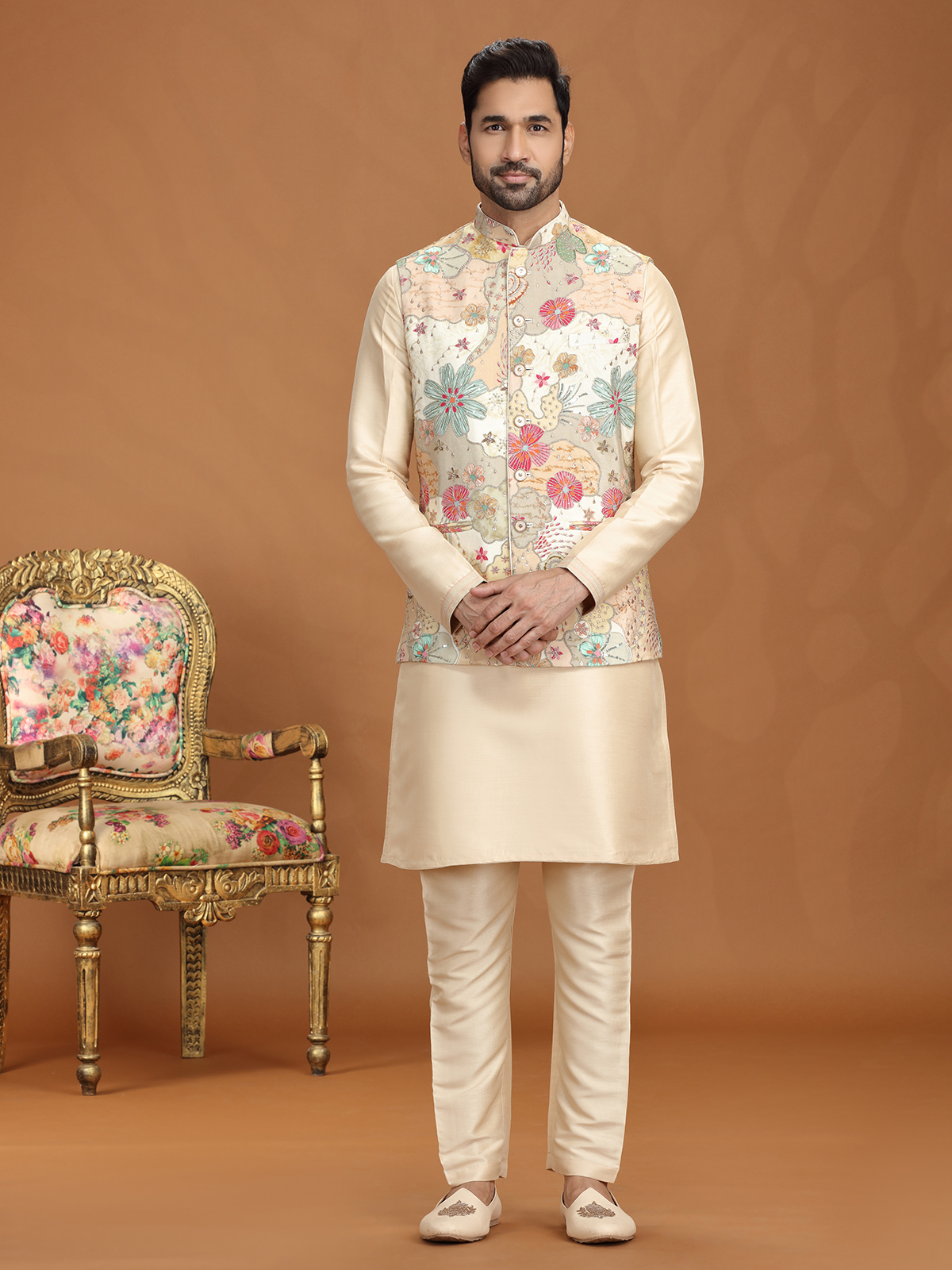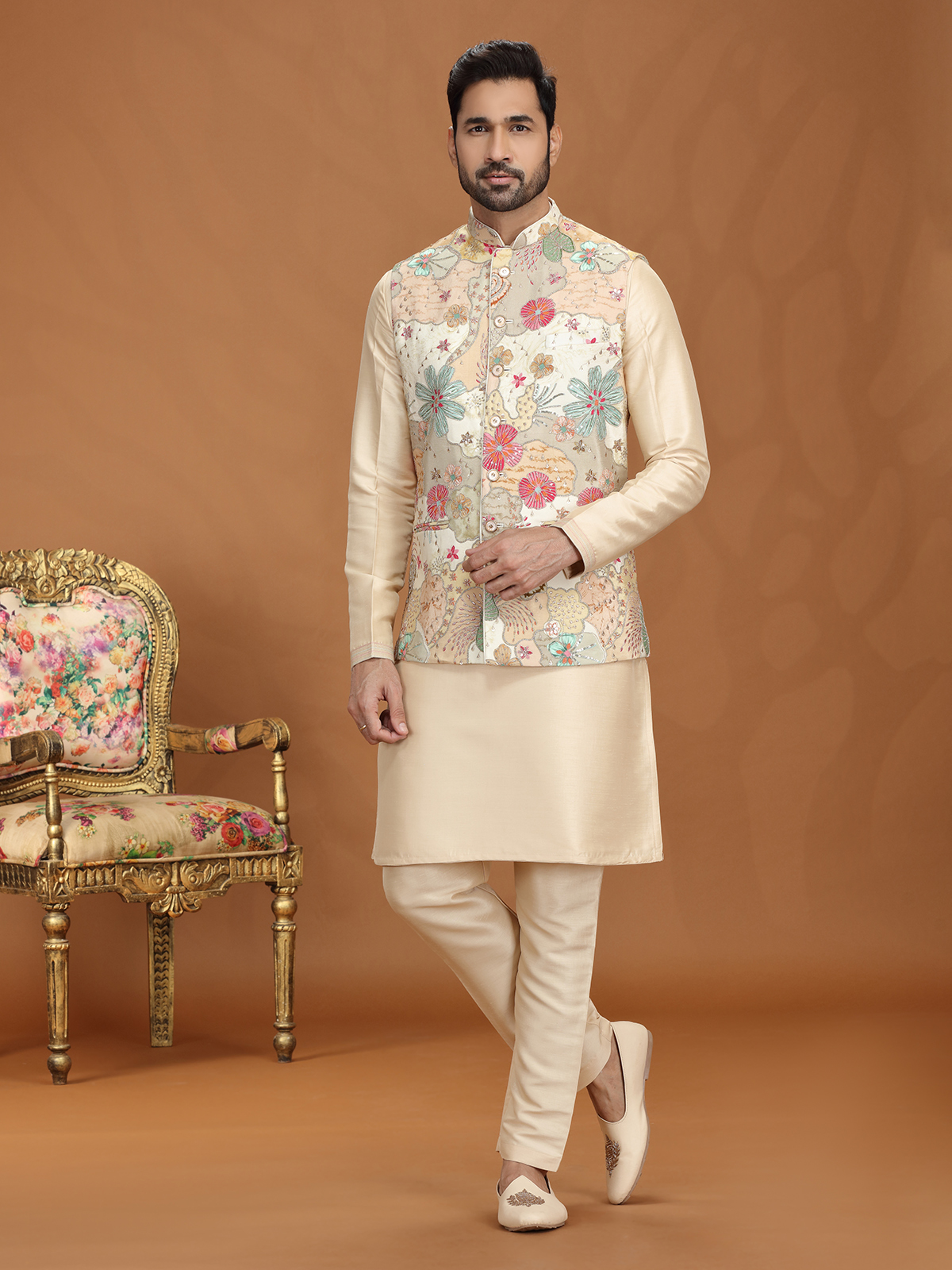 Dazzle at grand occasions in this gold viscose waistcoat set, enhanced with striking prints, zari, and shimmering sequins. The sharp Chinese collar creates a dignified silhouette, while the pant ensures sleek comfort. Tailored for weddings, receptions, and festive events, this attire embodies royal charm with an elegant balance of heritage-inspired artistry and modern appeal.