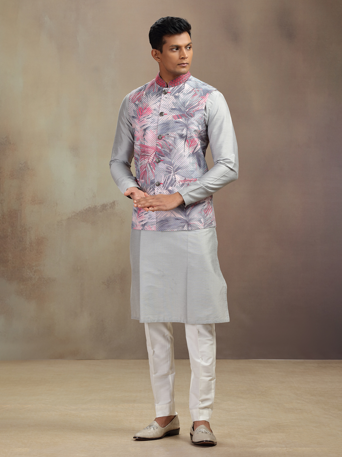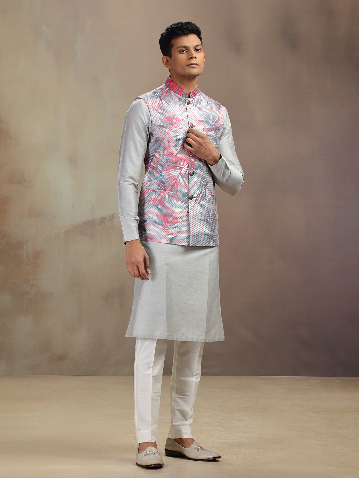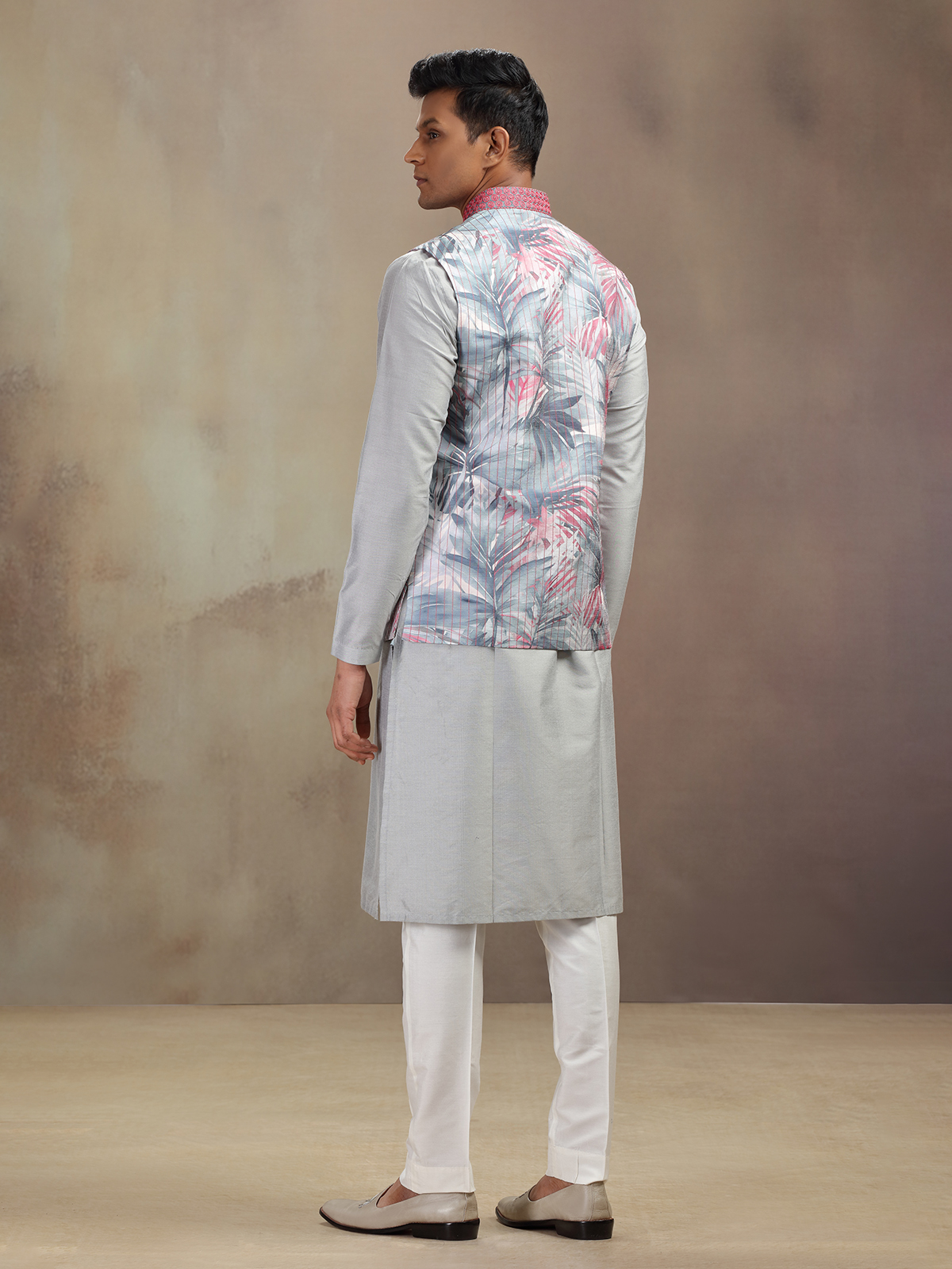 Grey Banarasi Silk Waistcoat Set With Classic Printed Detailing