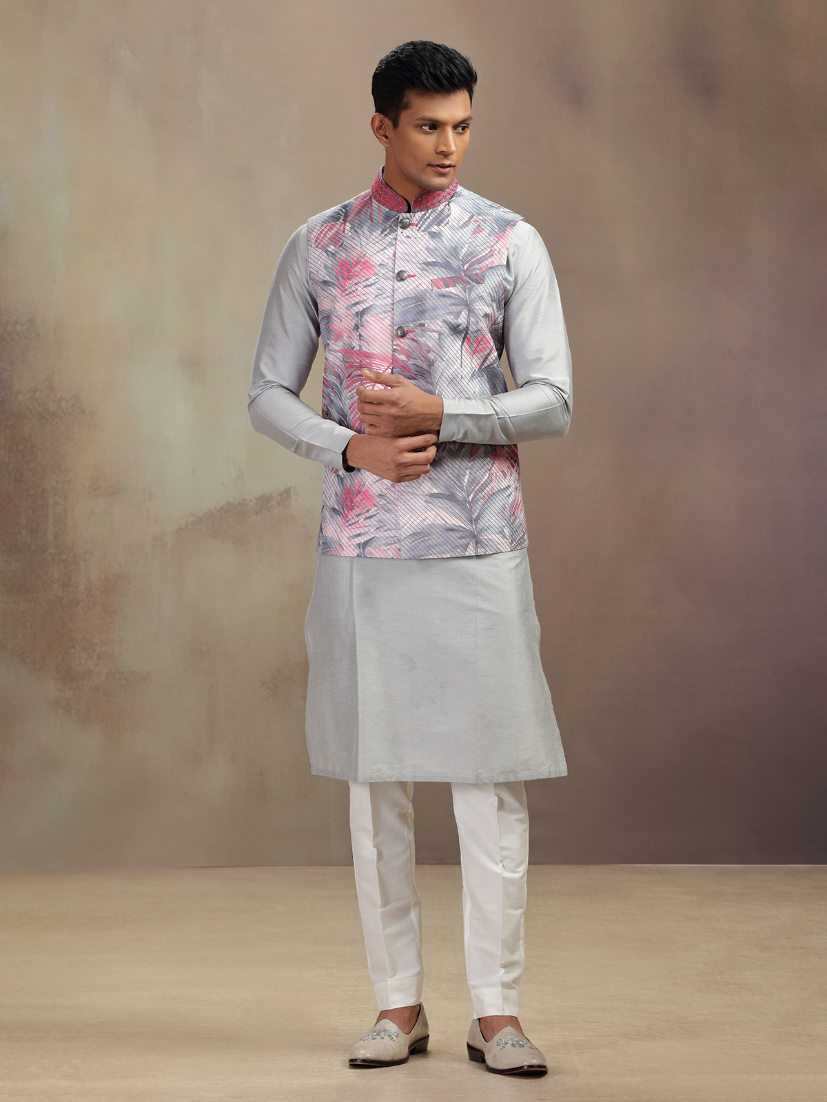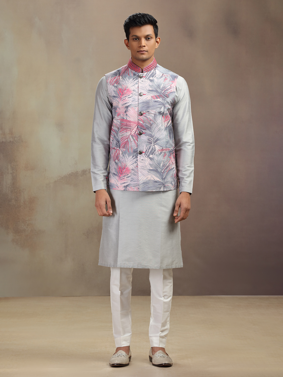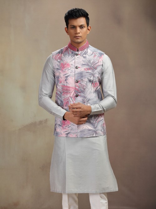 Grey Banarasi Silk Waistcoat Set With Classic Printed Detailing