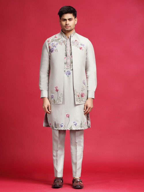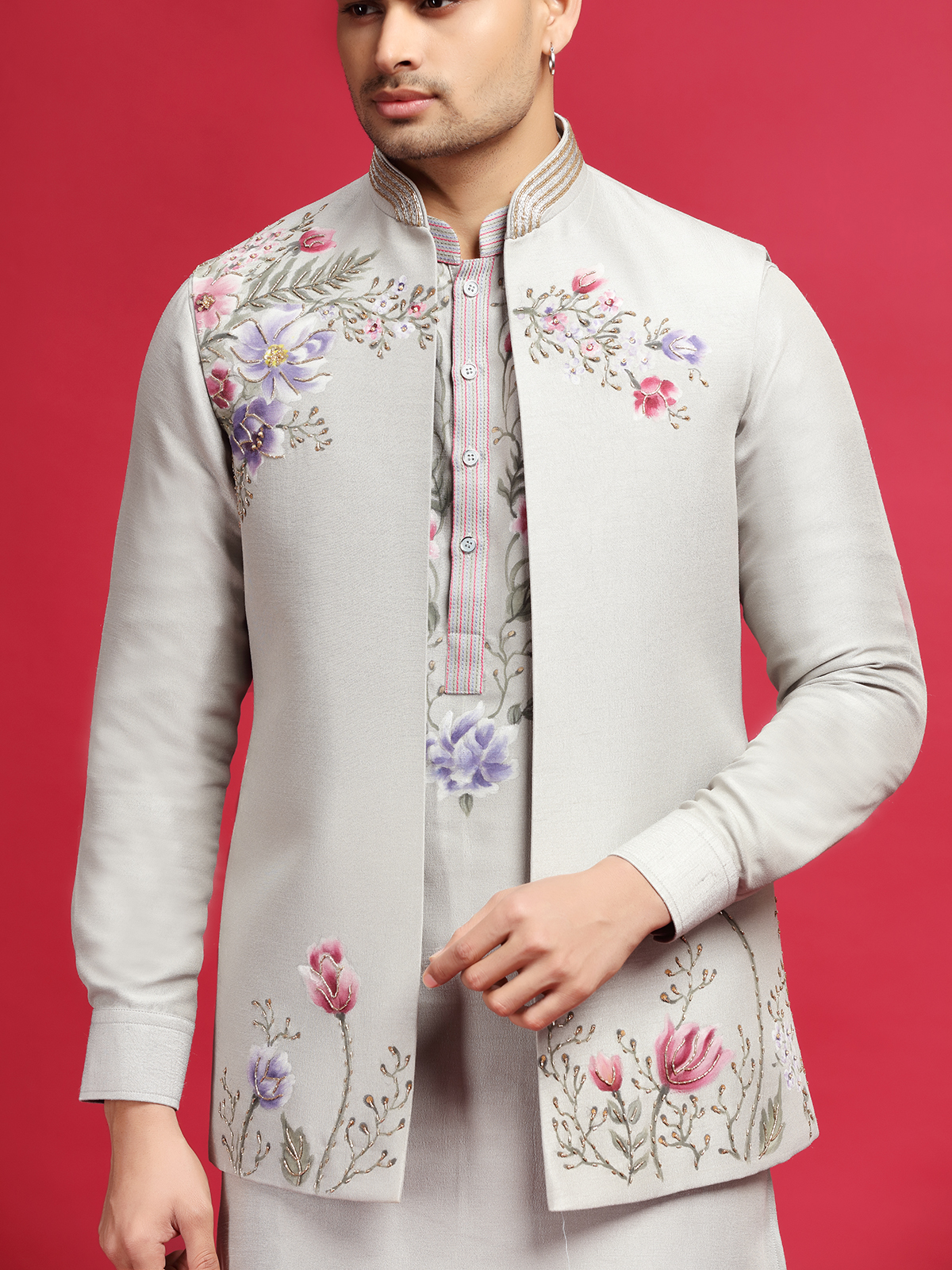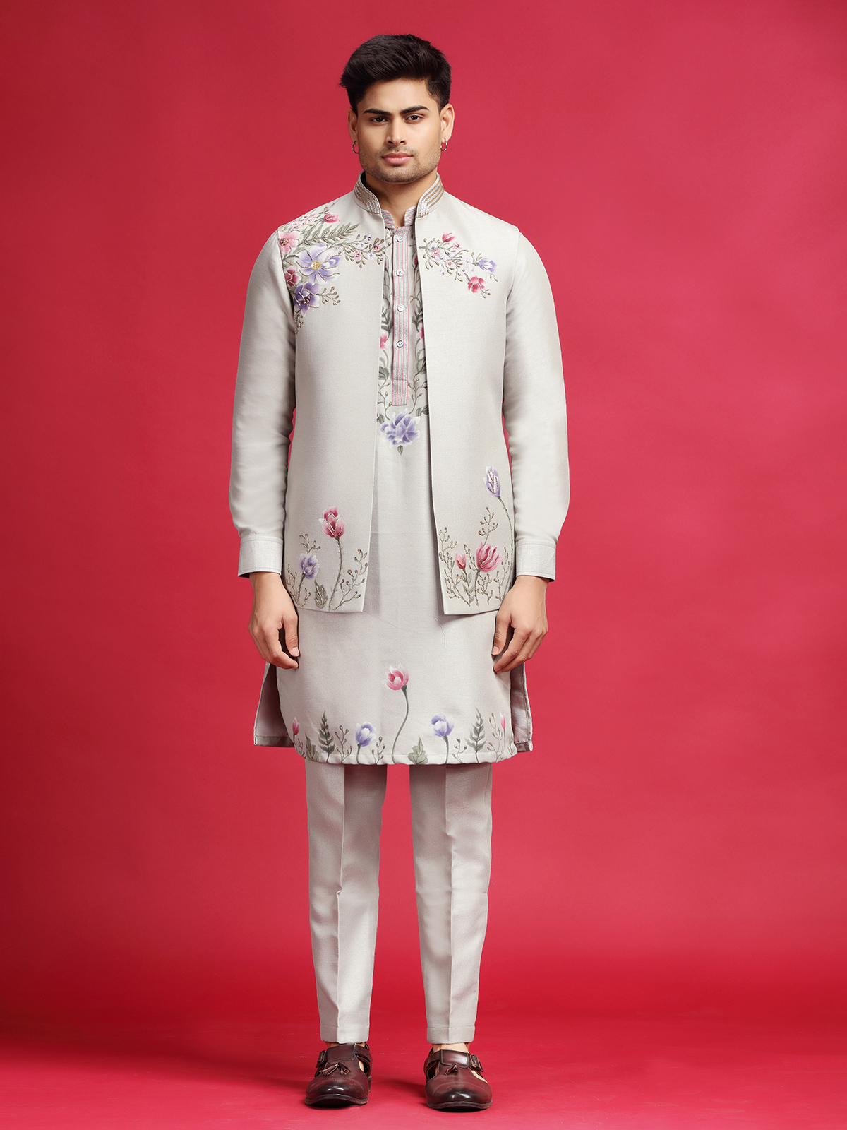 In subtle grey silk, this hand-printed waistcoat set sparkles with tasteful cutdana accents merging artistry with elegance. The sleeveless waistcoat and structured chinese collar paired with a full-sleeve kurta radiate graceful composure. Finished with pants, it reflects understated wedding sophistication.