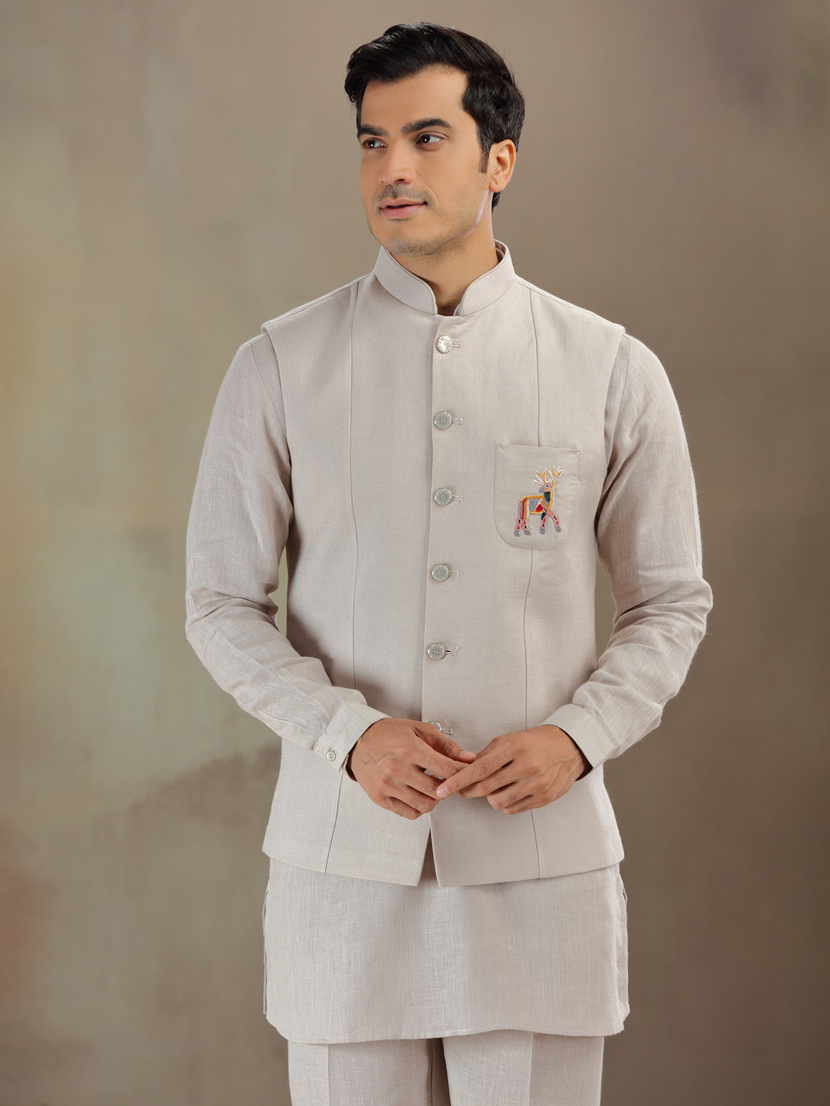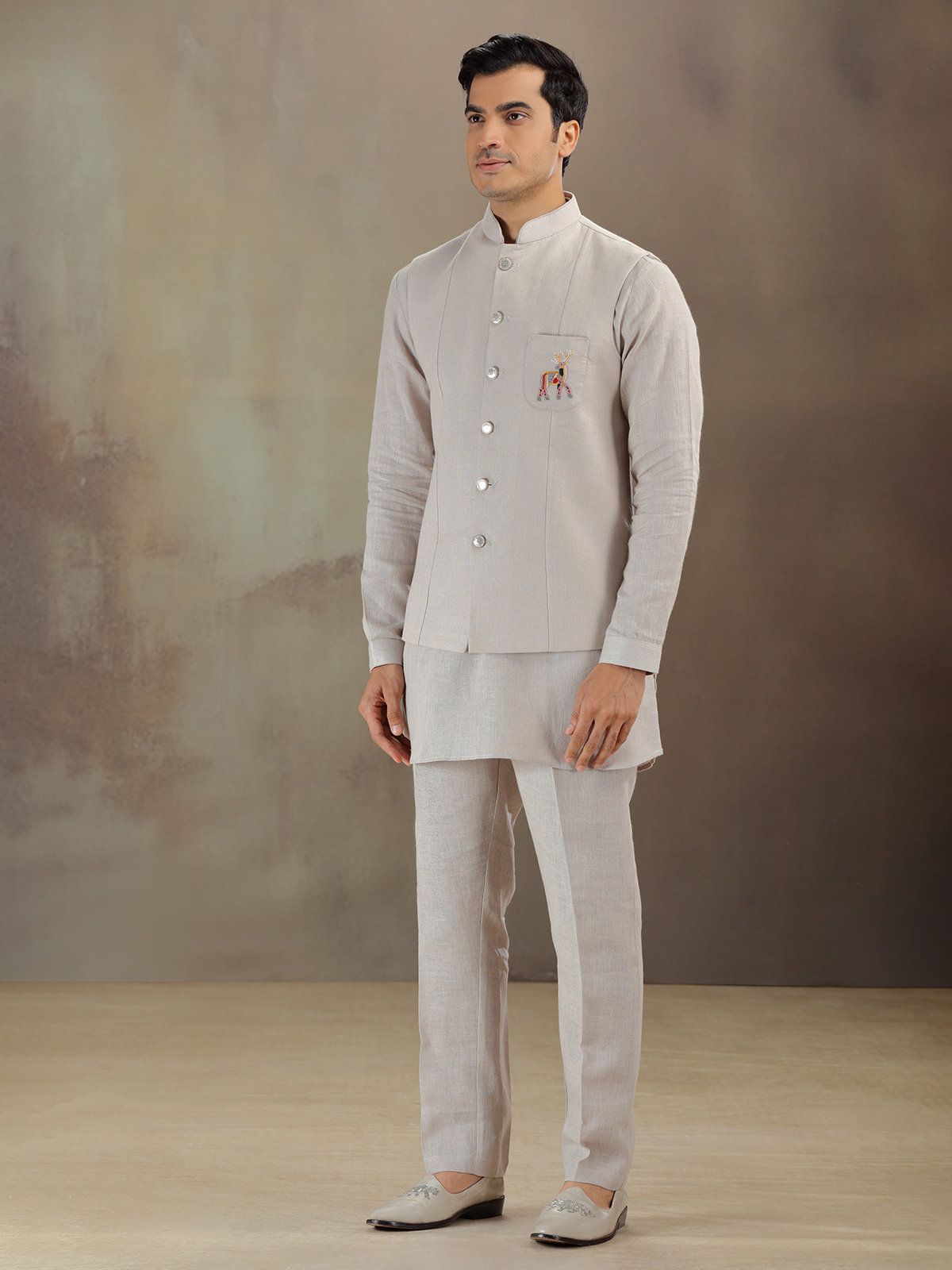 In classic grey, zardosi and thread artistry lend an aura of timeless craftsmanship on this linen waistcoat set. The sleeveless waistcoat pairs with a full-sleeve kurta featuring a chinese collar. Comes with pant, ideal for serene wedding gatherings.