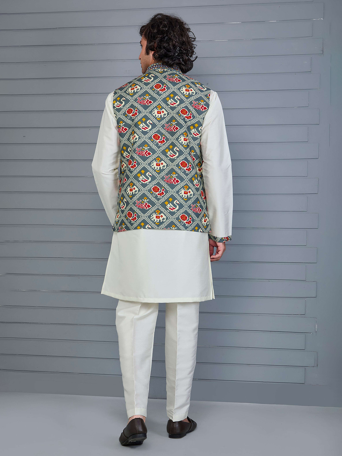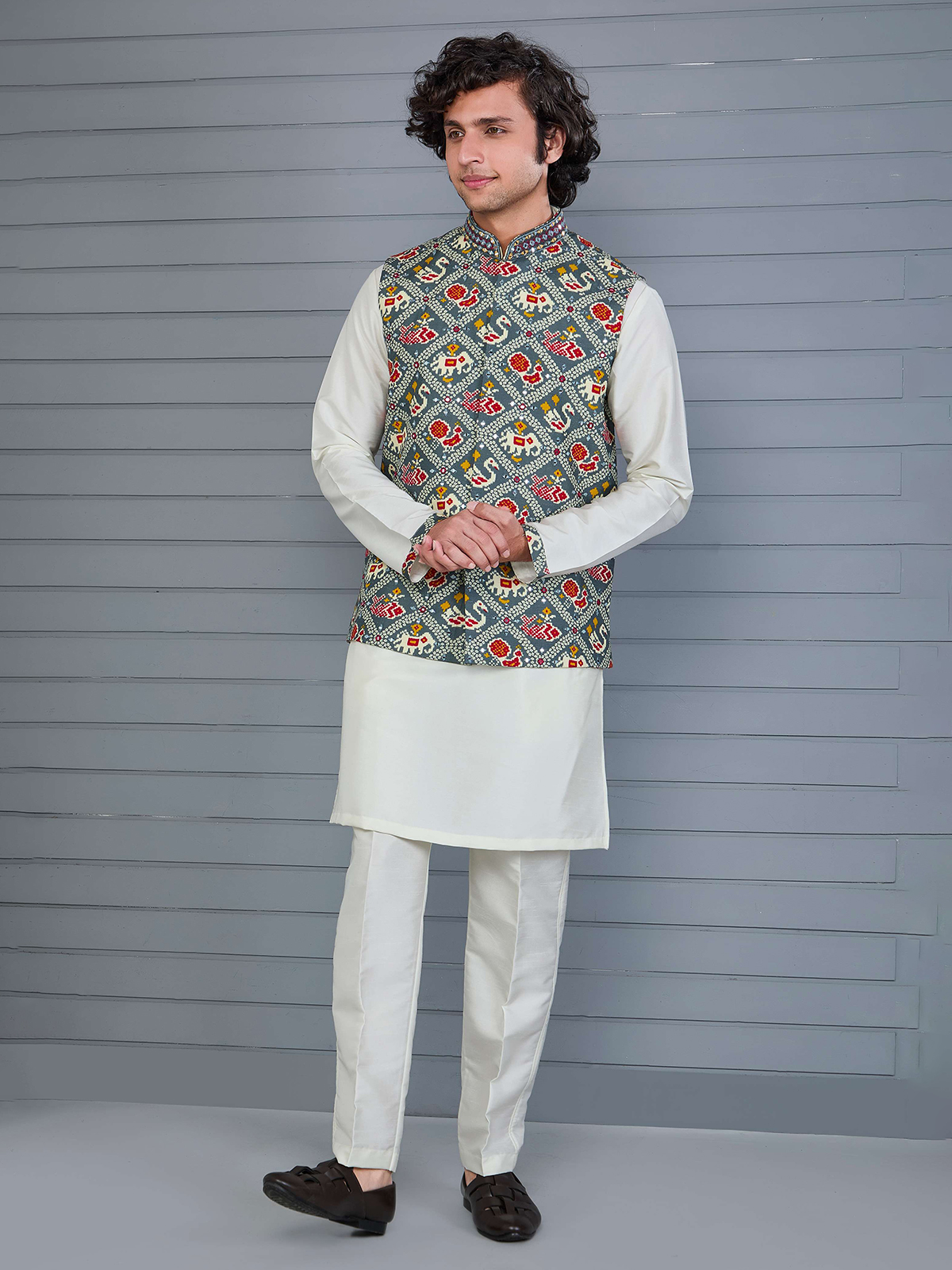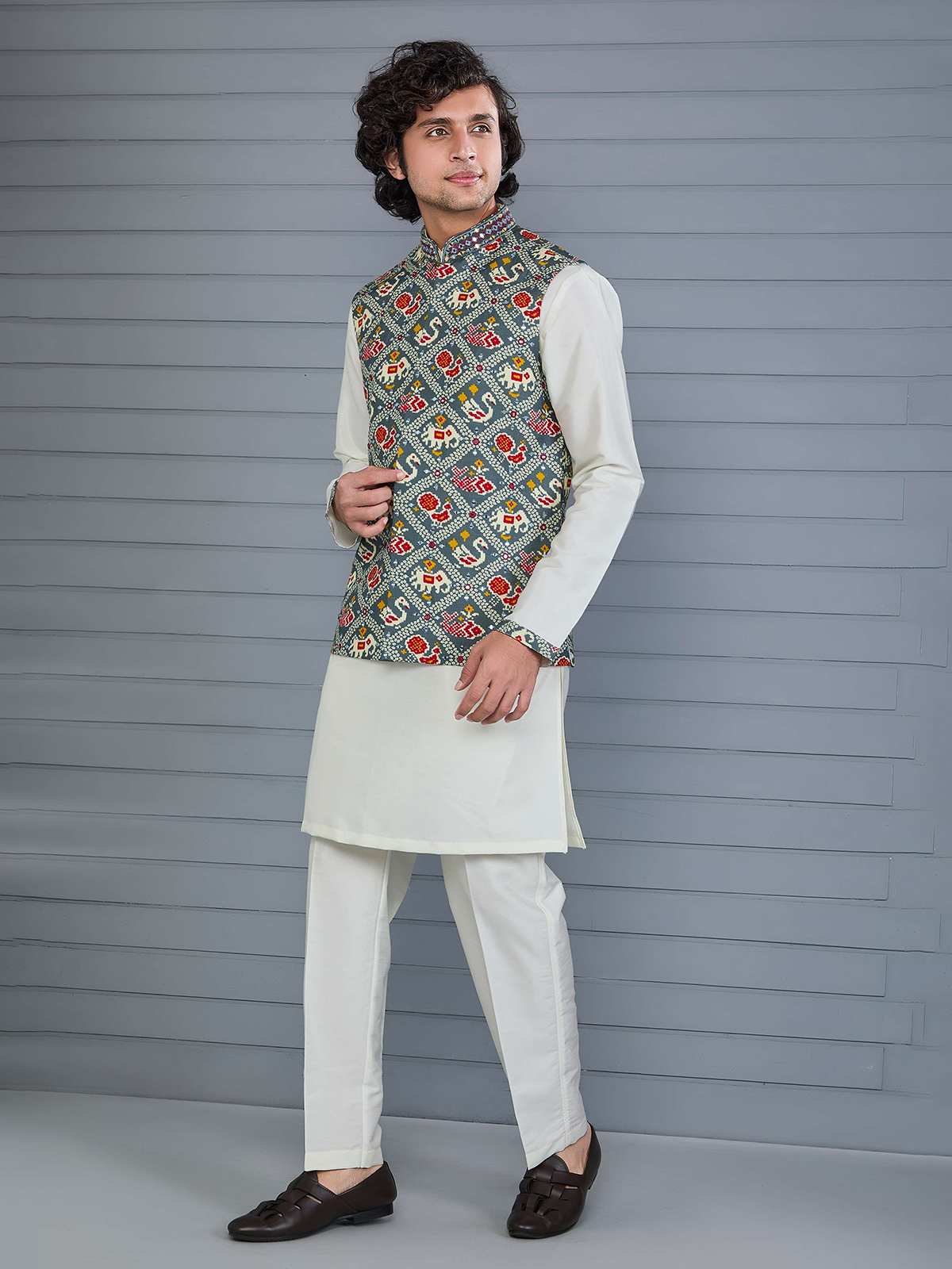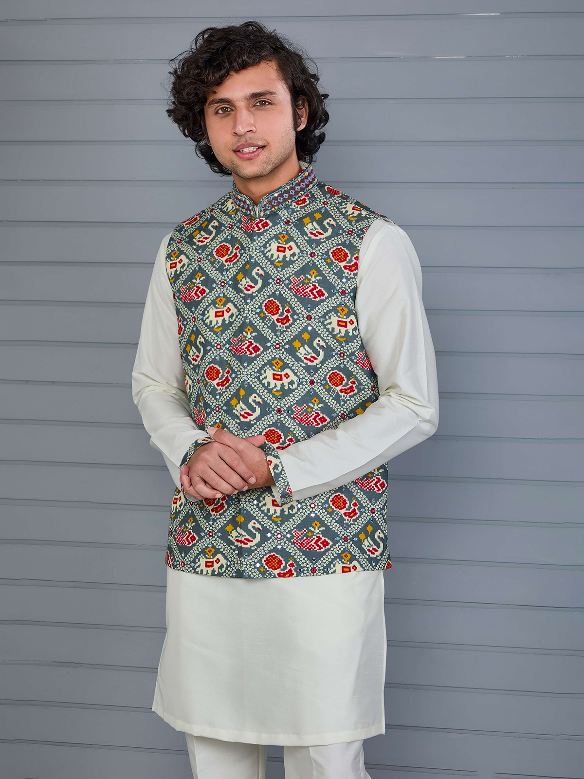 Woven in rich silk, this grey and off-white bandhej waistcoat is elevated with classic aabla work. Styled with a structured Chinese collar and paired with a coordinated pant, it reflects timeless elegance for weddings, festive celebrations and refined reception occasions.