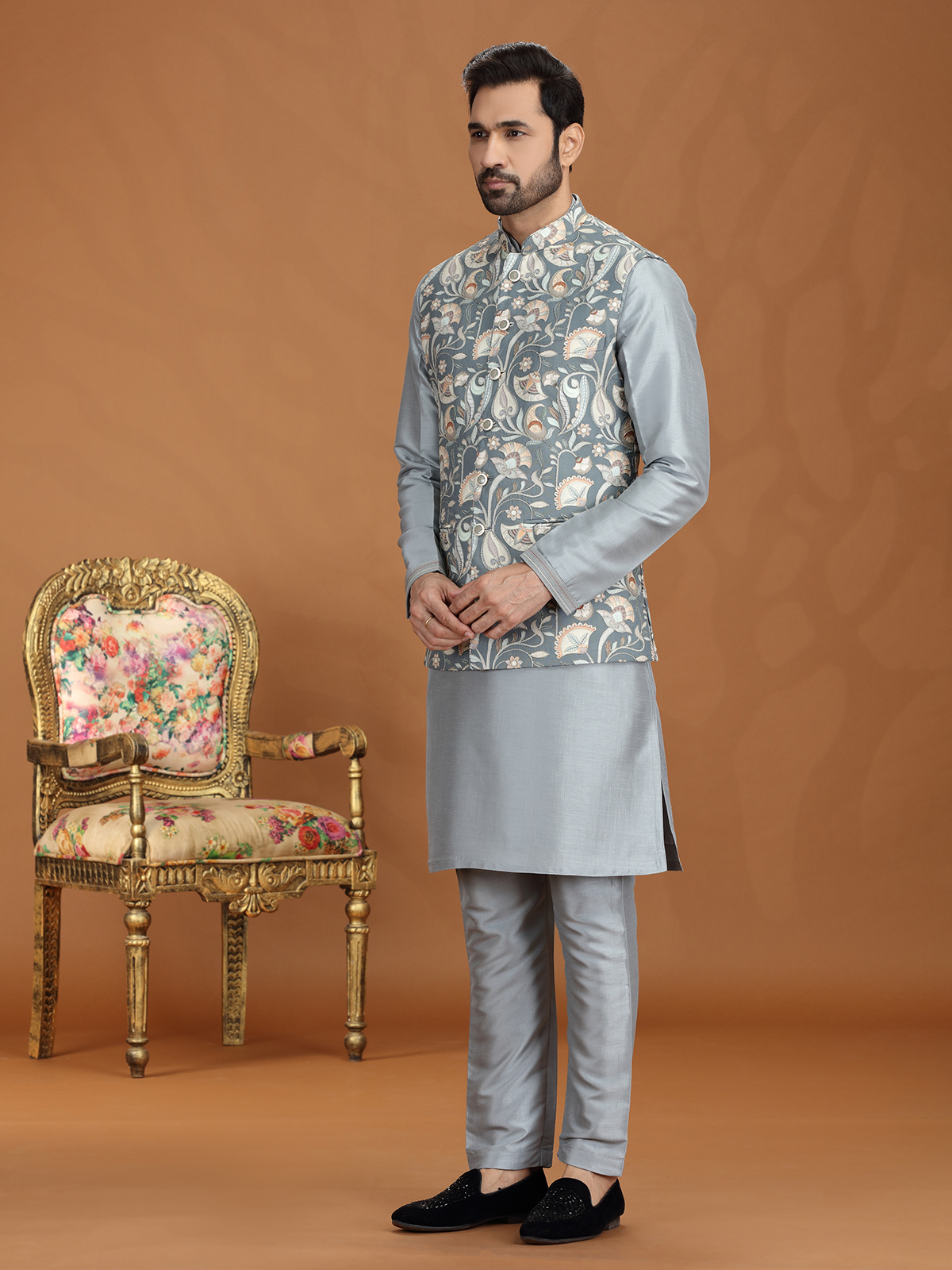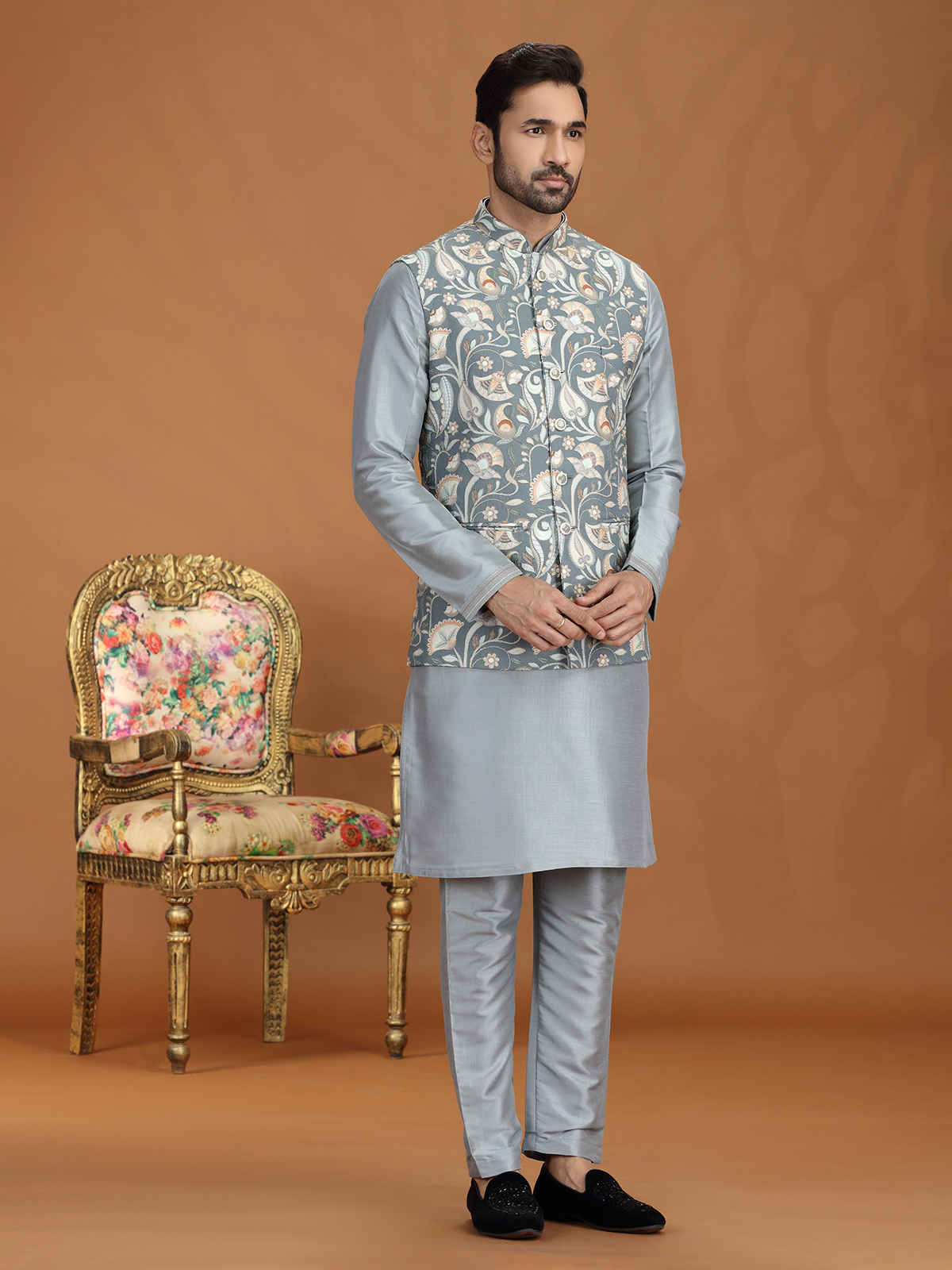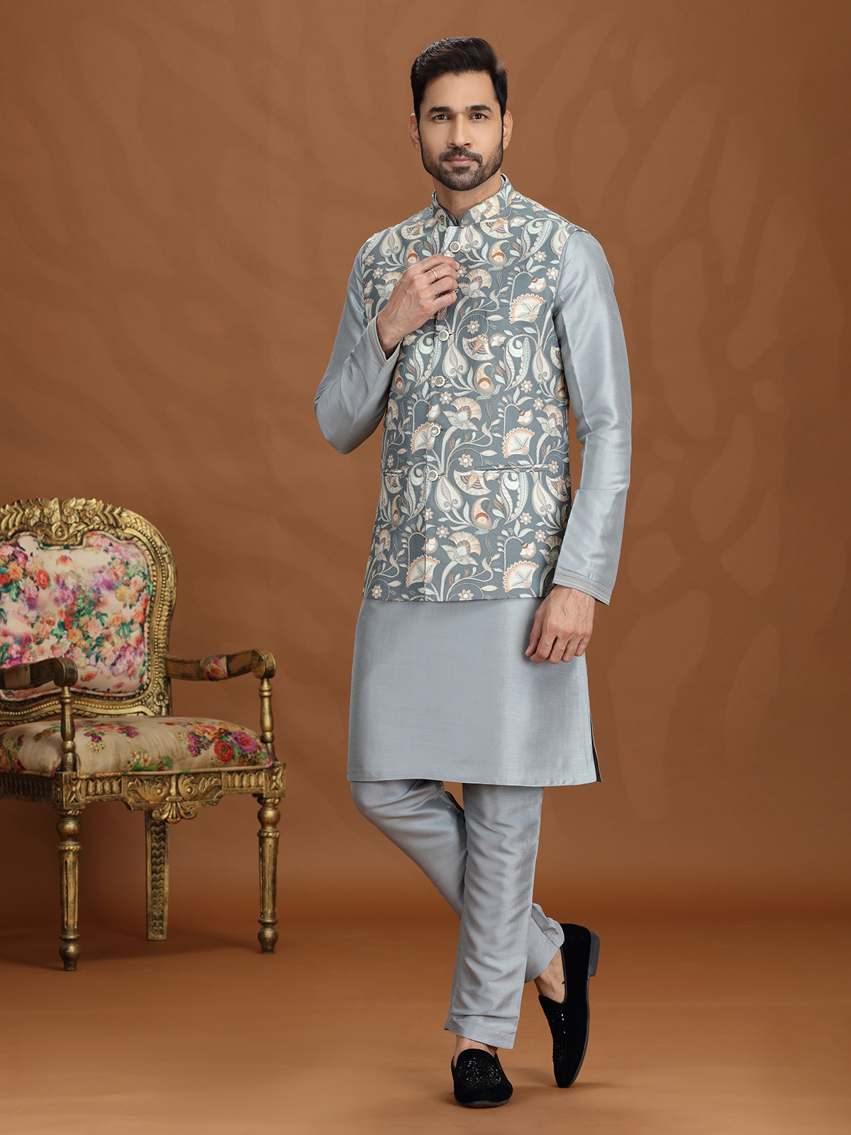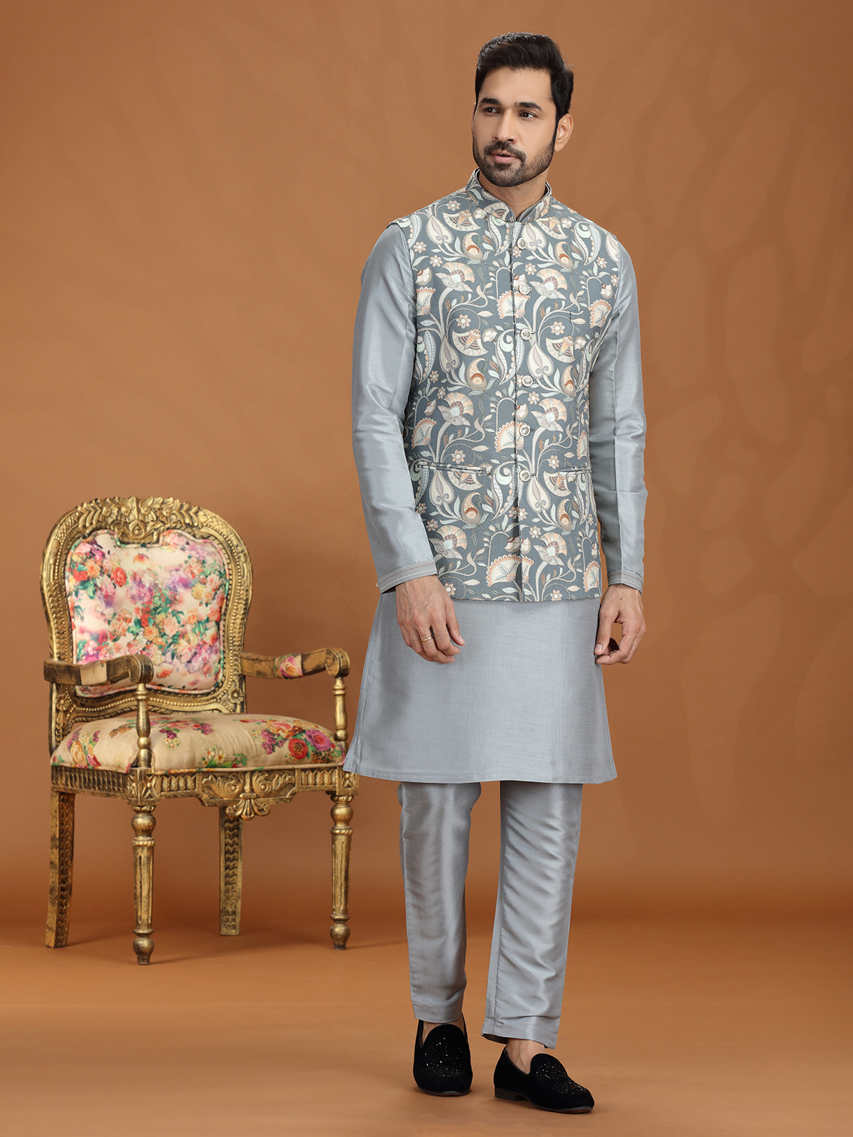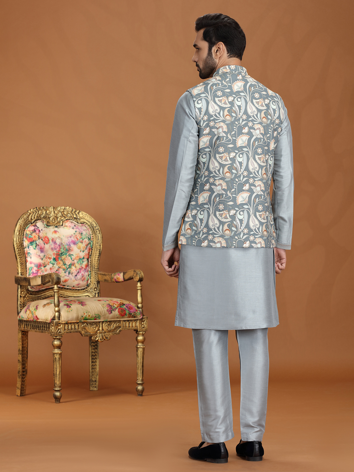 Grace your celebrations in this grey silk waistcoat set, highlighted with intricate silver zari weaving over refined prints. Designed with a smart Chinese collar and matching pant, it offers both tradition and class. Perfect for weddings, receptions, and festive wear, this outfit fuses artisanal craftsmanship with a modern edge for an effortlessly regal statement.
