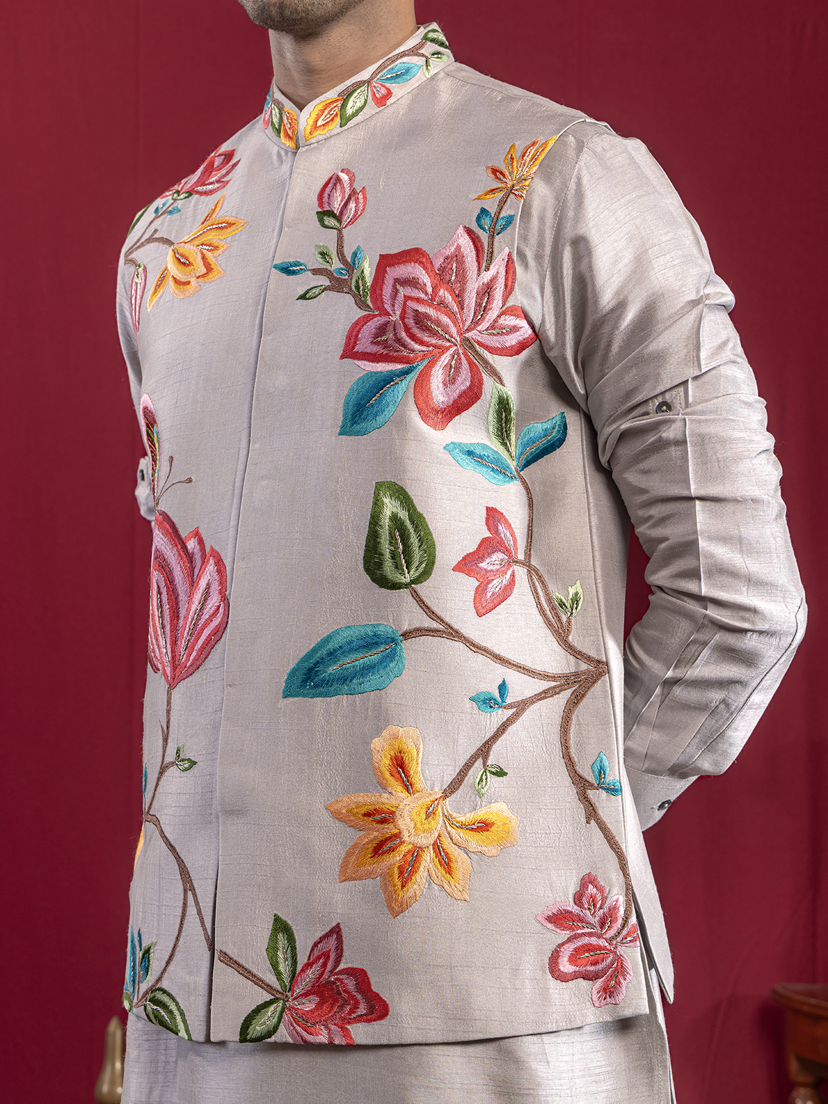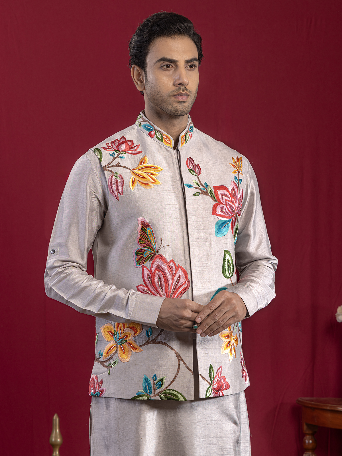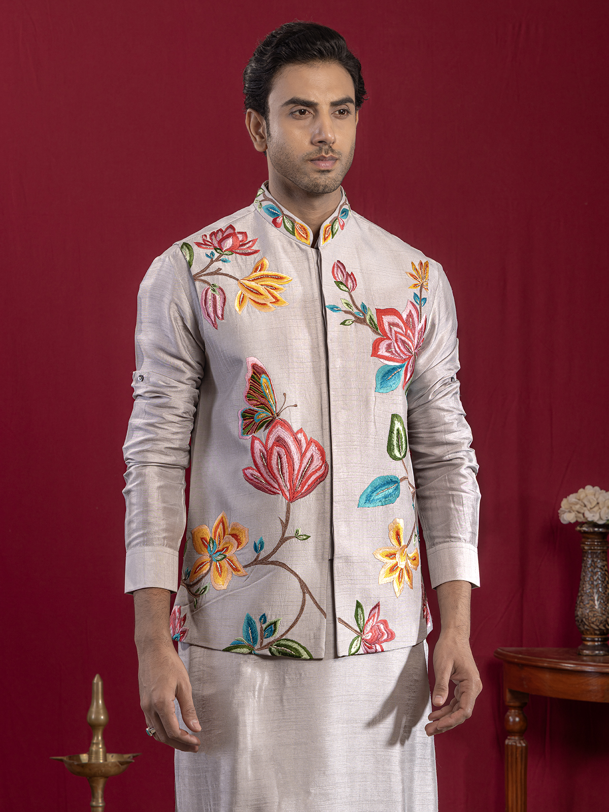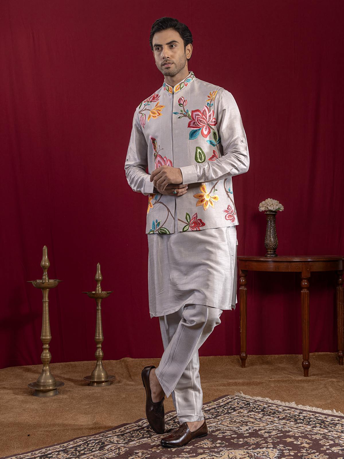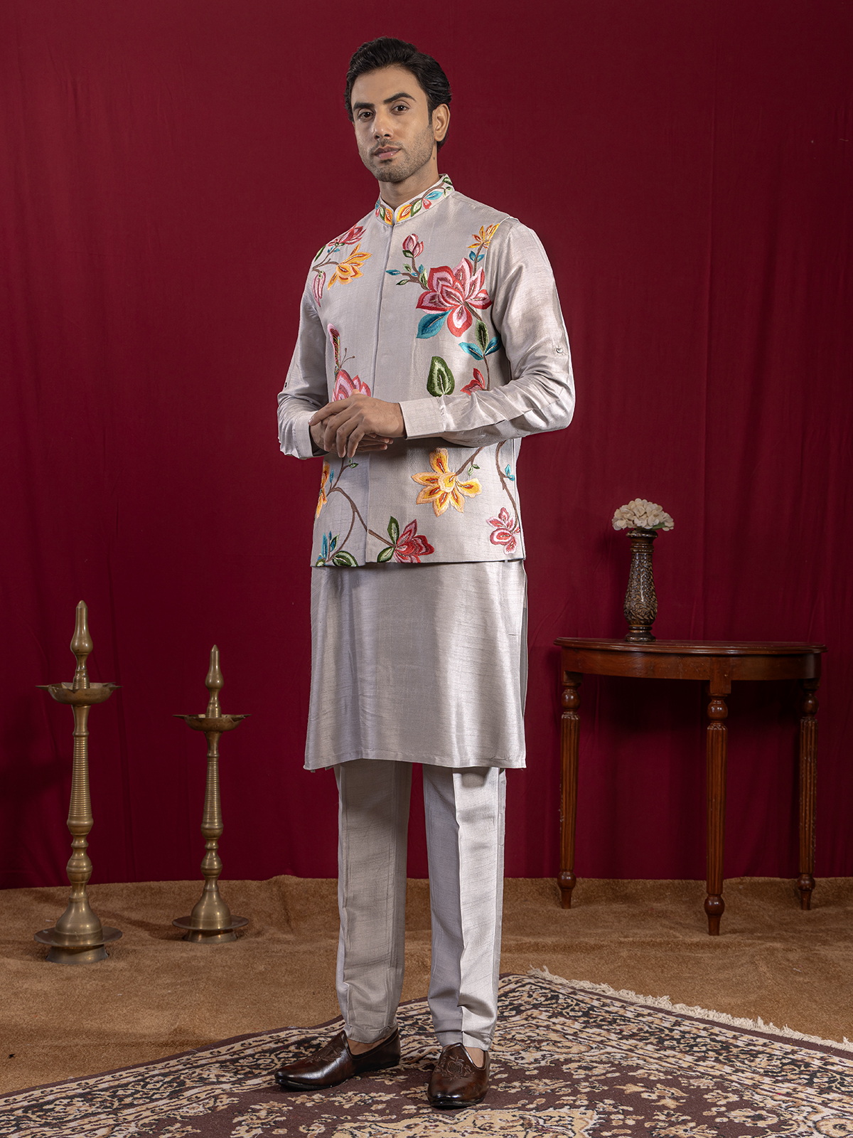 Command attention in this luxurious grey silk waistcoat set, detailed with intricate embroidery and zardosi work. The sleeveless mandarin-collar waistcoat, complemented by a full-sleeve kurta and pant, makes a statement of royal sophistication for weddings and festive celebrations.