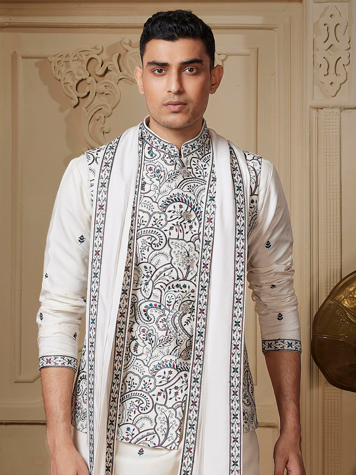 Ivory Raw Silk Kurta Jacket Set With Matching Dupatta