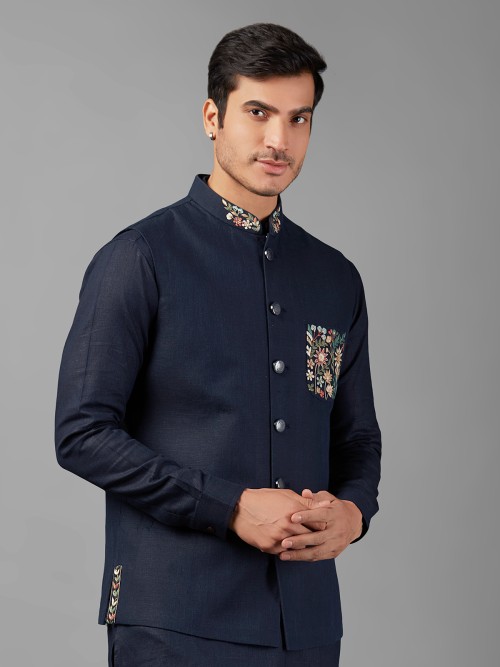 Achieve a distinctive look with our navy linen waistcoat set featuring enchanting embroidery work. Complete with a coordinating bottom for effortless style.
