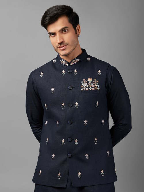 Display your chic sense of style with our trendy navy linen waistcoat set featuring intricate embroidery and sequin work. This ensemble is perfect for making a statement and comes with a bottom for effortless elegance.
