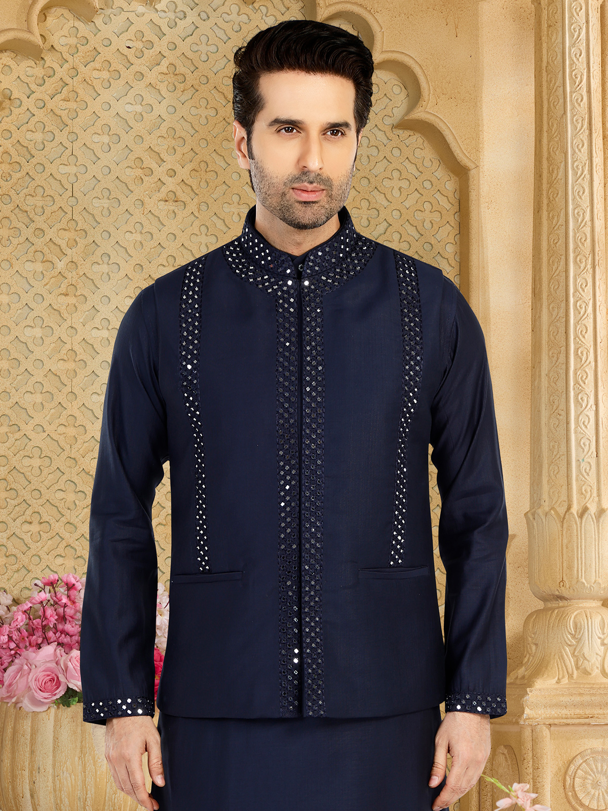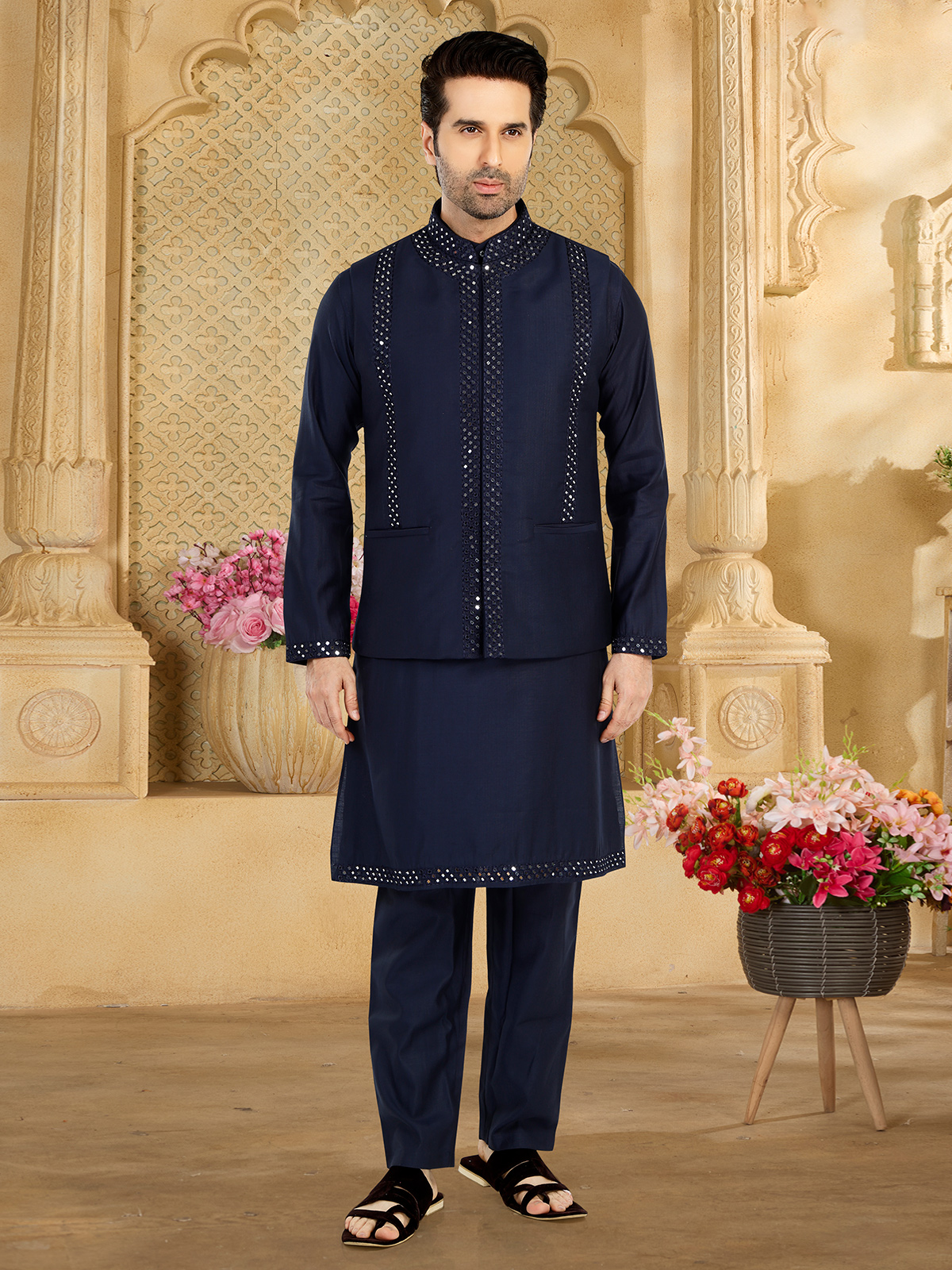 Make a statement in our navy silk waistcoat set, crafted to perfection. Embellished with mirror and resham work, it exudes elegance and sophistication. Complete with a bottom for effortless coordination.