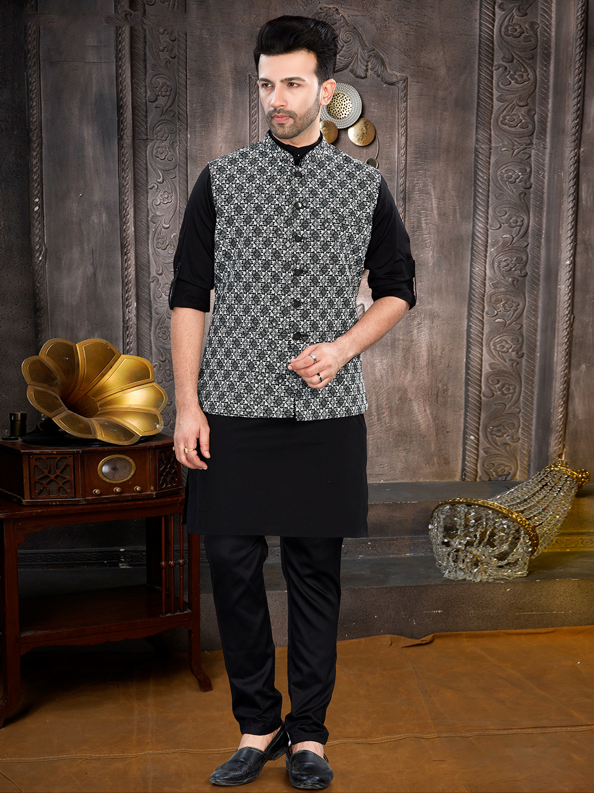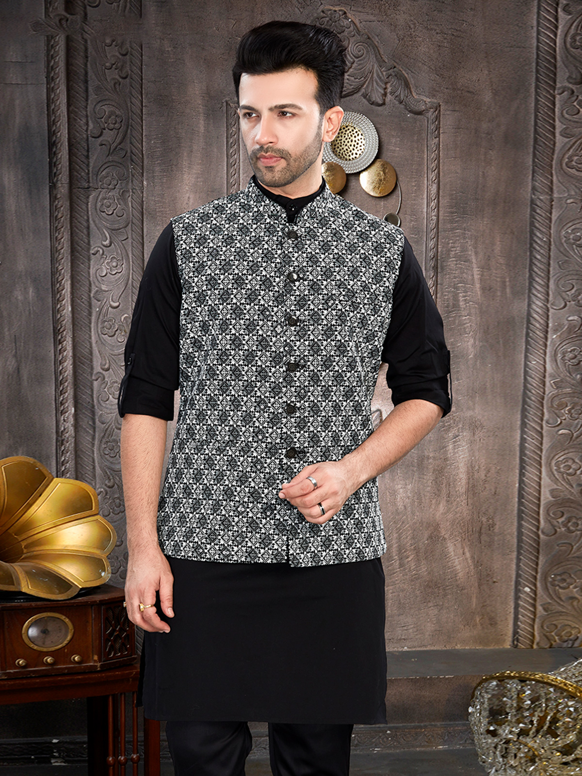 Prepare to turn heads with this stunning black silk waistcoat set, adorned with exquisite embroidery work. Comes with a coordinating bottom piece for effortless style.