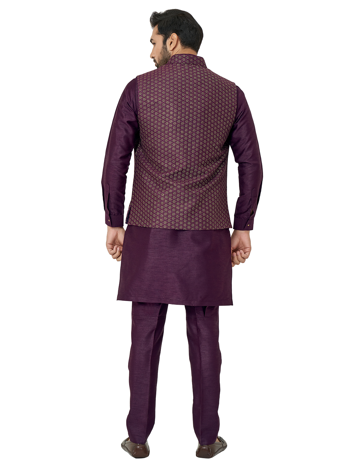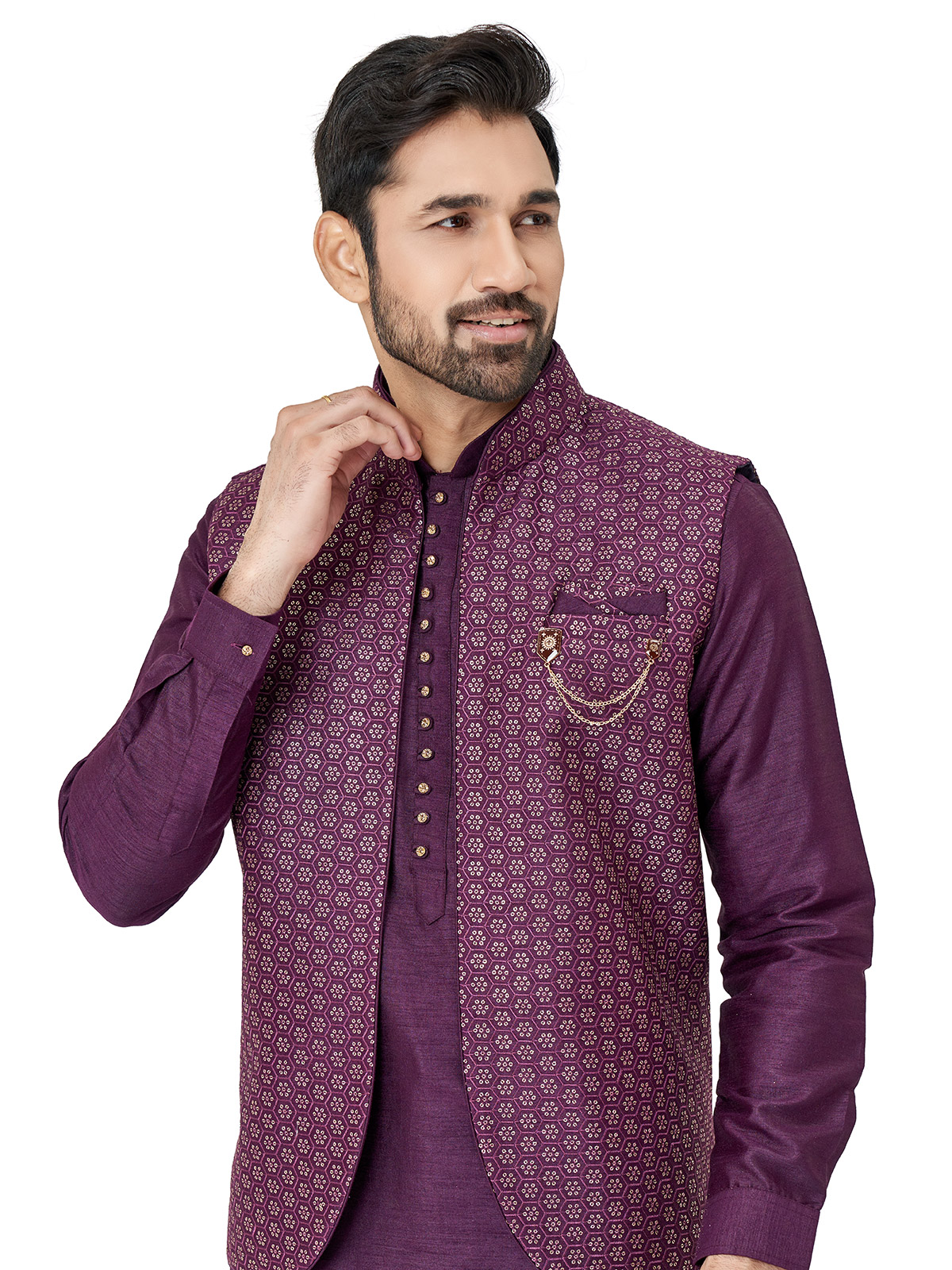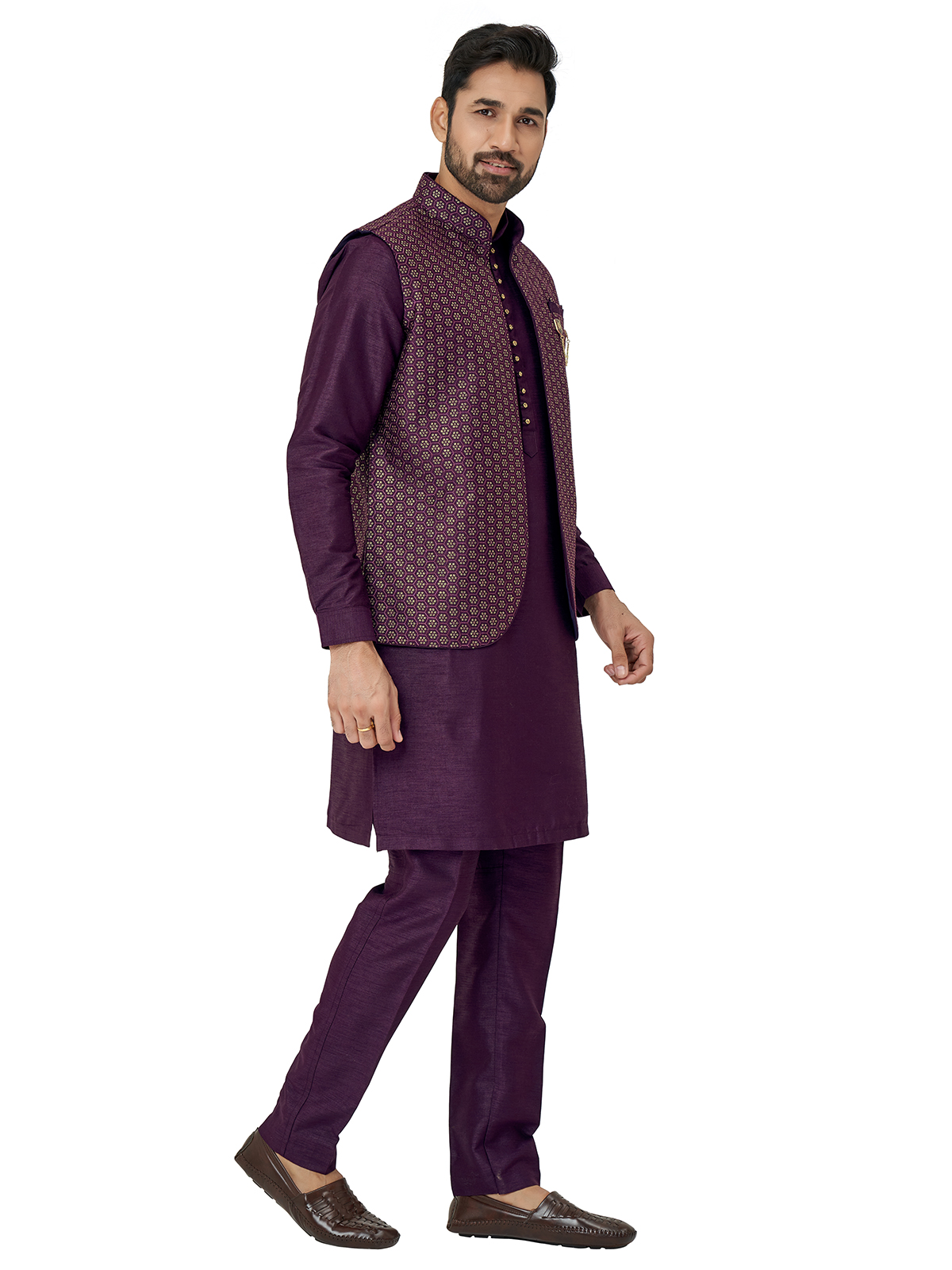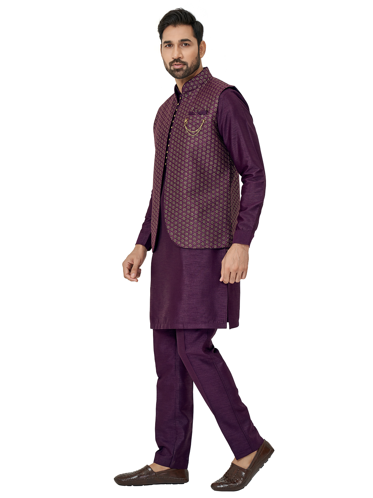 Make a bold statement with this lavish purple silk waistcoat set, designed for wedding wear. Crafted from premium silk fabric and adorned with intricate embroidery and sequins work, this waistcoat set features a stylish mandarin collar and a welt pocket with pocket tie. It also includes a full sleeves kurta and bottom for a complete look.