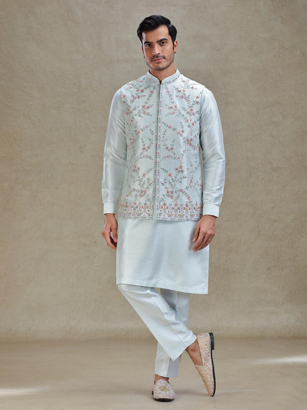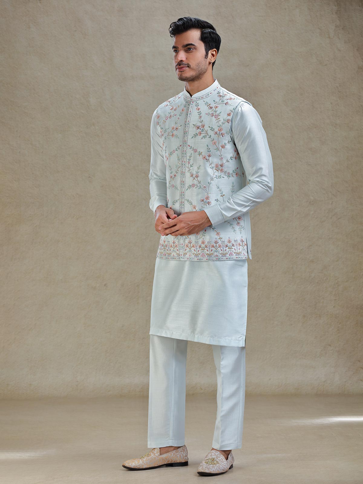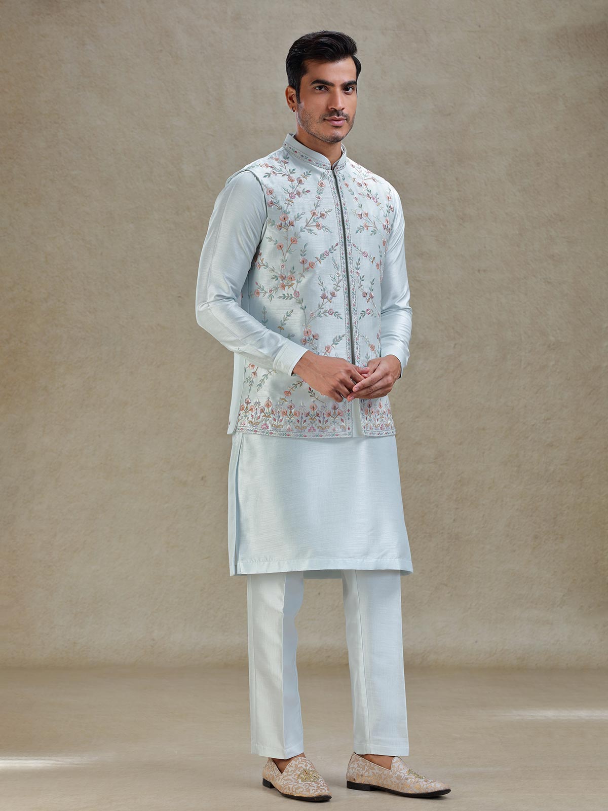 Light Blue Kurta Jacket Set For Men In Linen Silk For Reception