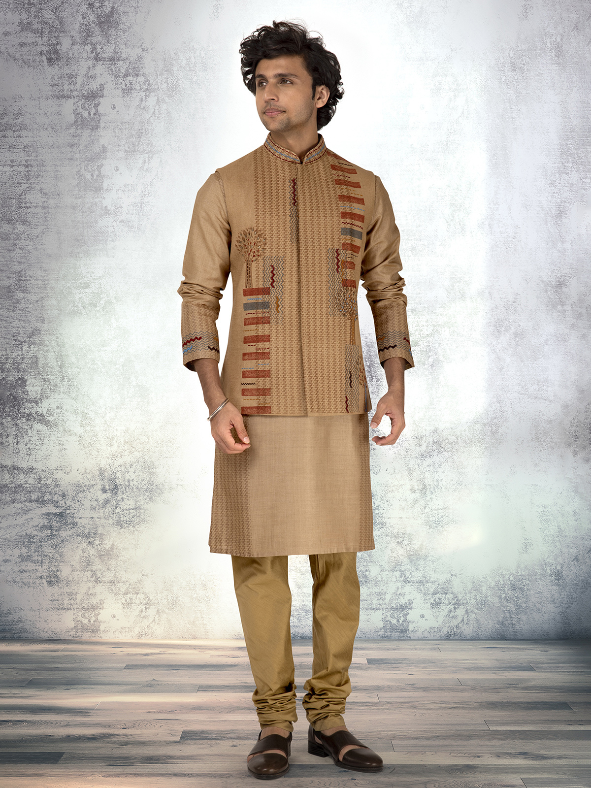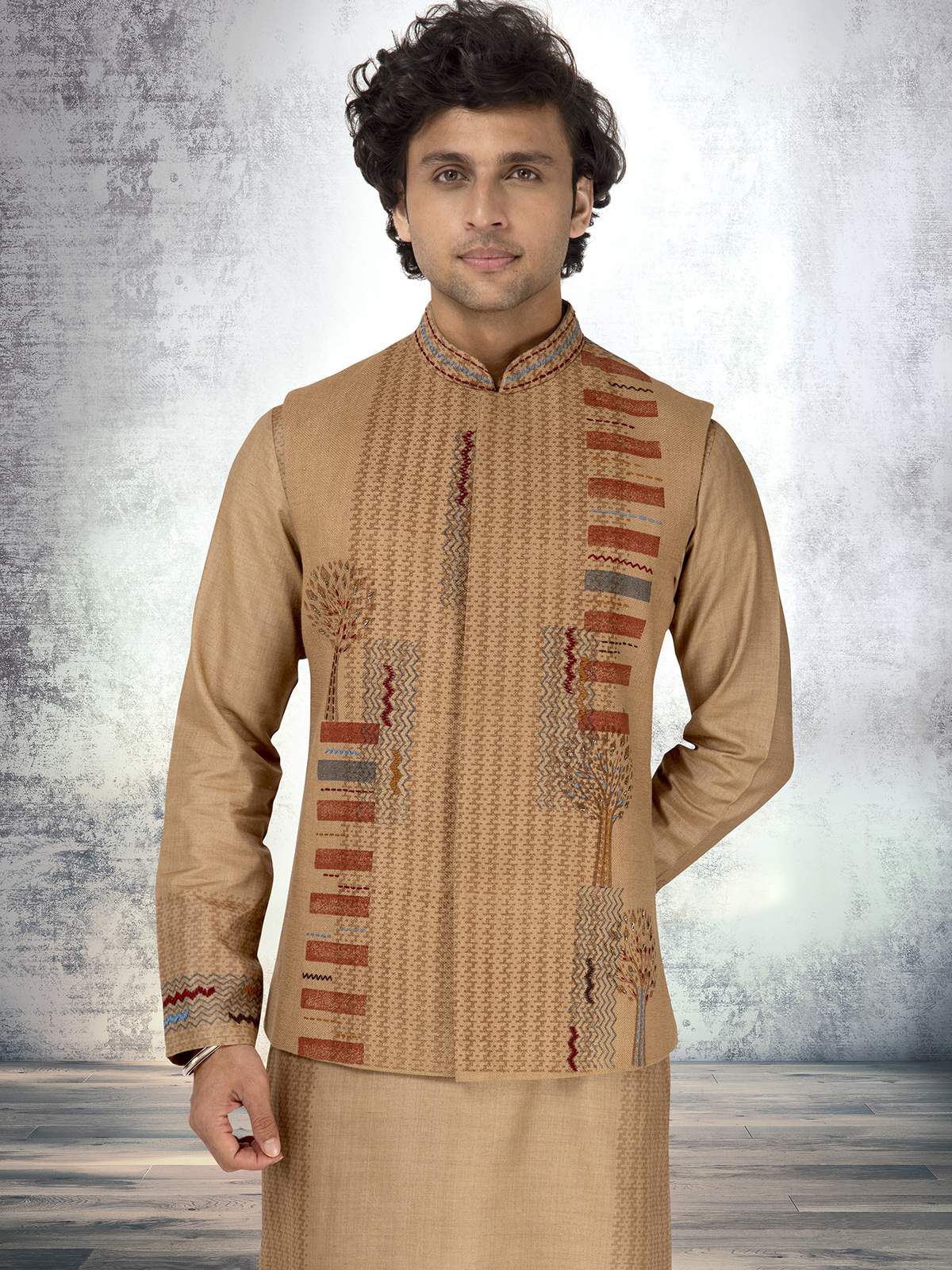 Light Brown Jute And Munga Silk Printed Waistcoat Set