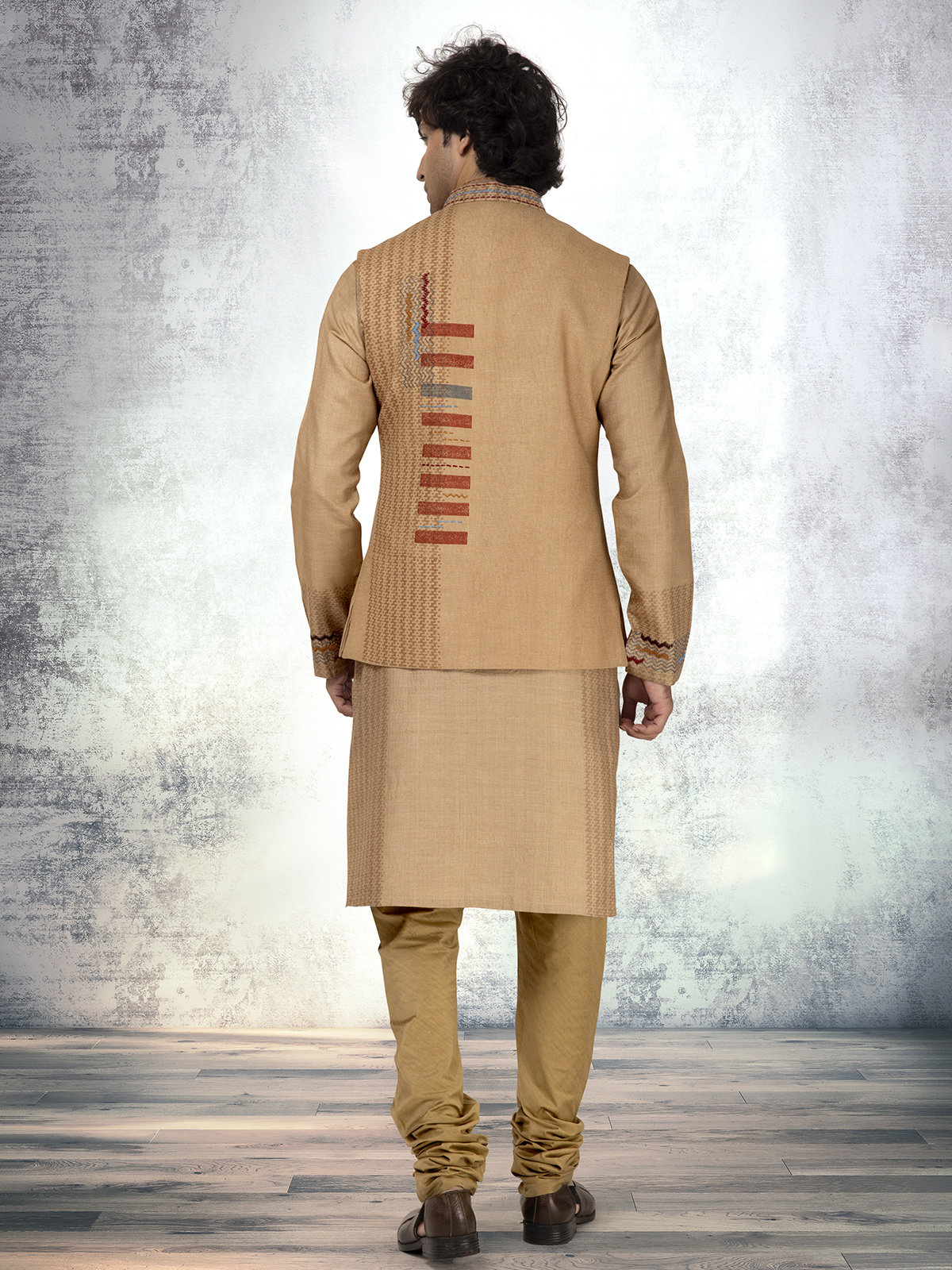 This light brown waistcoat set blends pure jute with Munga silk, creating a harmony of rustic texture and refined artistry. Its soft print and warm tone make it ideal for weddings or festive gatherings. Completed with pants for balanced sophistication.