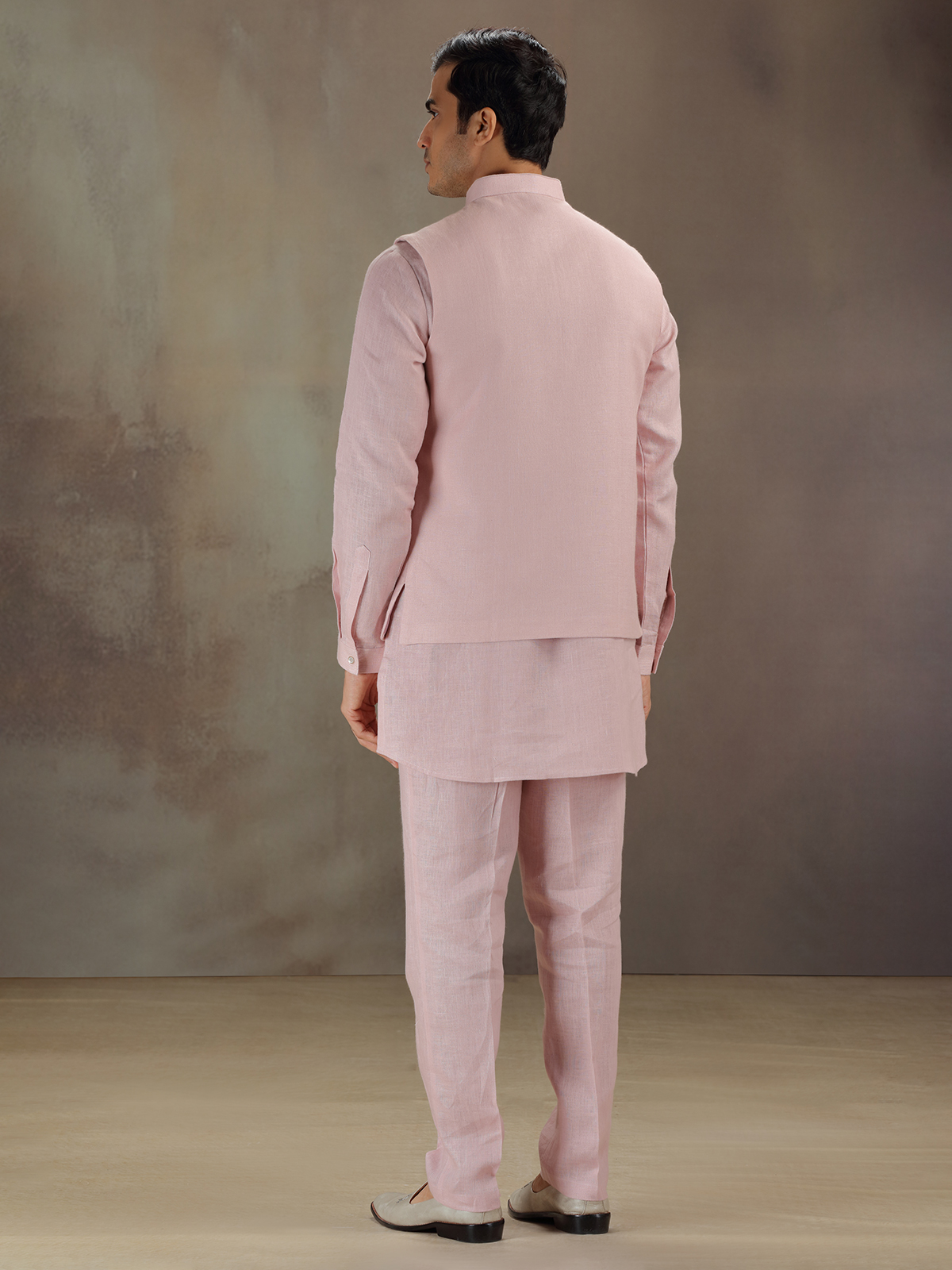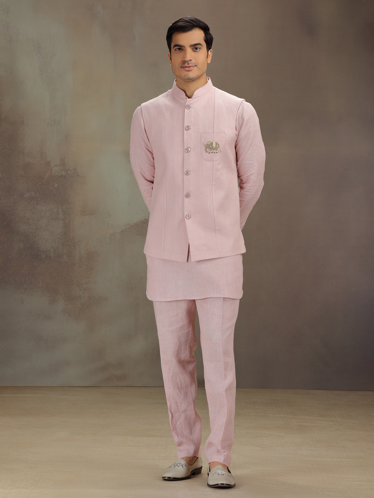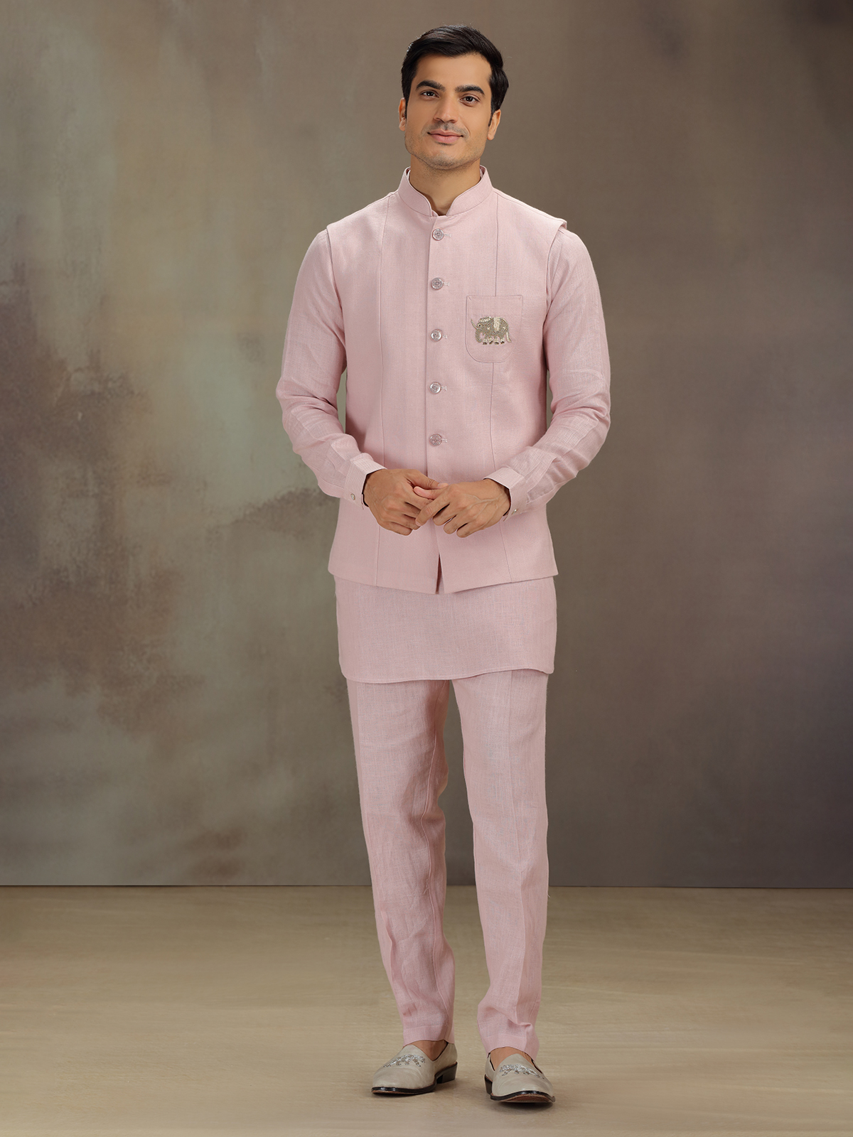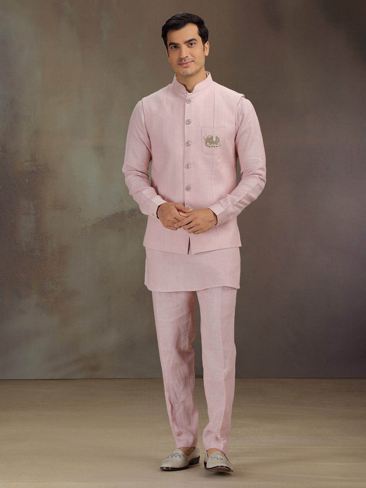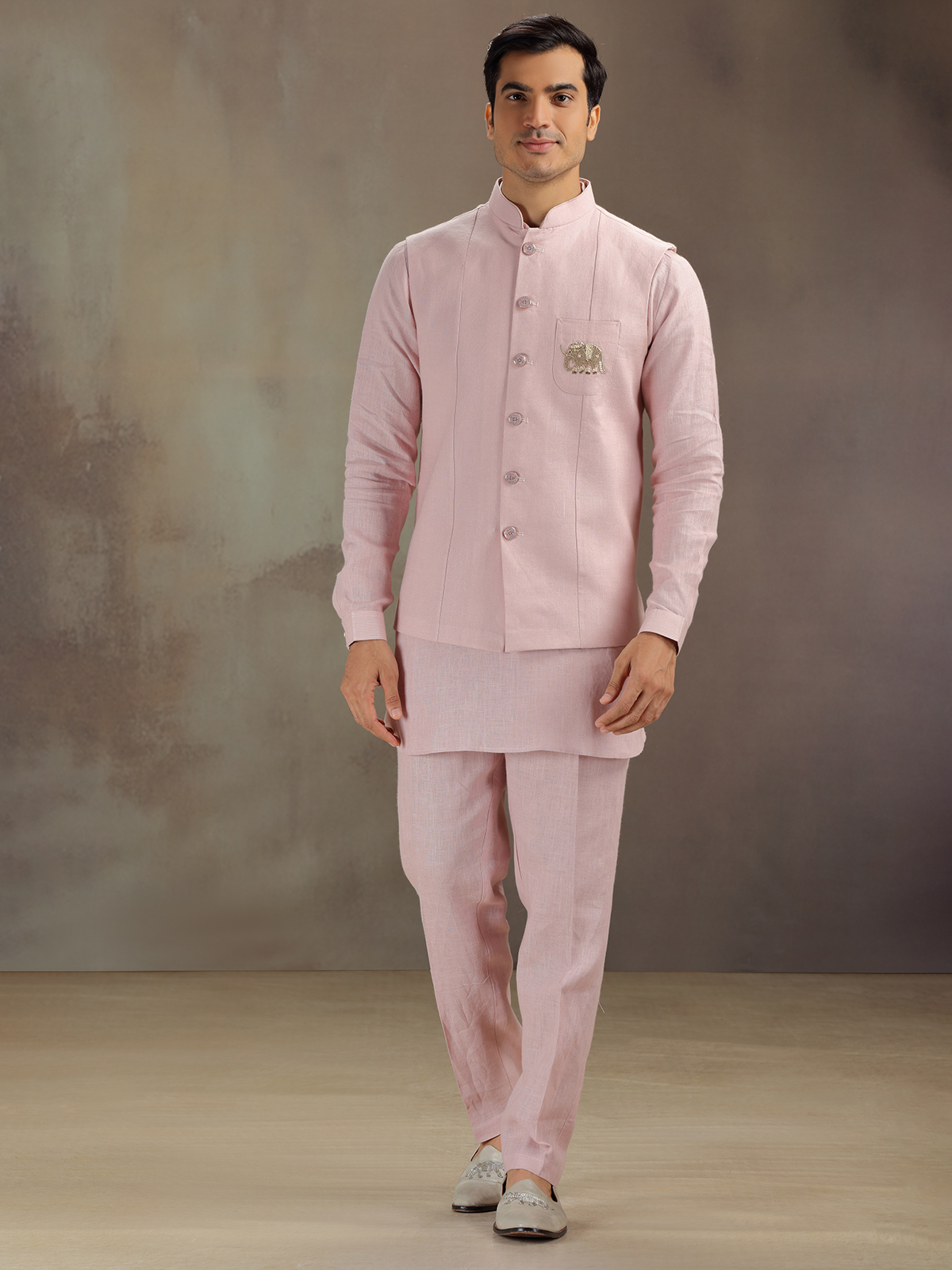 Crafted in tender light pink this linen waistcoat set shines with zardosi, sequins, and thread detailing. The sleeveless waistcoat complements a chinese-collared full-sleeve kurta. Paired with pant, it evokes grace fit for joyous ceremonies.