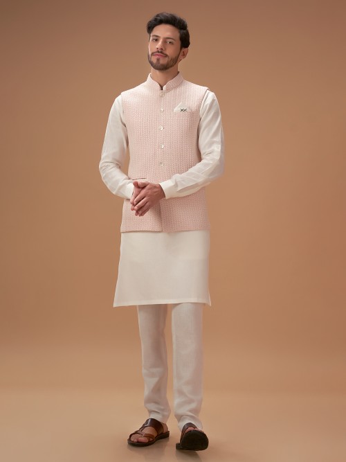 Embrace versatile style with a light pink cotton waistcoat set showcasing exquisite Lucknowi work. Paired with a coordinating bottom, this set is a graceful addition to your collection.