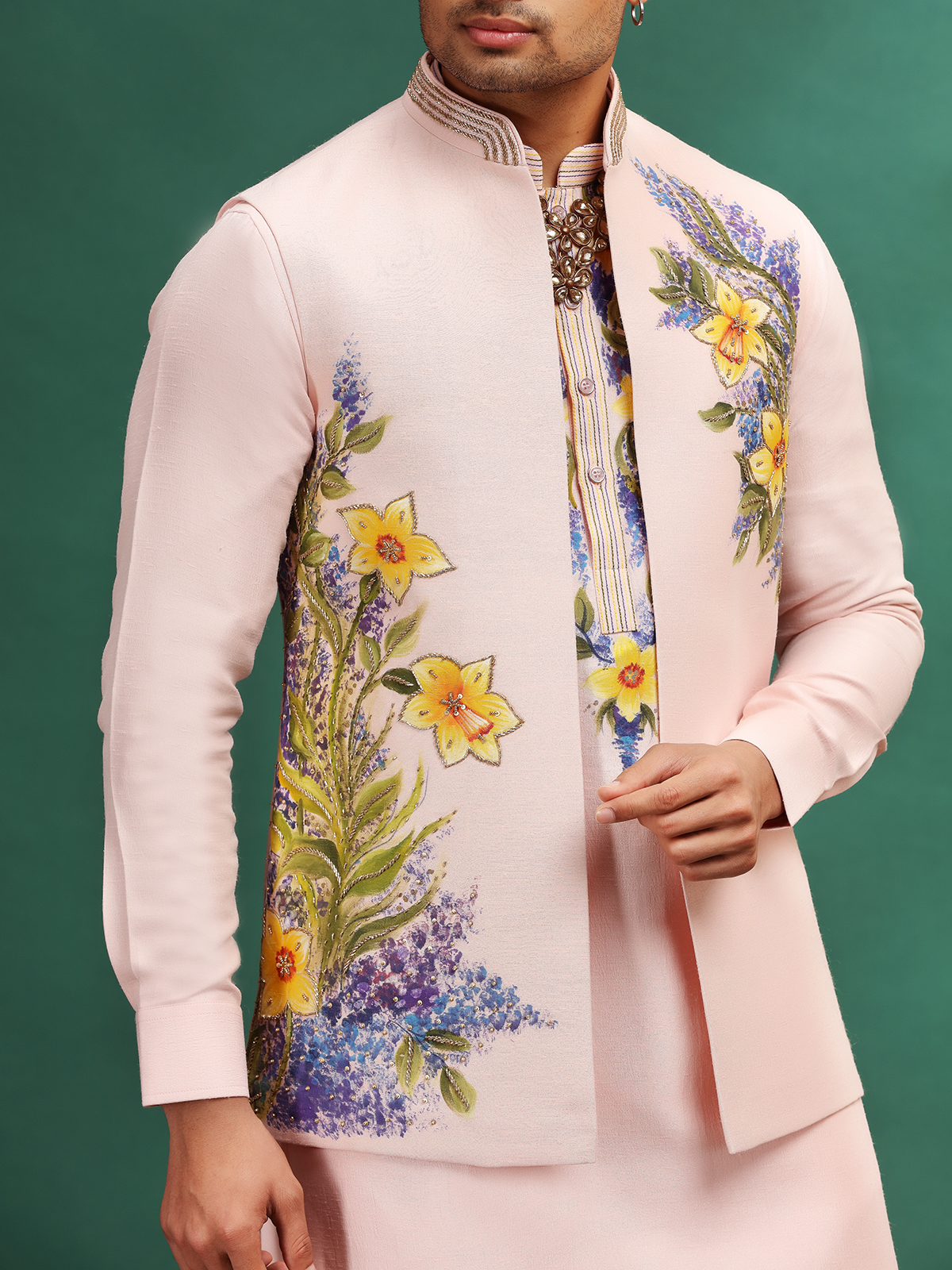 Bathed in soft light pink silk, this hand-printed waistcoat set gleams with sequins, beads, and cutdana that lend romantic sparkle. The sleeveless waistcoat and structured chinese collar paired with a full-sleeve kurta define graceful charm, finished with sleek pants for wedding elegance.