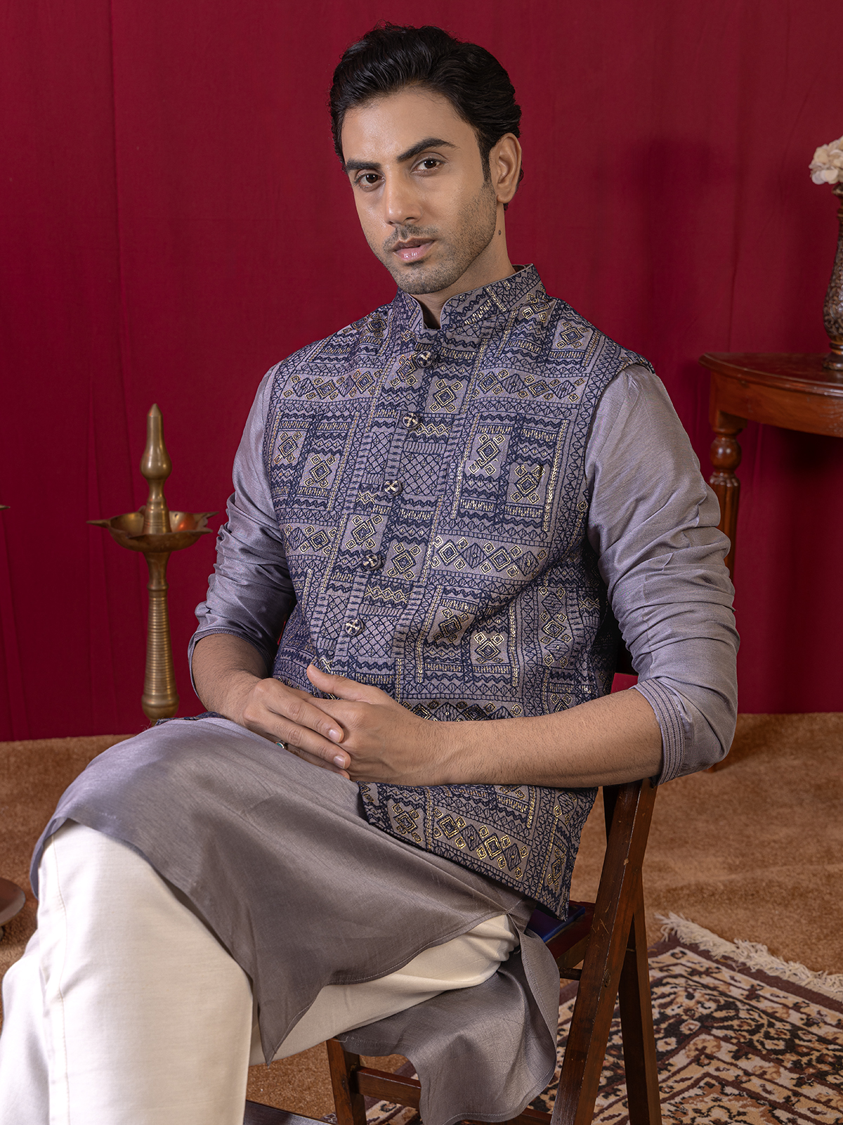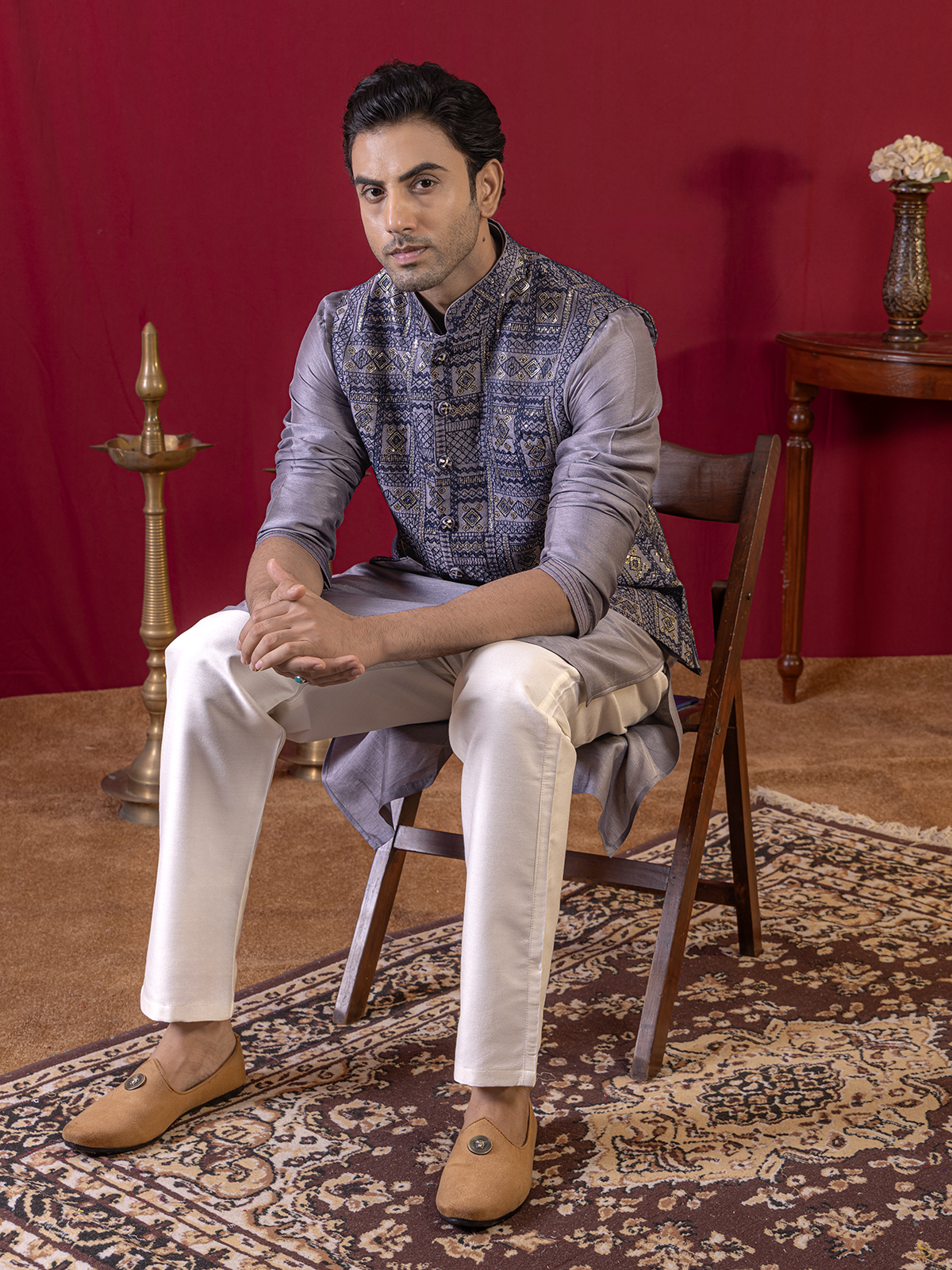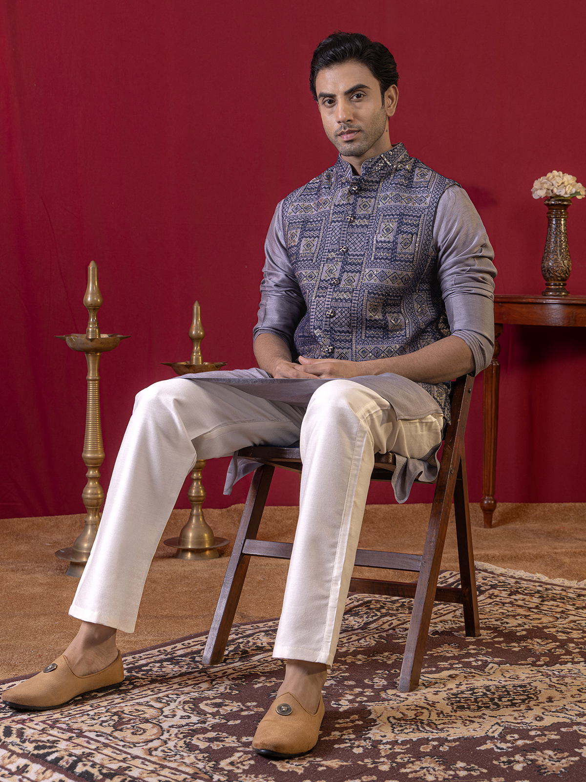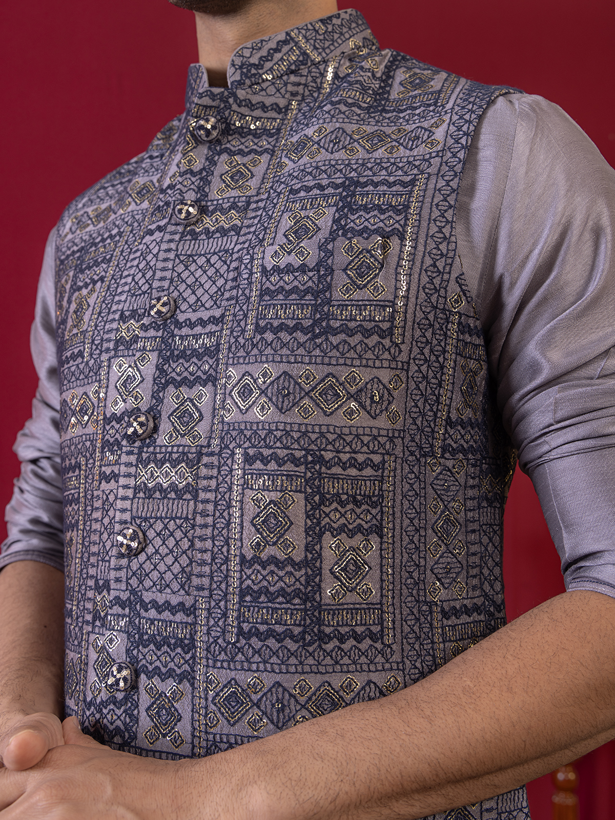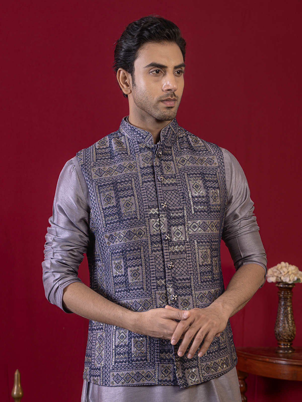 Grace your celebrations in this light purple silk waistcoat set, exquisitely adorned with sequins and thread work. The sleeveless mandarin-collar waistcoat pairs with a full-sleeve kurta and pant, radiating regal charm and sophistication for weddings, festive evenings, and grand family gatherings.