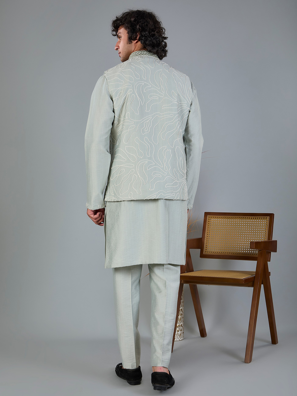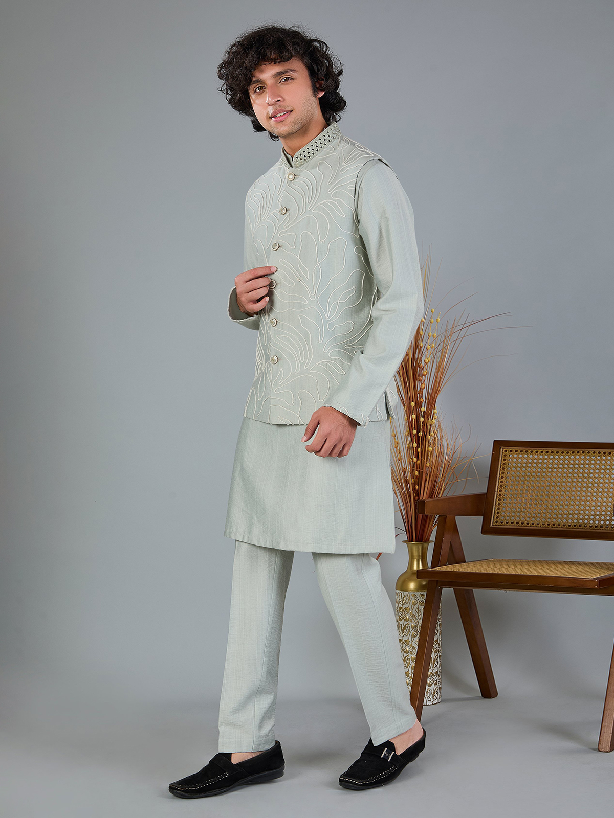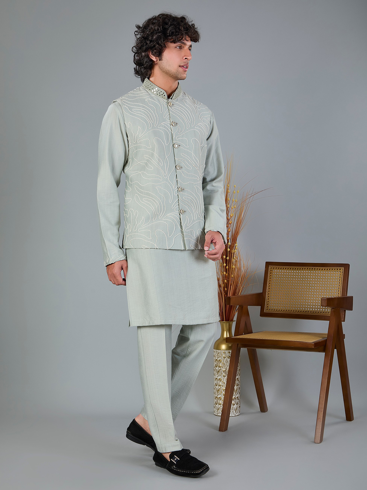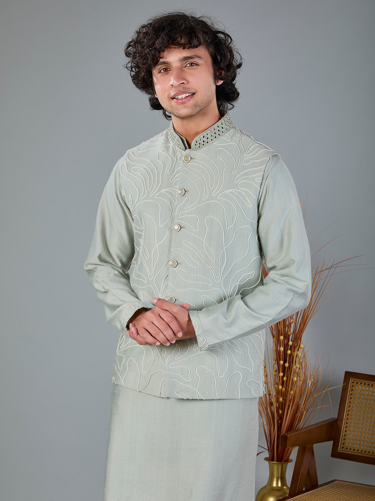 This light sage green silk waistcoat is enhanced with delicate aabla and thread work for understated elegance. Styled with a Chinese collar and matching pant, it is a graceful choice for weddings, festive events and receptions.