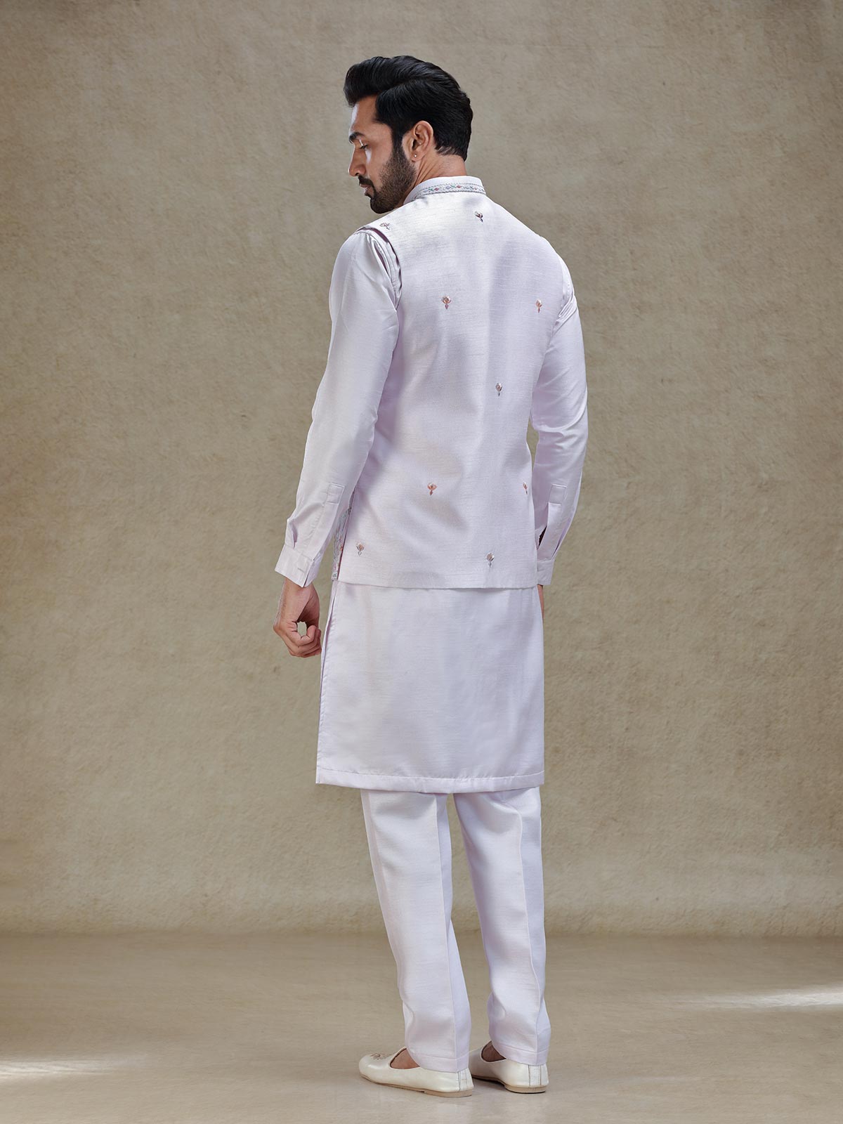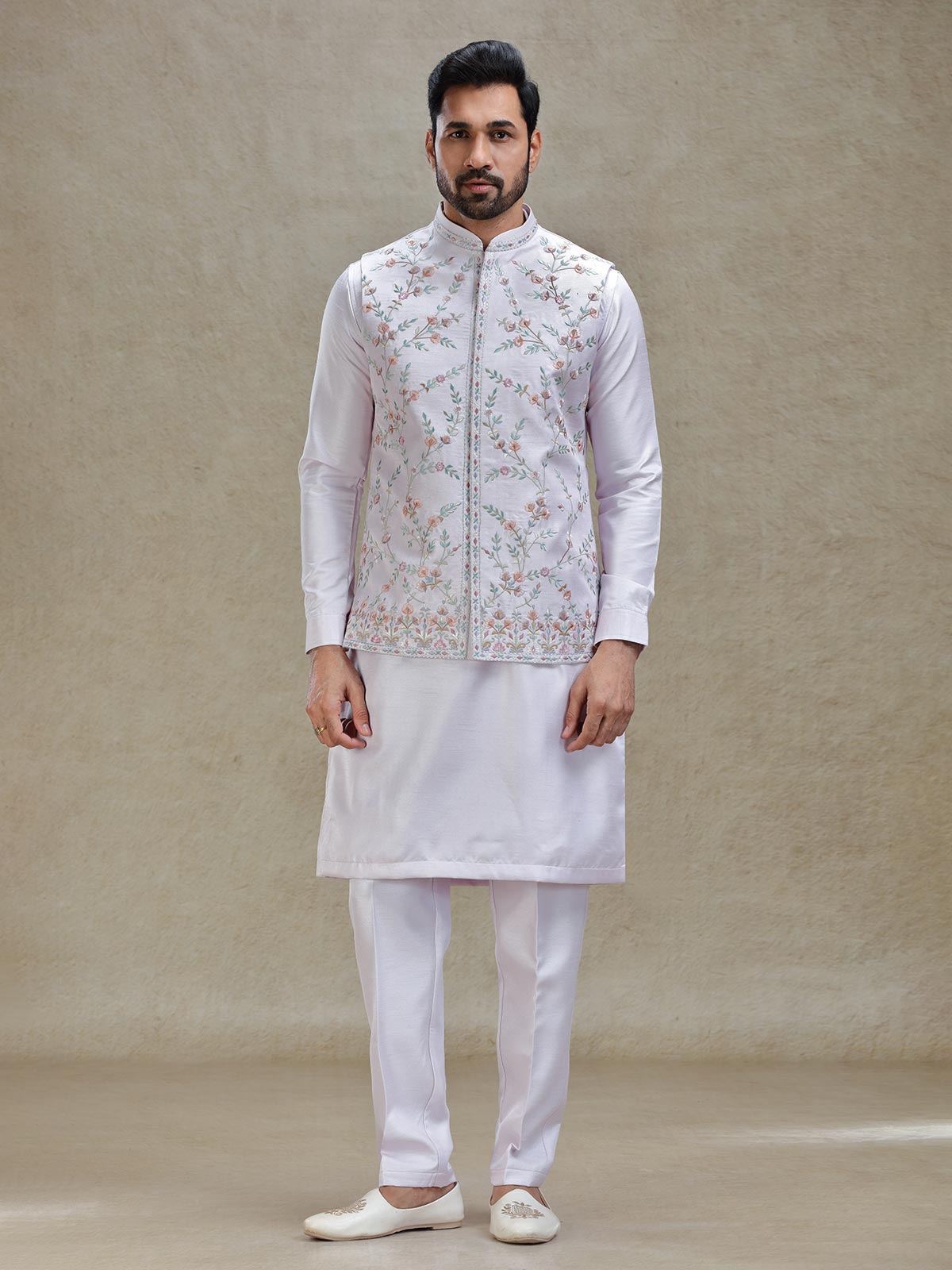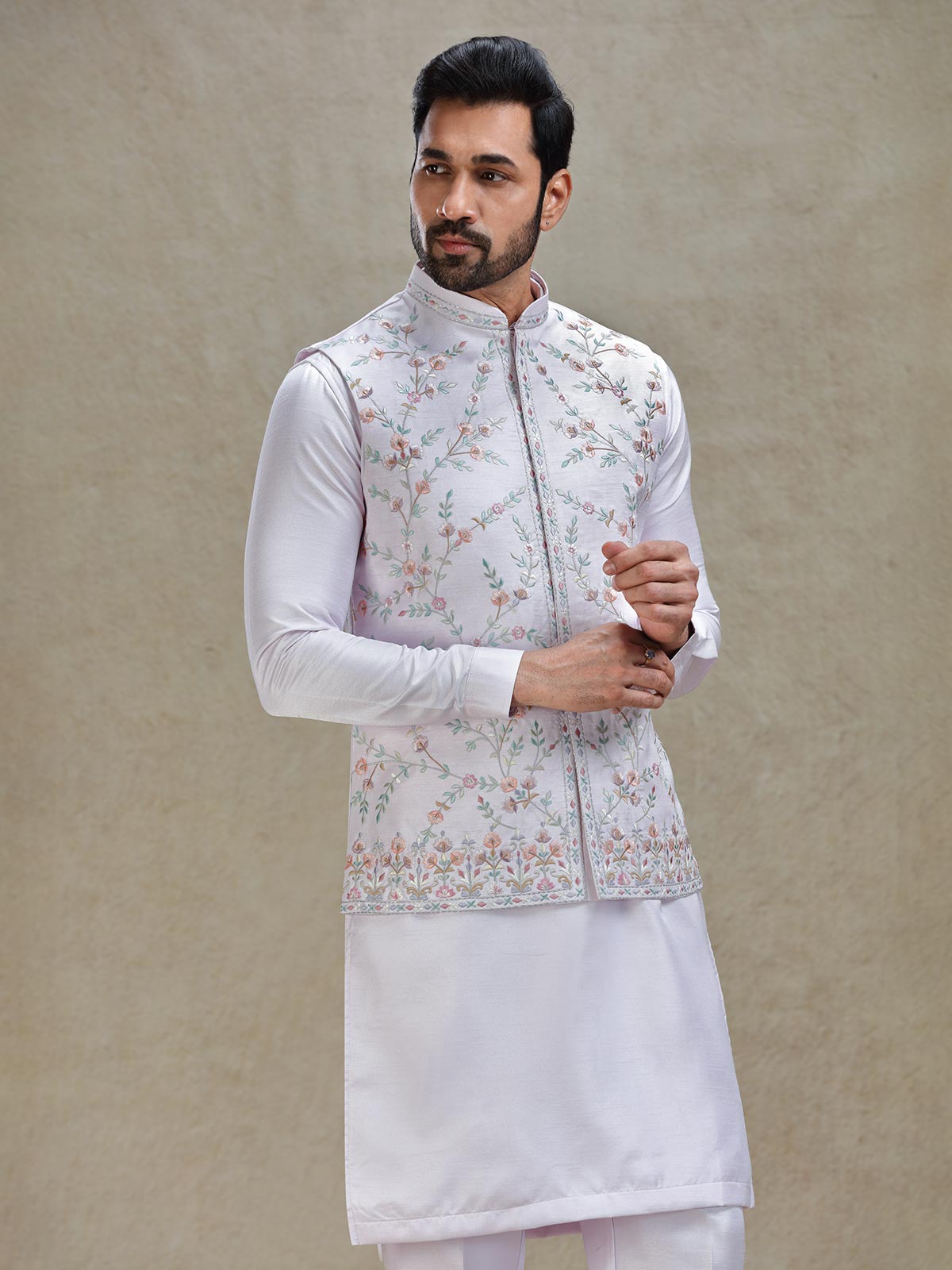 Lilac Purple Kurta Jacket Set In Colorful Resham And Embroidery For Mens