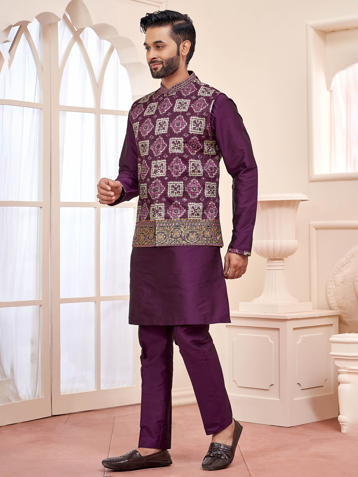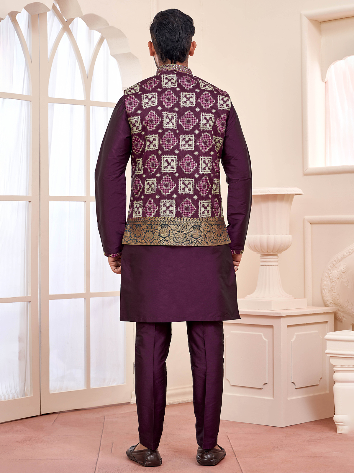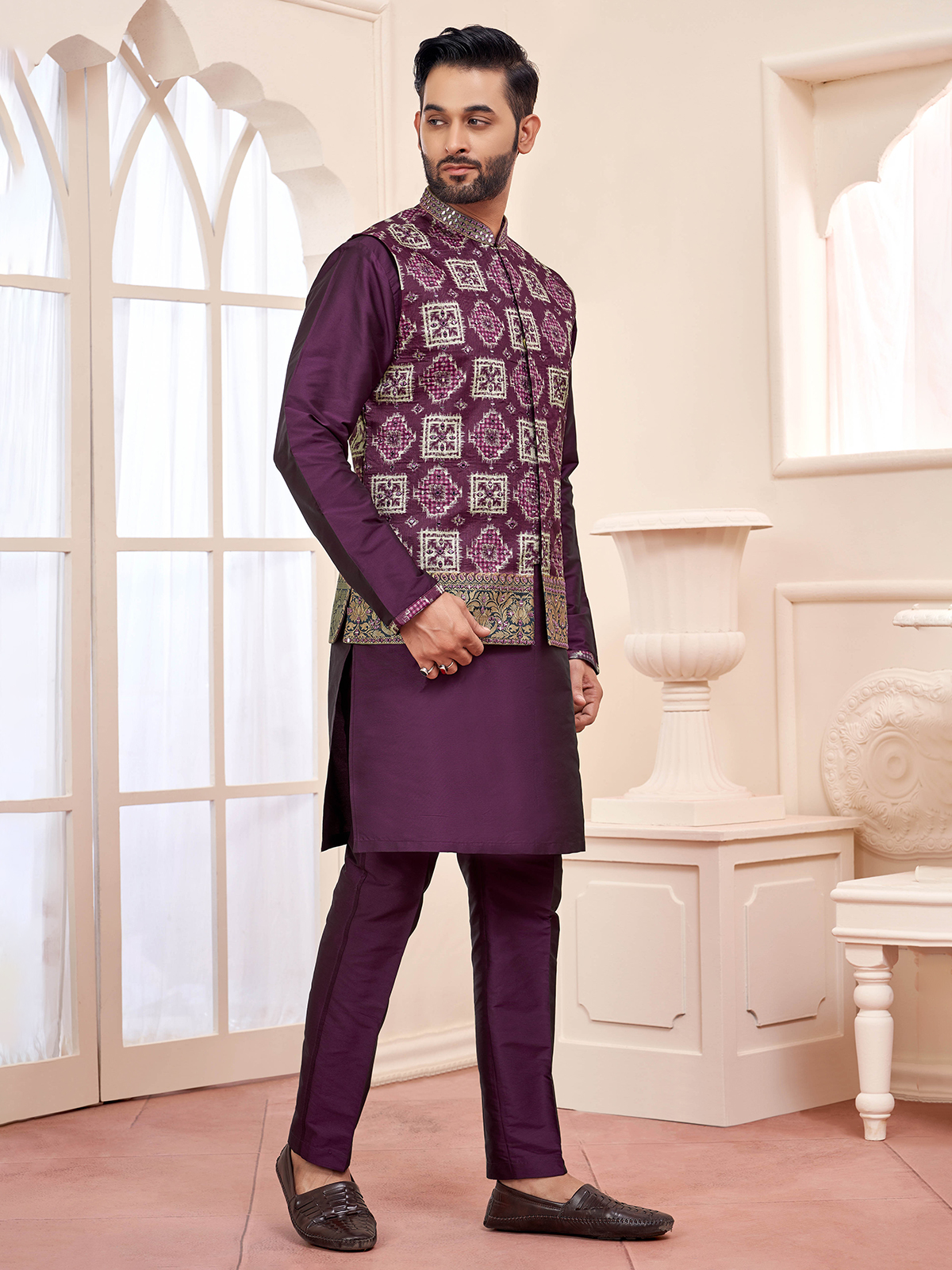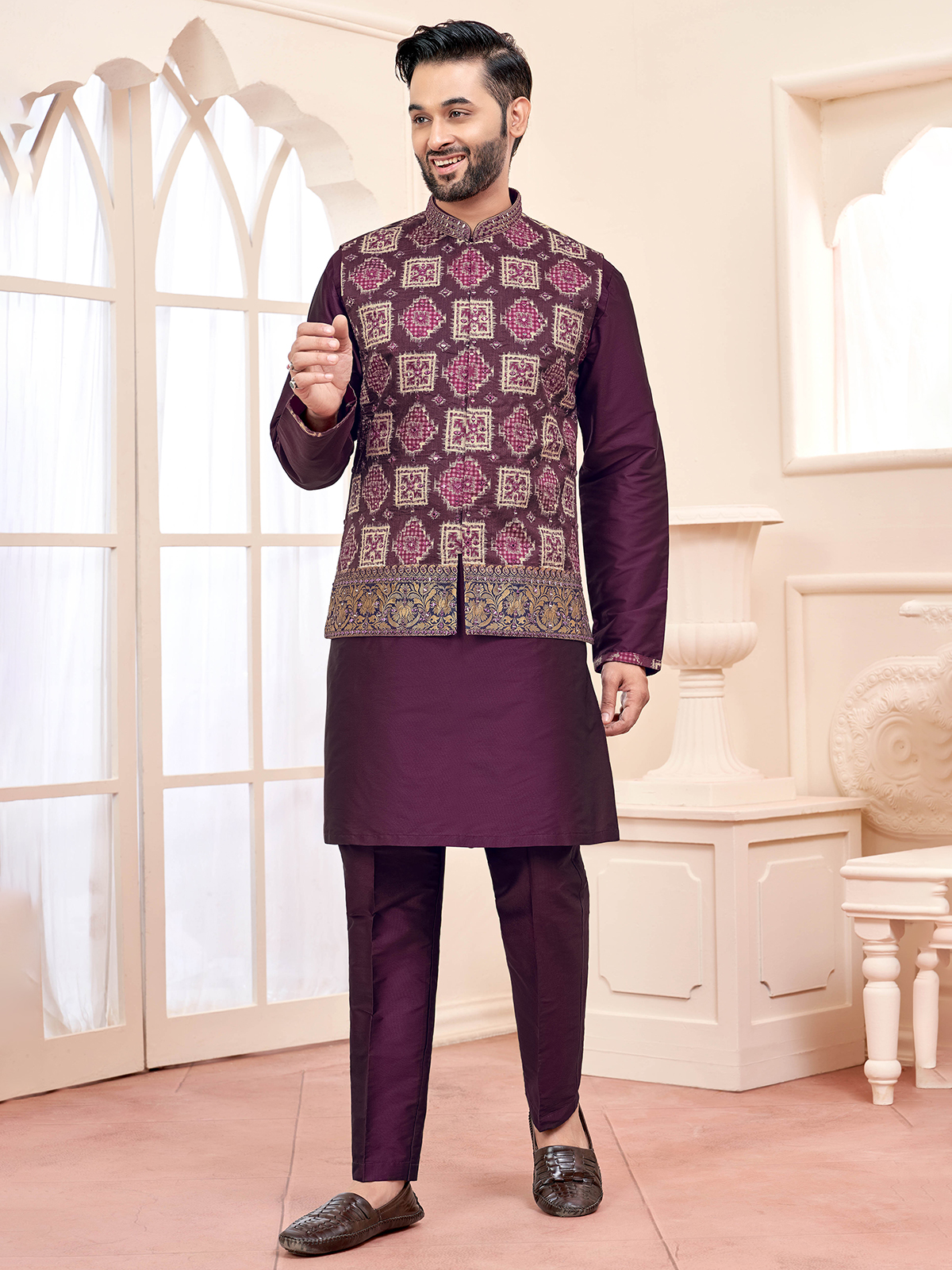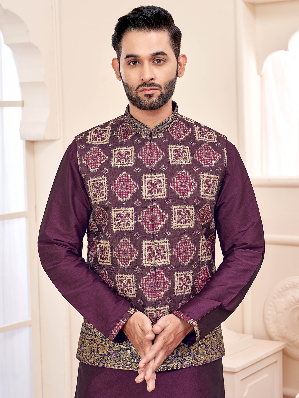 Exude elegance with this wine silk waistcoat set for men, crafted for weddings and festivals. Featuring intricate aabla work and zari embroidery, it brings a blend of traditional charm and contemporary style. The printed design and mandarin collar elevate the look, while the matching pants complete this stylish and festive ensemble.