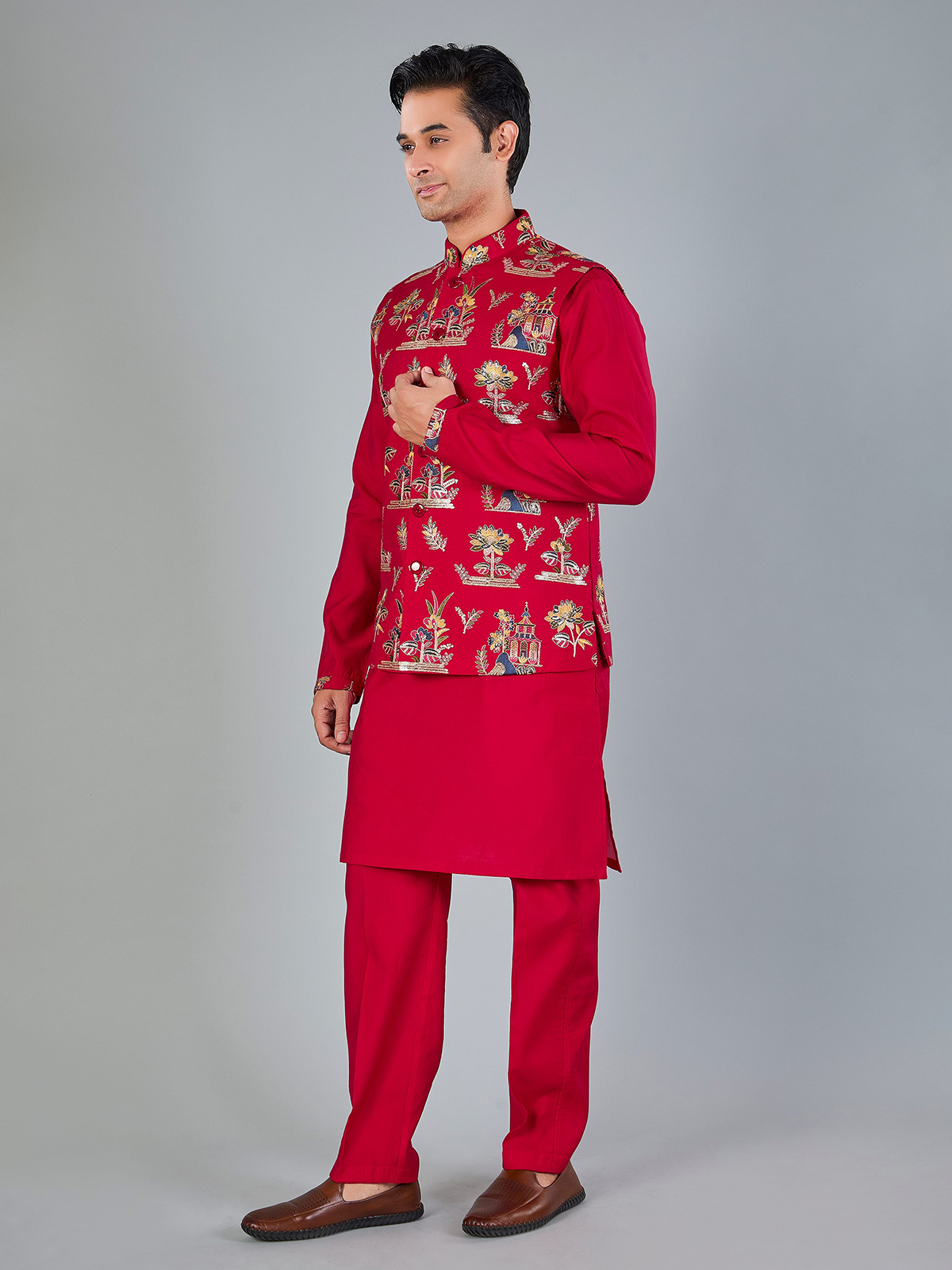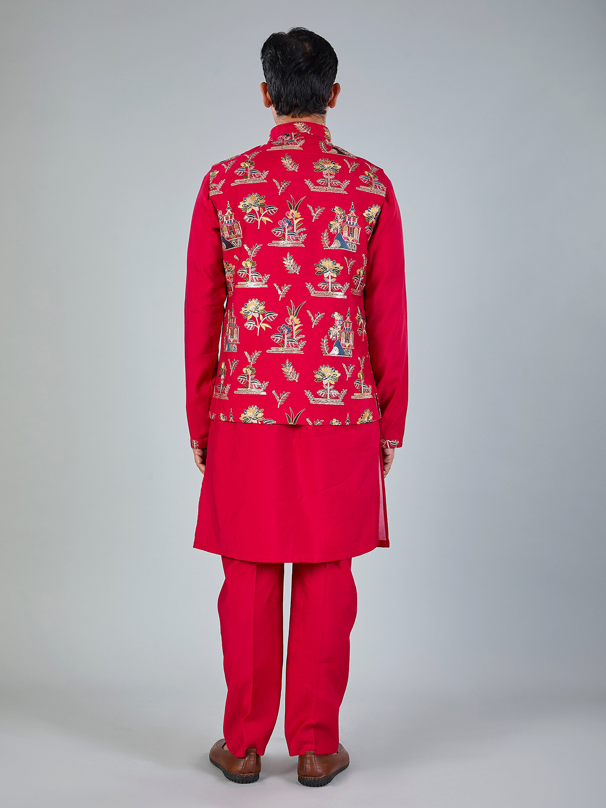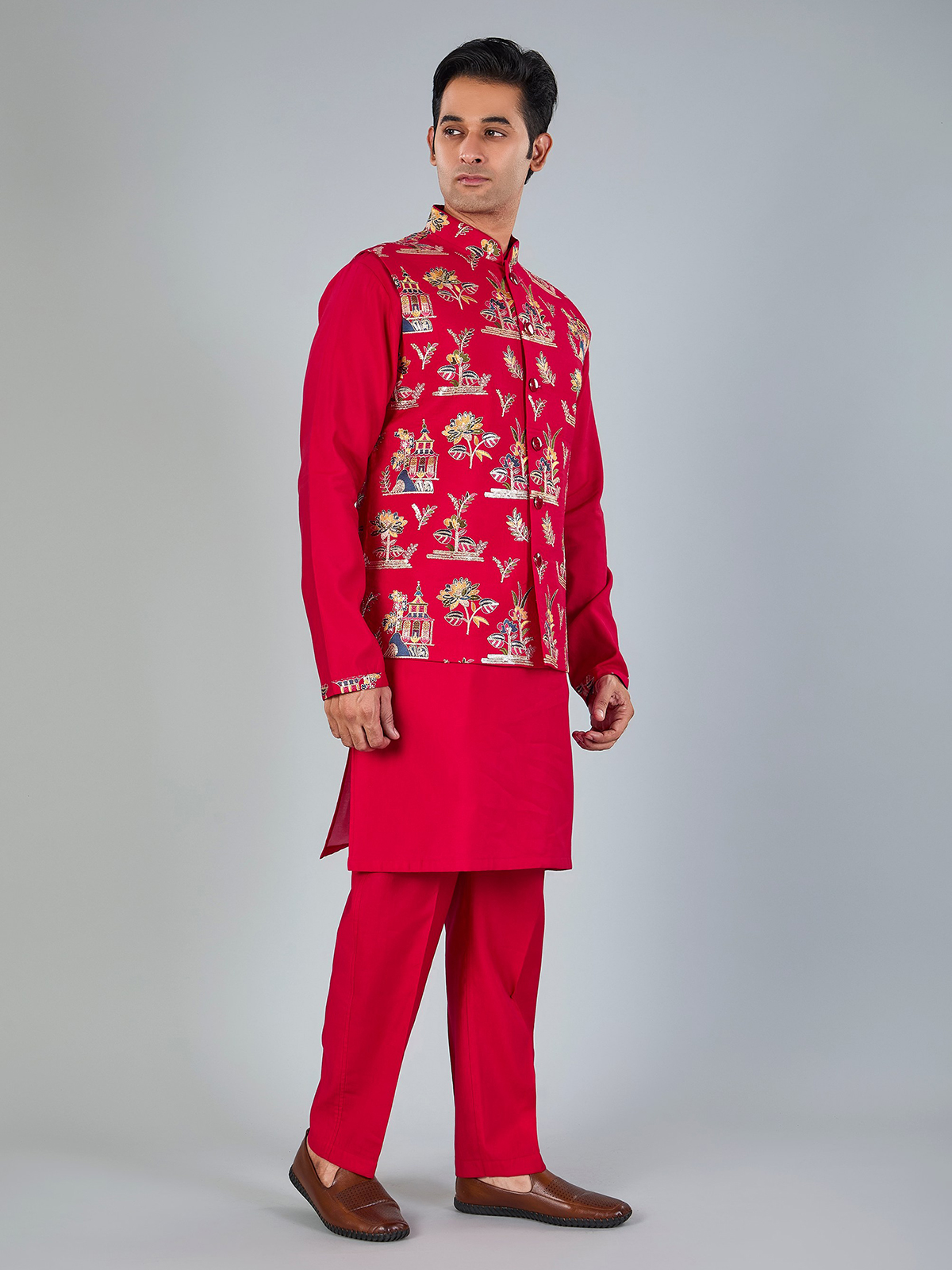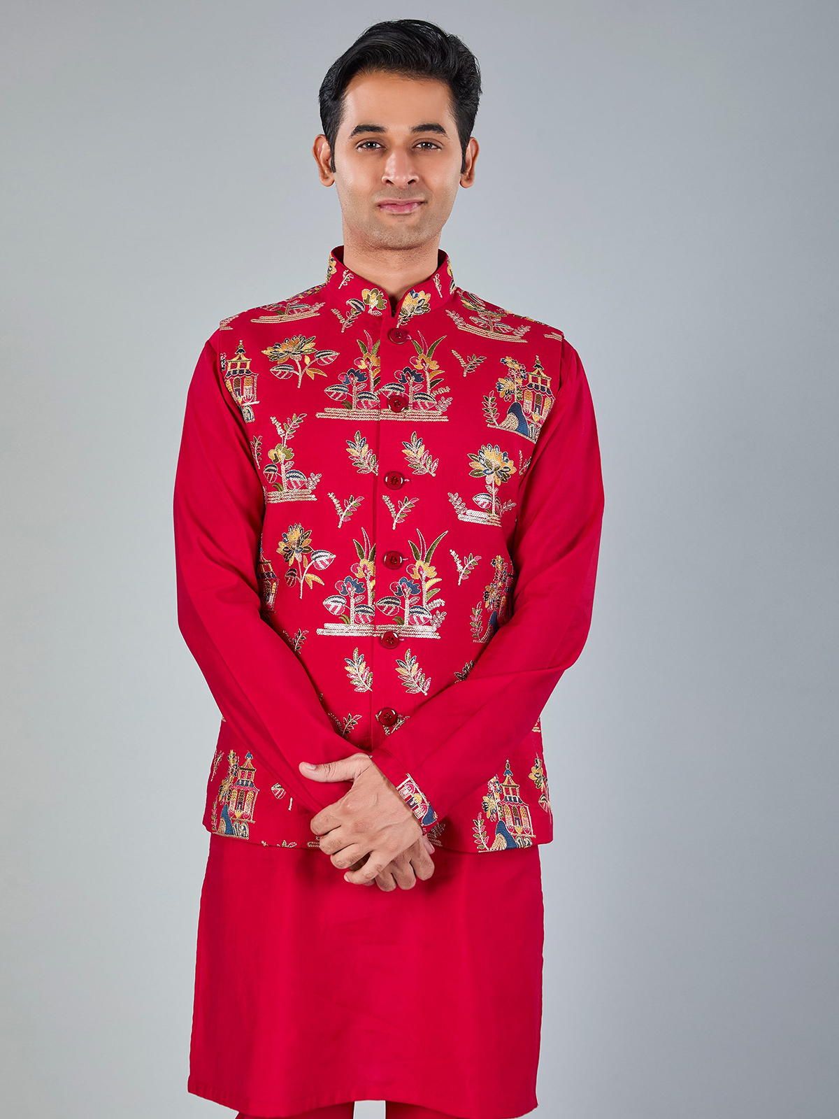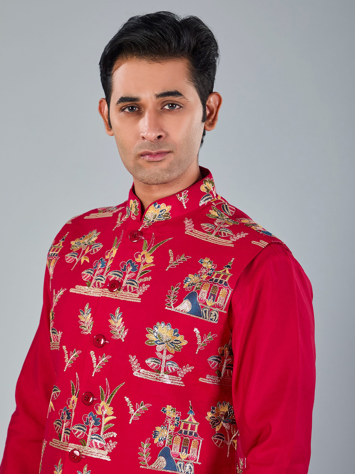 Vibrant magenta silk waistcoat beautifully detailed with embroidery and sequins for festive richness. Designed with a Chinese collar and coordinated pant, it makes a striking choice for weddings and celebratory occasions.
