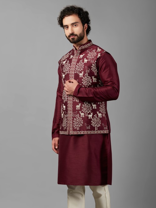 Maximize comfort and style with our maroon silk waistcoat set, designed with exquisite embroidery work. Comes with a bottom, it offers a sophisticated addition to your wardrobe.