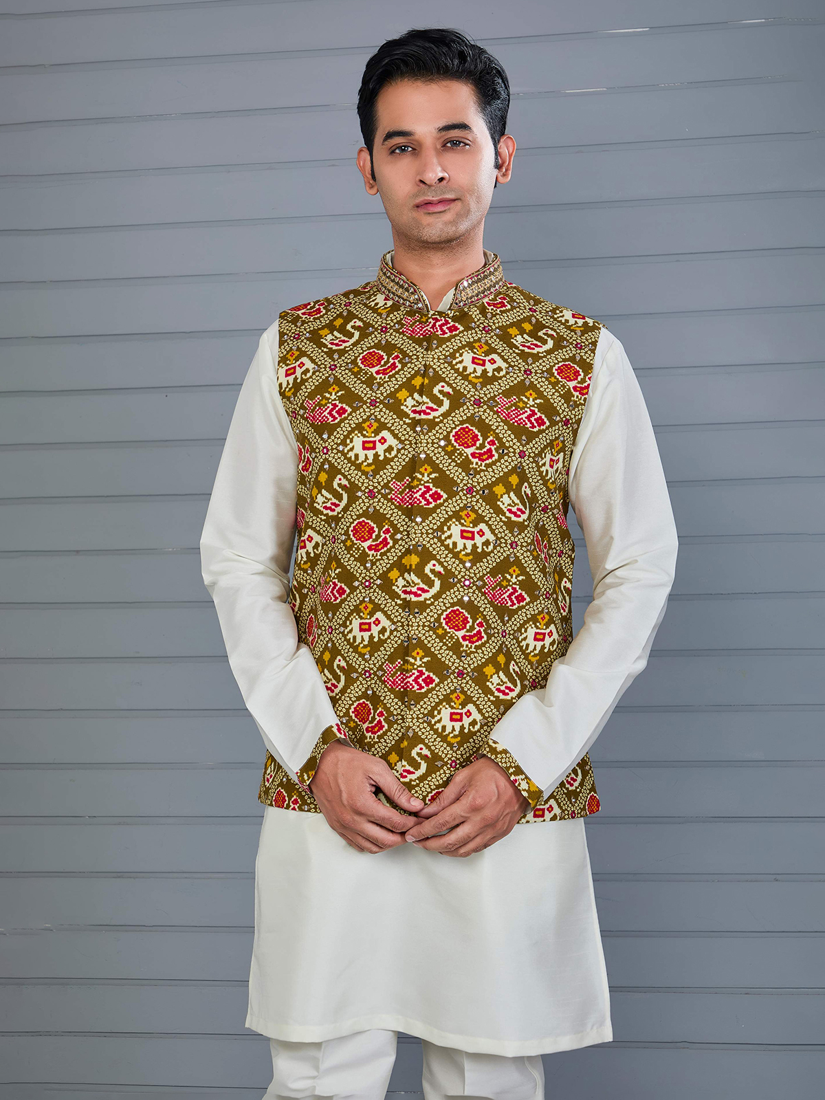 This mehendi green silk waistcoat features traditional bandhej prints enriched with delicate aabla accents. Finished with a Chinese collar and matched with a classic pant, it brings graceful ethnic charm to weddings, festive gatherings and mehendi celebrations.