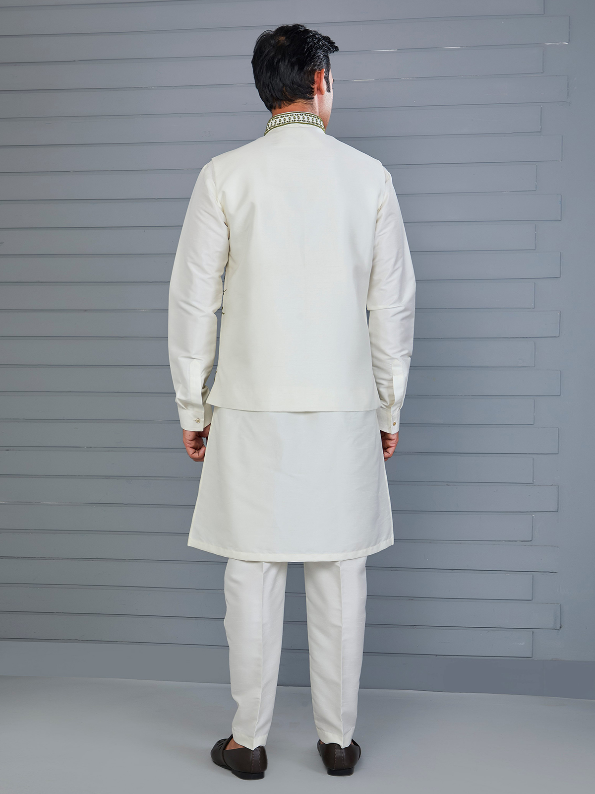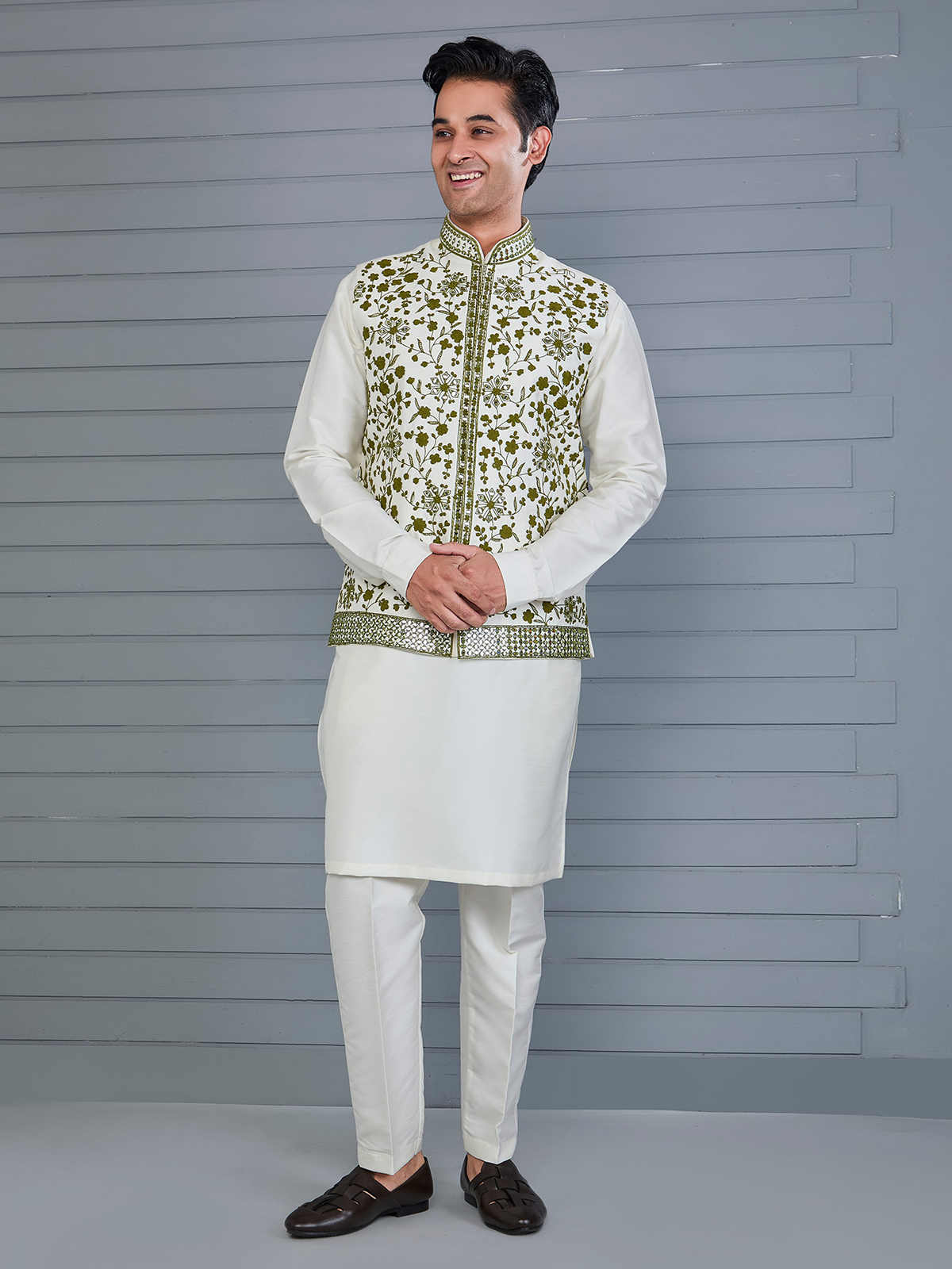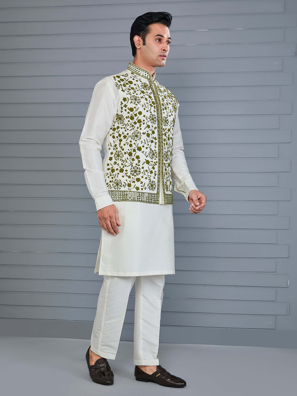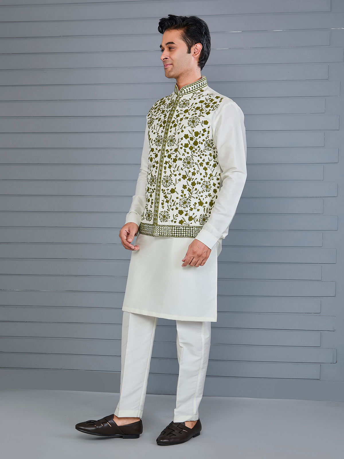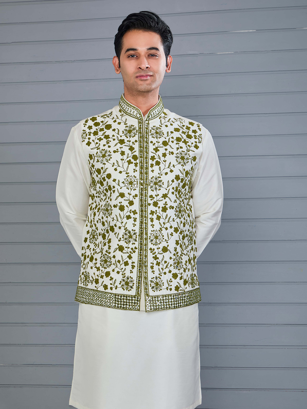 Rich mehendi green and off-white silk waistcoat detailed with intricate embroidery and aabla work. Styled with a Chinese collar and paired with a coordinated pant, it offers classic ethnic sophistication for weddings and receptions.