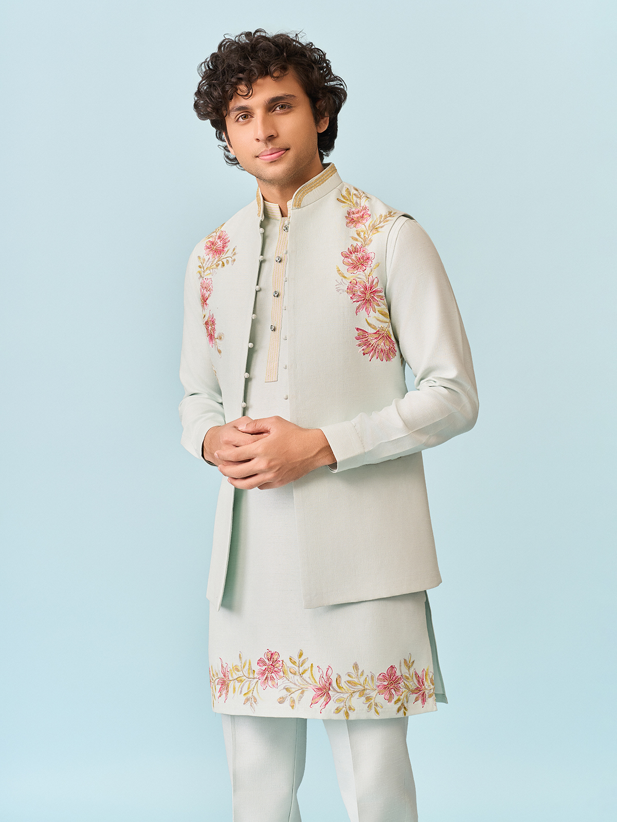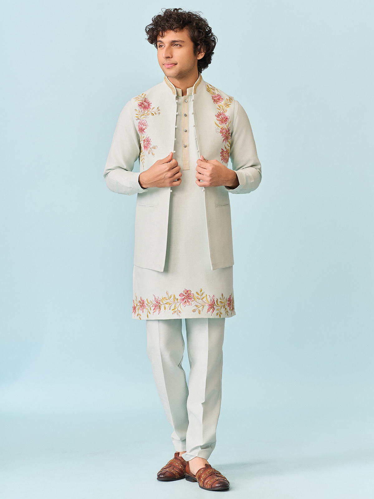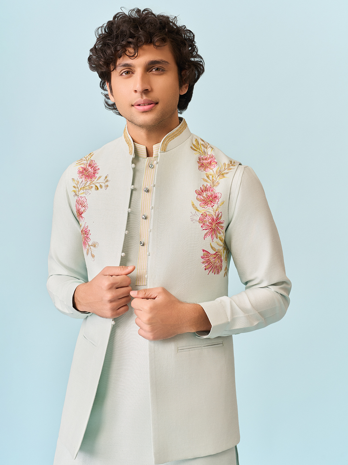 This charming mens waistcoat set in a soft mint blue color is crafted from luxurious silk, featuring a vibrant multi-coloured hand-printed flower design. adorned with delicate cutdana and zari work, this ensemble is a perfect choice for festive celebrations. the kurta's hem showcases a matching hand-printed pattern, while the waistcoat collar is beautifully embellished with cutdana detailing. this set includes a fashionable waistcoat, a stunning kurta, and coordinating pants, making it a must-have for your ethnic collection.